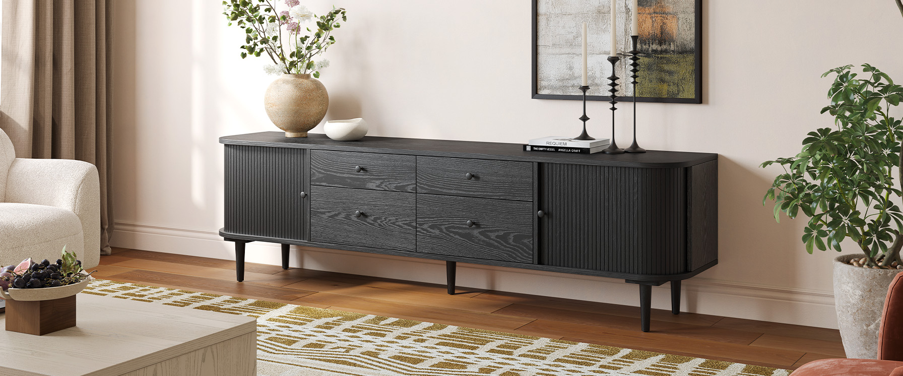 At the center of it all is a thoughtfully chosen media console. More than just a place for your TV, it anchors the room visually, organizes everyday essentials, and sets the tone for your overall living room style.