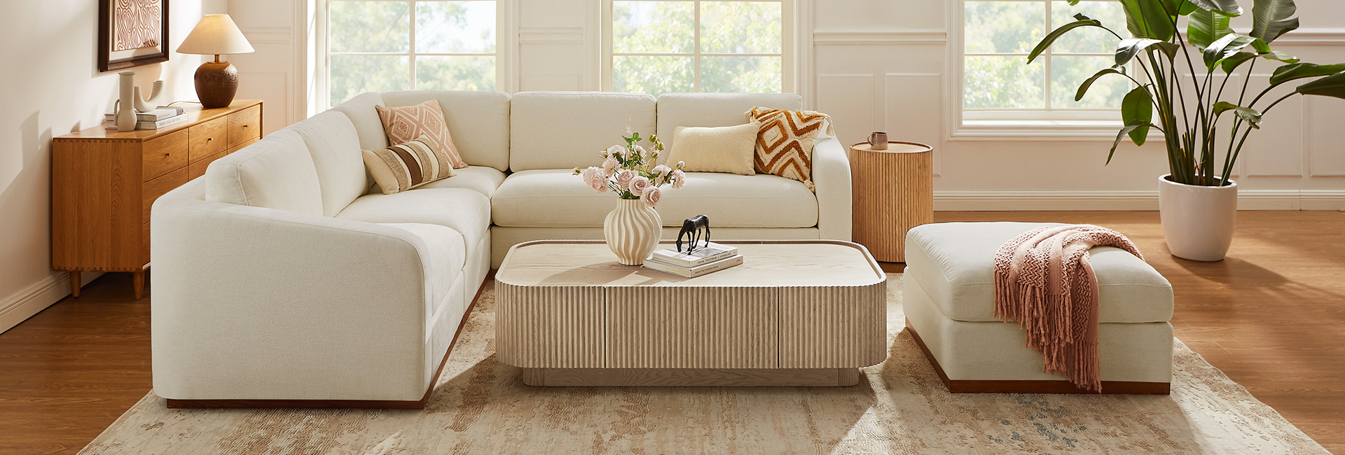 HERNEST's sectional sofa collection, Skimra Oak Coffee Table, and Rolf Fluted Solid Oak Side Table