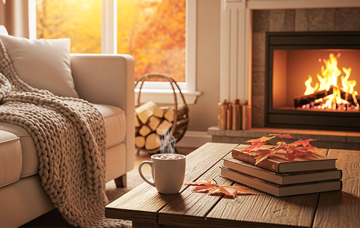 Warm up your home this fall with HERNEST's top picks: Magnus Lift-Top Coffee Table, Ragnar Sideboard, Ursula Chairs, Sabina Vanity & Pumpkin Wall Art.