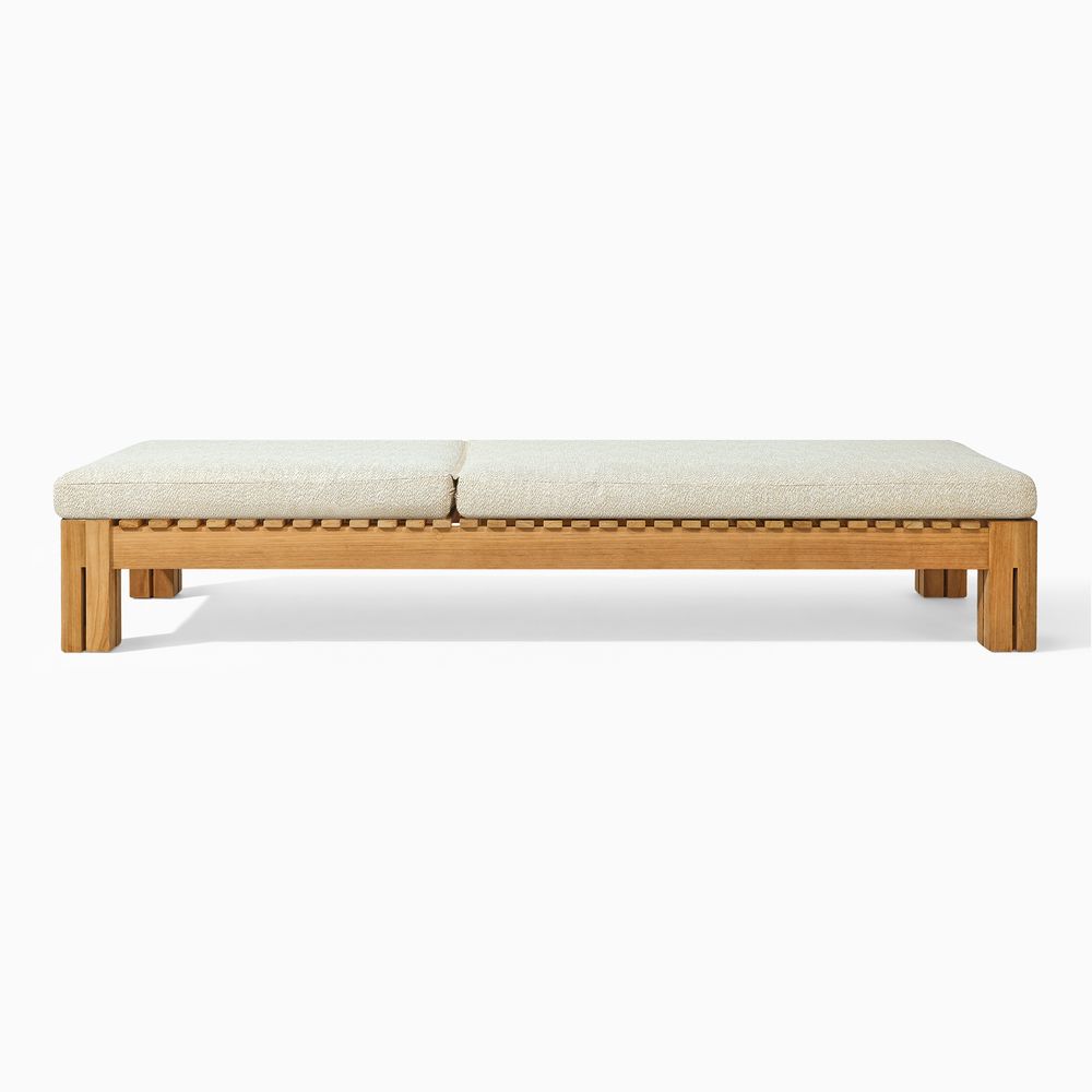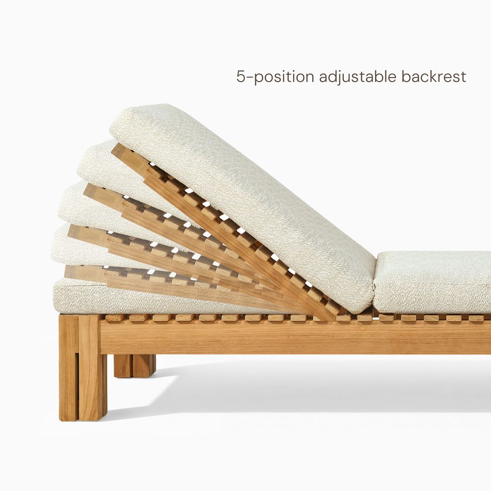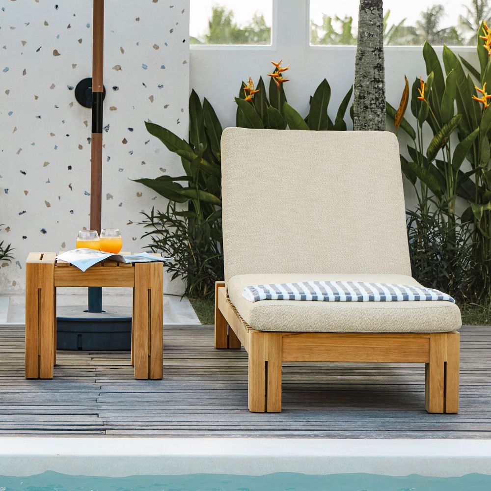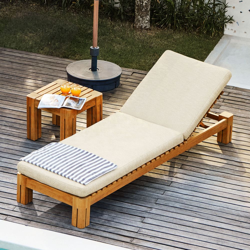 Set consists of 1 chaise lounge and 1 side tableCrafted of Grade-AB, FSC-certified Indonesian teak wood, chosen for its natural beauty, durability, and responsible origins.Expertly sanded to an ultra-smooth, silky finish—uncoated, so the natural beauty of pure teak shines through. Teak is kiln-dried for added durability.Crafted with precision tenon-mortised joinery for superior sturdiness and weight-bearing strength.Includes threaded leveling feet for stability on uneven surfaces.Removable cushions feature high-resiliency foam wrapped in soft, easy-care recycled polyester.Cushions secure with Velcro to stay in place on windy days.