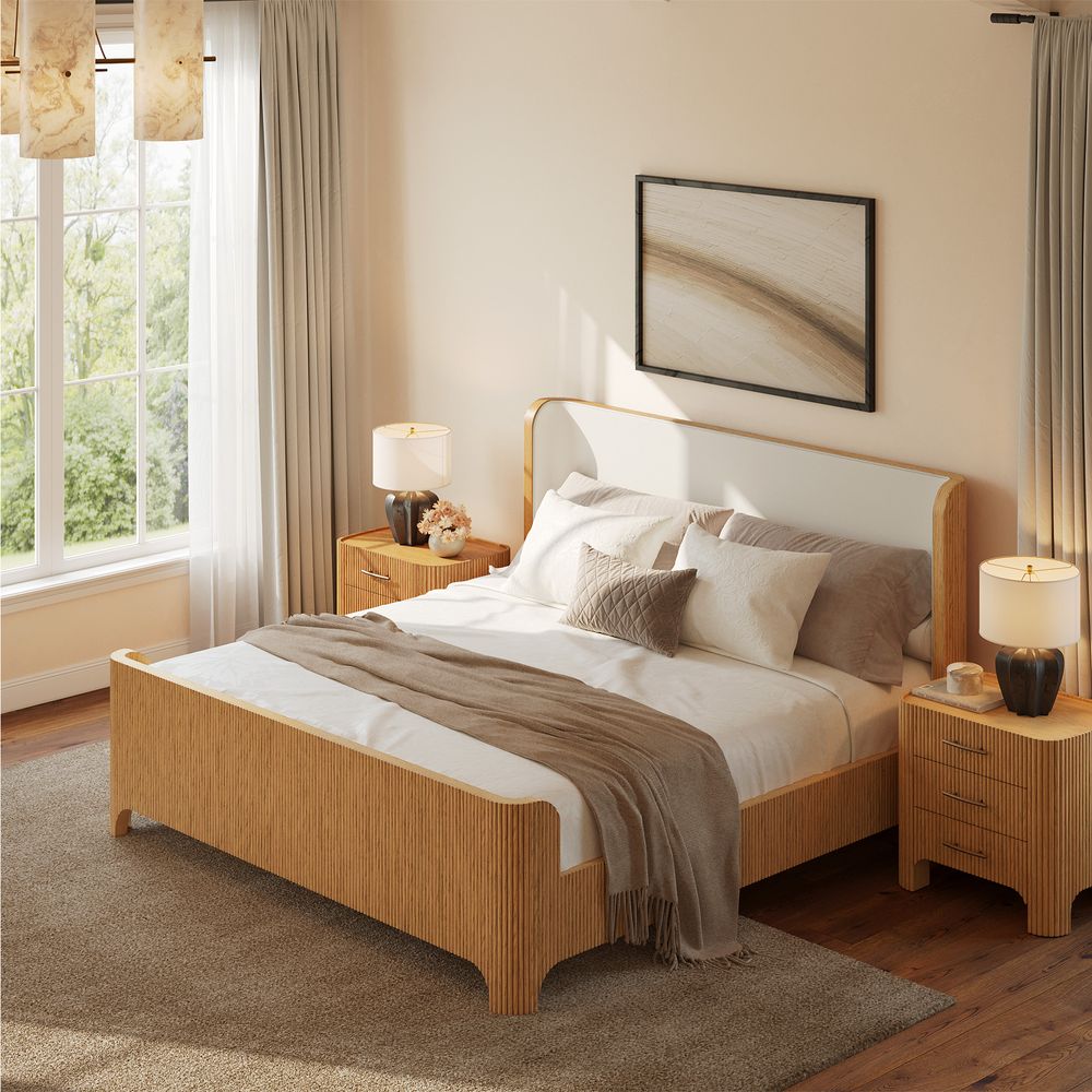 Set consists of 1 king size bed and 2 nightstands.Crafted of American solid oak and engineered wood with oak veneers.All wood is kiln-dried for added durability.Finish is achieved through multistep process in which wood is wire brushed to highlight its rich grain.Wood glazing adds visual interest with greater depth and layering and enhances coloring.Solid wood fluting presents a natural texture.Include 6 middle support legs.Bed accommodates most standard mattresses, box spring optional, supporting up to 800 lbs.Color perception may vary due to wood characteristics, lighting, and devices. Wood grain variation is expected, as each is unique.