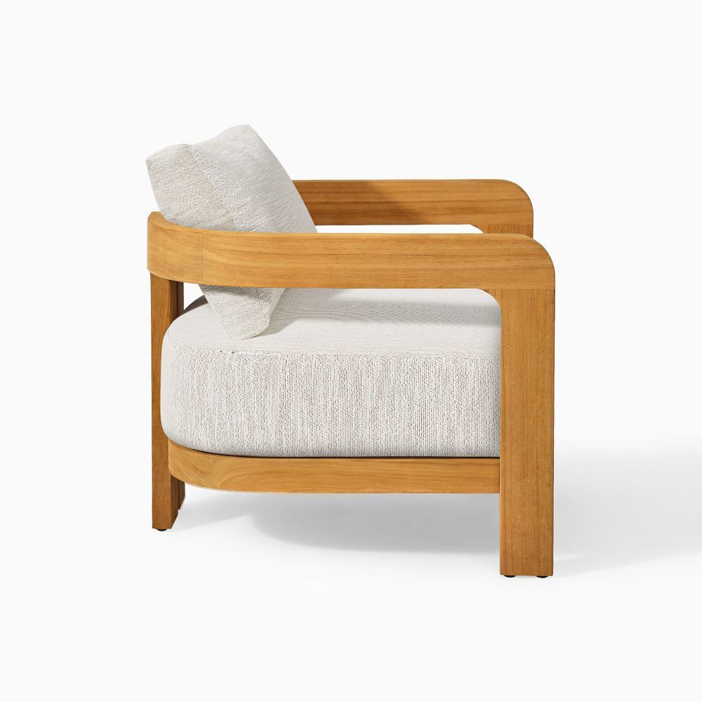 The solid wood frame features a tripod structure, where two softly curved, porch-shaped frames are bridged by solid beams, creating a design that feels poised in form yet nimble in style. Crafted from FSC-certified teak wood, each piece is made to last over time, naturally developing richer tones and a unique patina through everyday use.