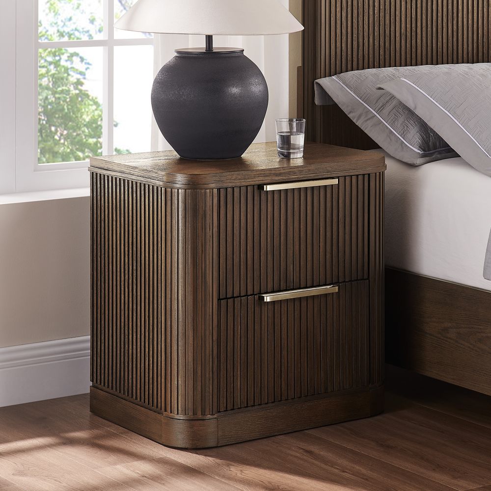 Finnley bedroom collection artfully merges modern sophistication with vintage maximalist charm. Crafted from rich poplar wood veneer and a poplar wood frame, it provides lasting durability and timeless elegance. Featuring a striking vertical fluted design, this refined collection enhances any space with a harmonious blend of bold style and meticulous craftsmanship.