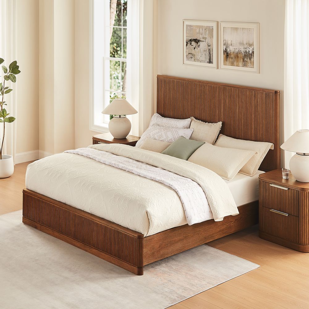 Finnley bedroom collection artfully merges modern sophistication with vintage maximalist charm. Crafted from rich poplar wood veneer and a poplar wood frame, it provides lasting durability and timeless elegance. Featuring a striking vertical fluted design, this refined collection enhances any space with a harmonious blend of bold style and meticulous craftsmanship.