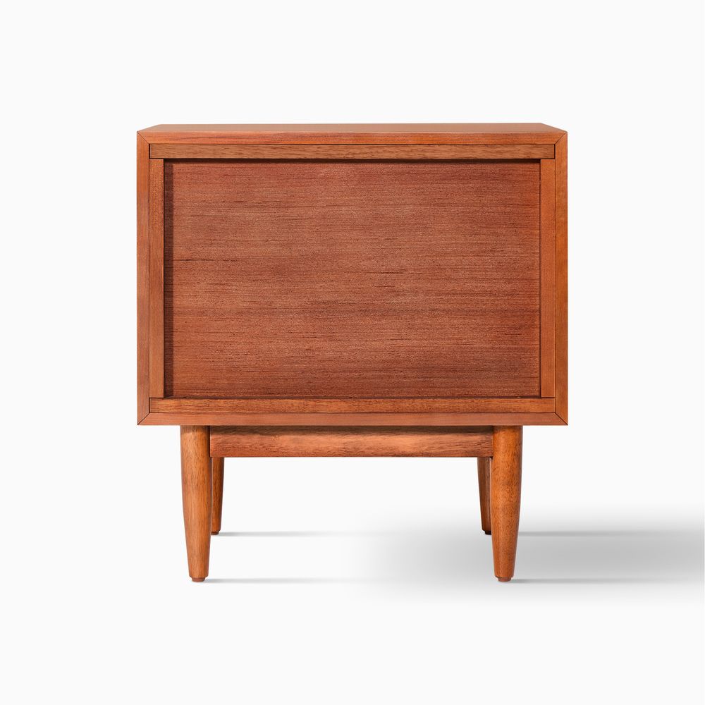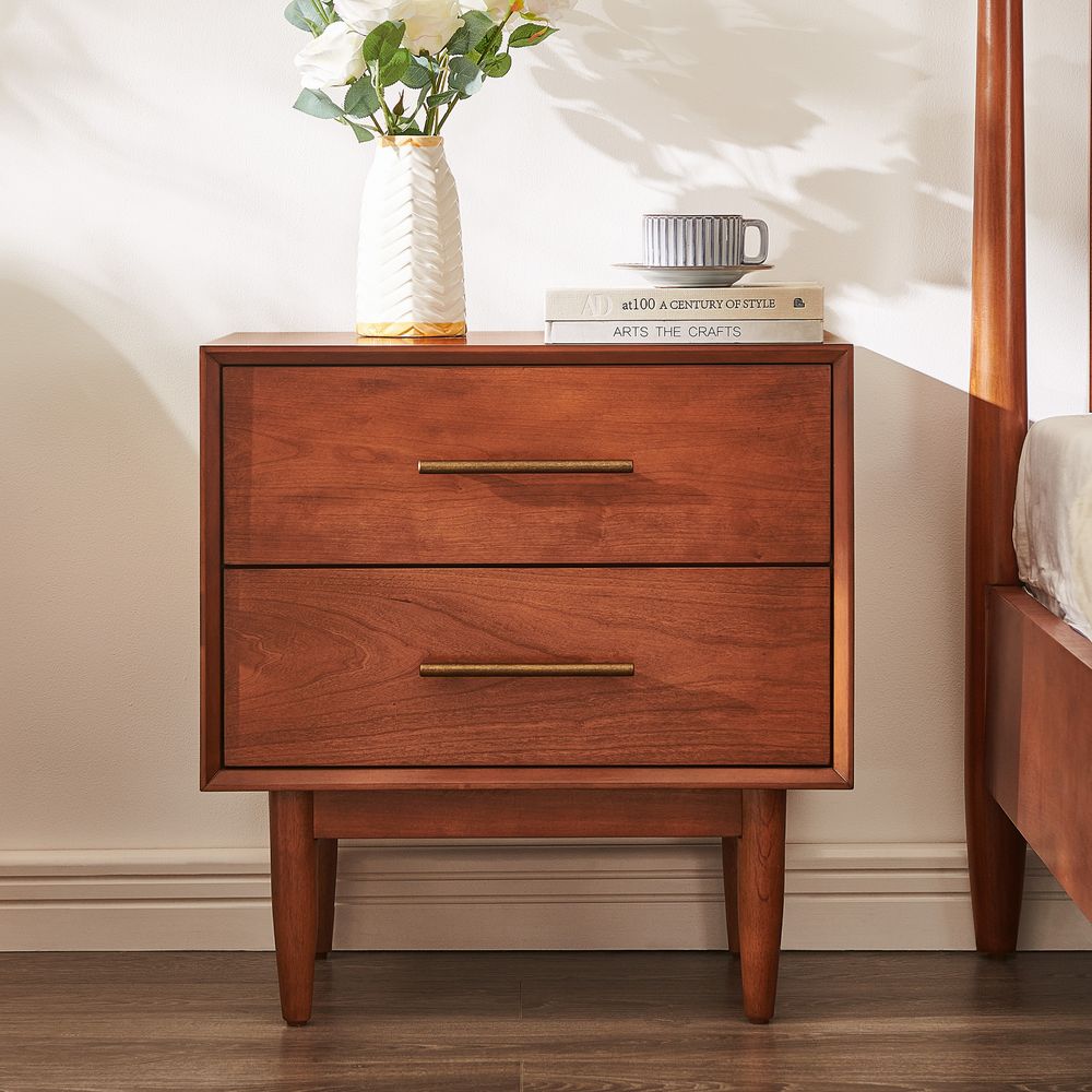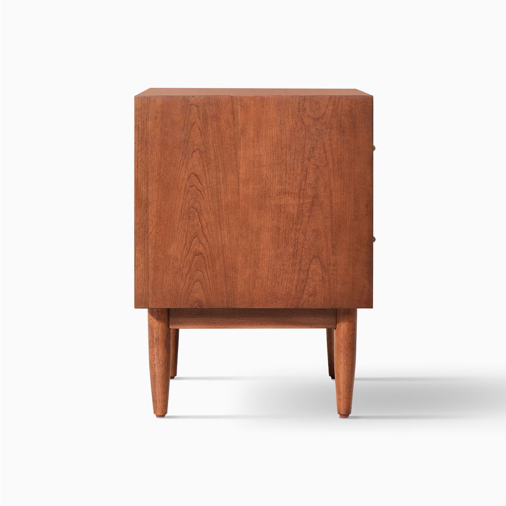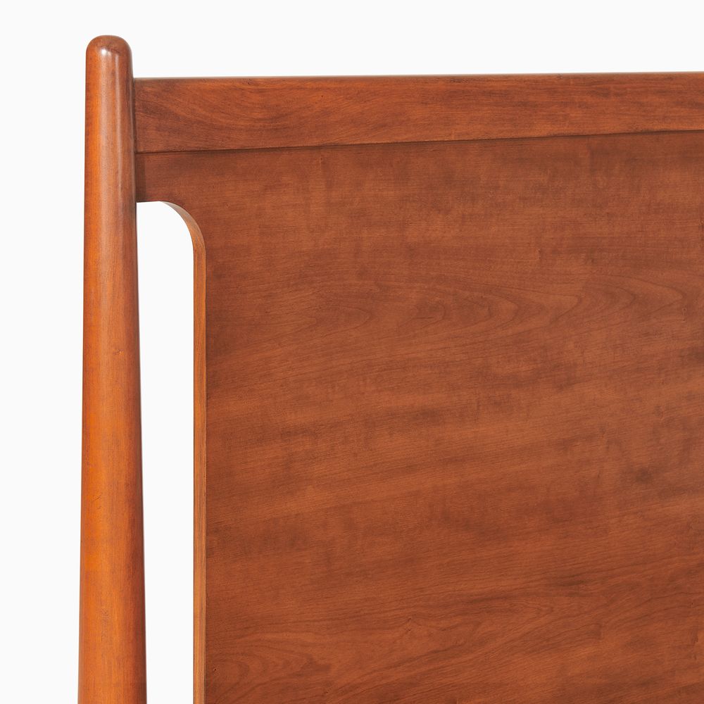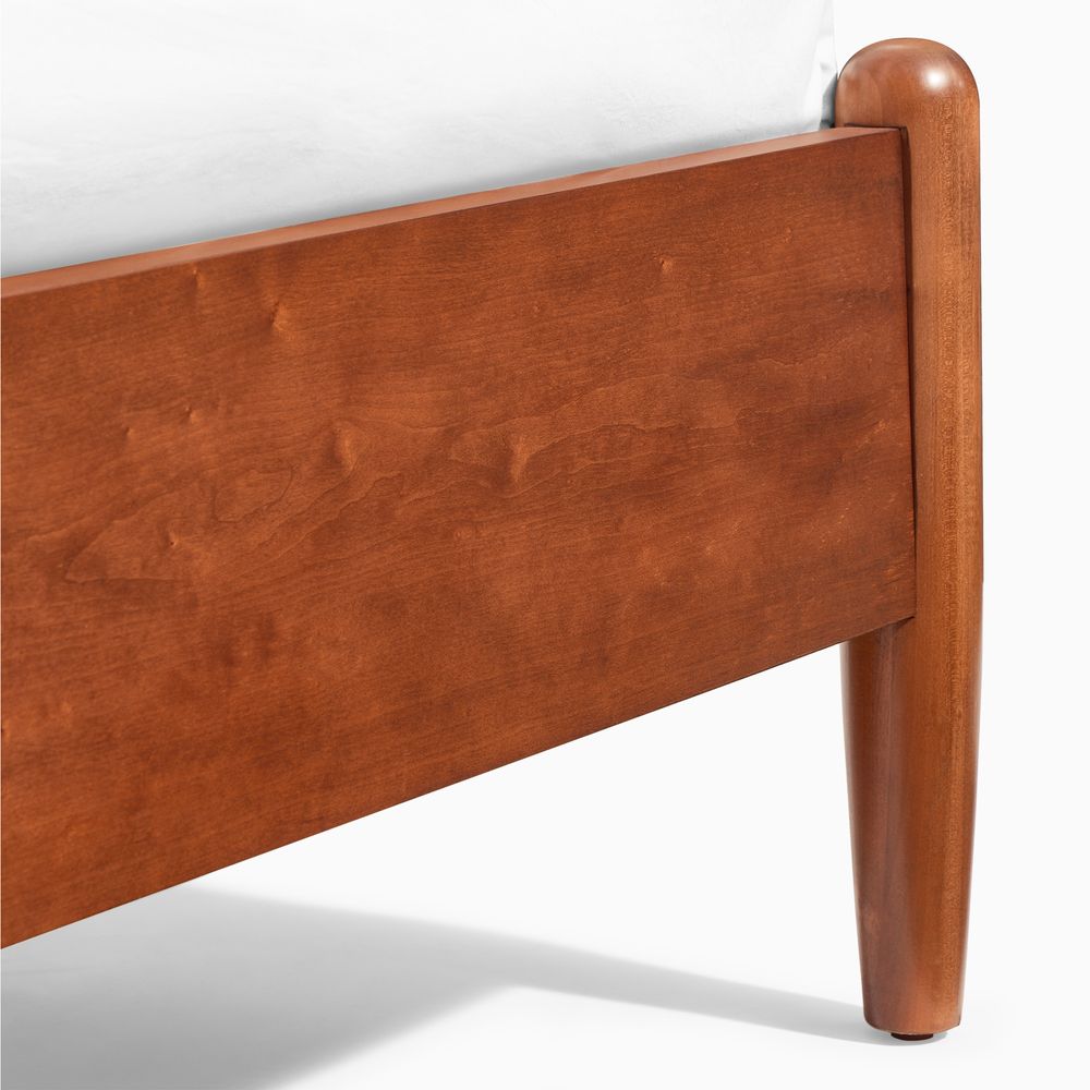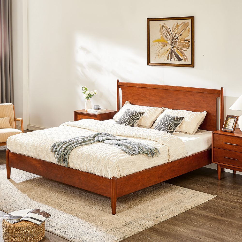 A well-matched set designed for a Mid-Century Modern bedroom, this bed frame pairs effortlessly with two nightstands. Clean lines, classic tapered wood legs, and a warm, nostalgic tone give the collection a light, airy presence, making it easy to layer with varied textures for a cozy, inviting bedroom.