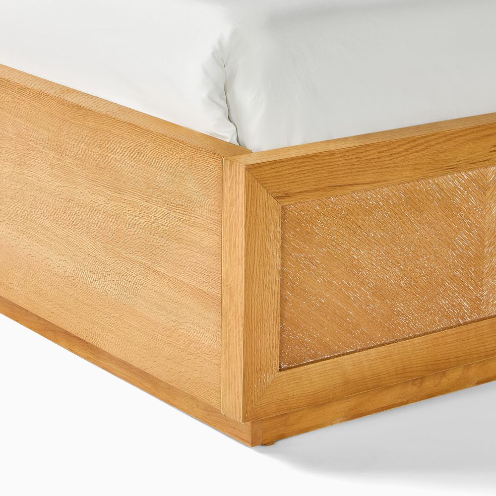 Set consists of 1 queen size bed and 2 nightstands.Crafted of American solid oak and engineered wood with oak veneers.All wood is kiln-dried for added durability.Finish is achieved through multistep process in which wood is wire brushed to highlight its rich grain.Wood glazing adds visual interest with greater depth and layering and enhances coloring.Drawers are crafted with precision dovetail joints for superior sturdiness and weight-bearing strength.Solid wood blocks are used at structural joints for reinforcement.Bed accommodates most standard mattresses, box spring required, supporting up to 800 lbs.Color perception may vary due to wood characteristics, lighting, and devices. Wood grain variation is expected, as each is unique.
