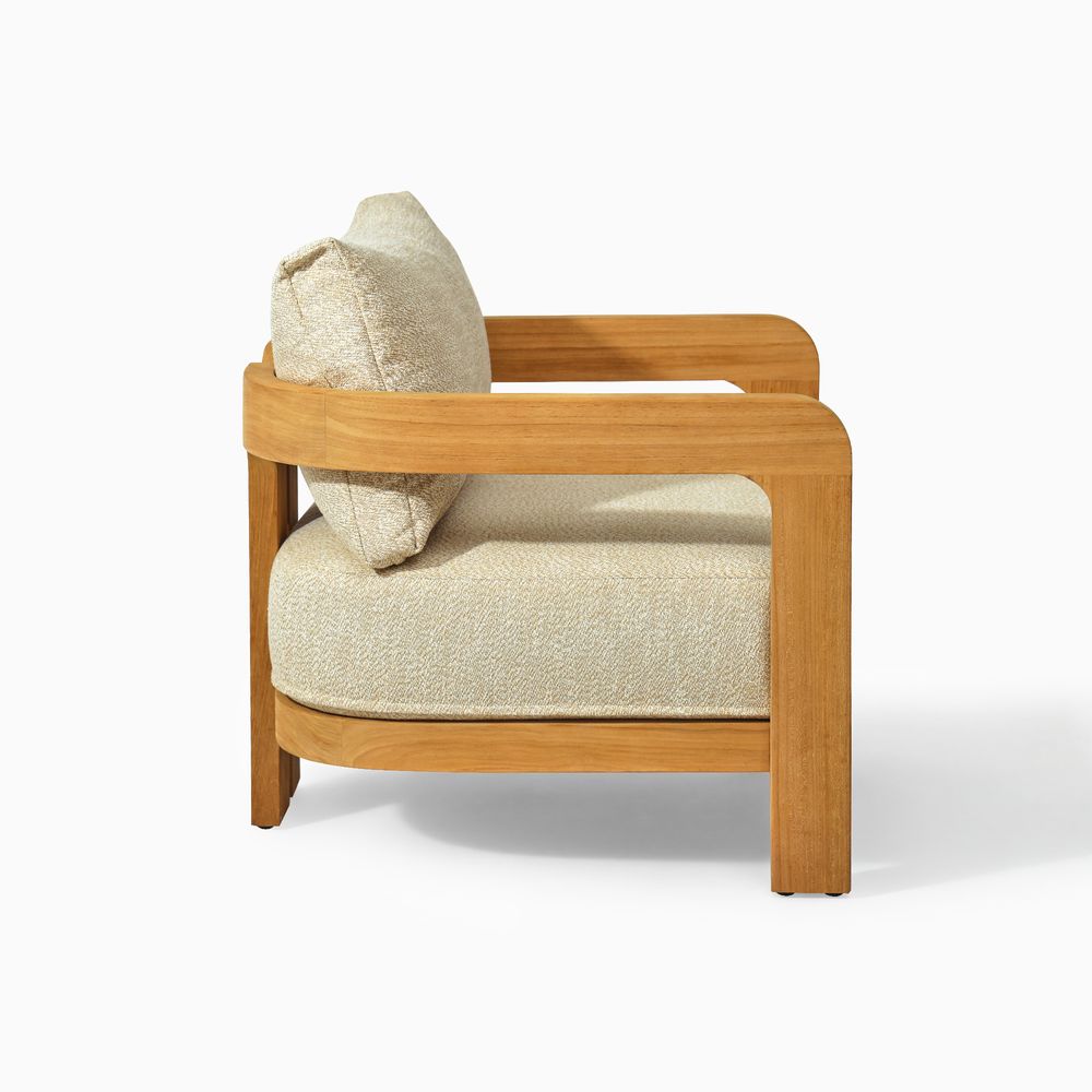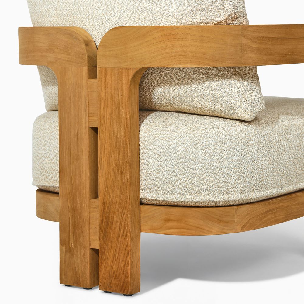 The solid wood frame features a tripod structure, where two softly curved, porch-shaped frames are bridged by solid beams, creating a design that feels poised in form yet nimble in style. Crafted from FSC-certified teak wood, each piece is made to last over time, naturally developing richer tones and a unique patina through everyday use.