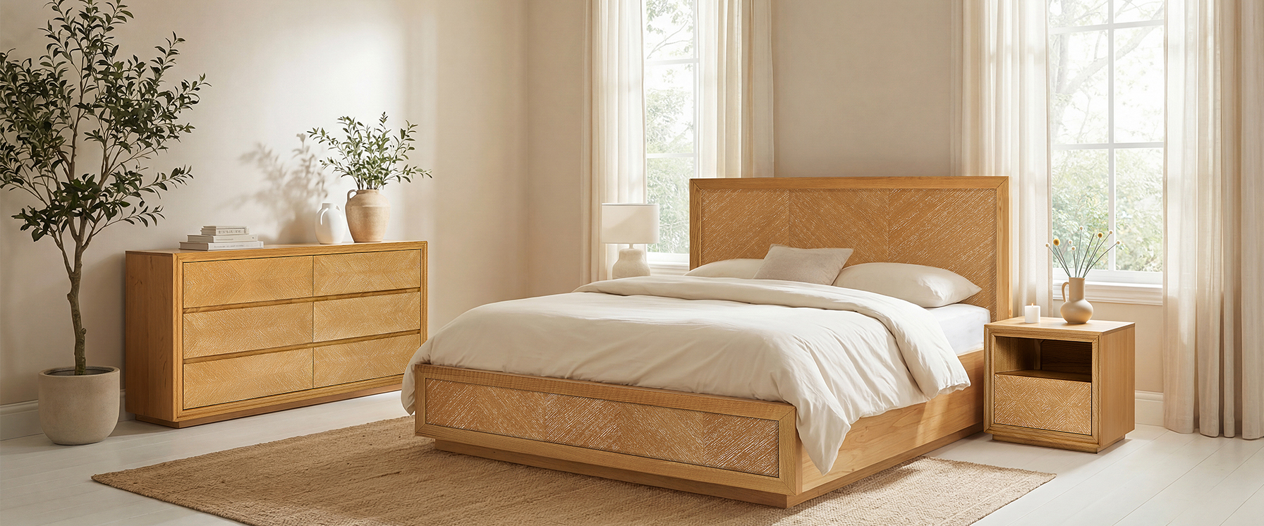Thursen is defined by an intricate parquet design, where wooden tiles reveal rich grain and subtle tonal variation. Angled carvings form a geometric pattern that adds depth and catches a soft luster under shifting light. Art-frame–like edges outline the form, while a recessed base introduces an architectural, vintage sensibility. Restrained yet rich in detail, Thursen offers quiet sophistication with lasting versatility.