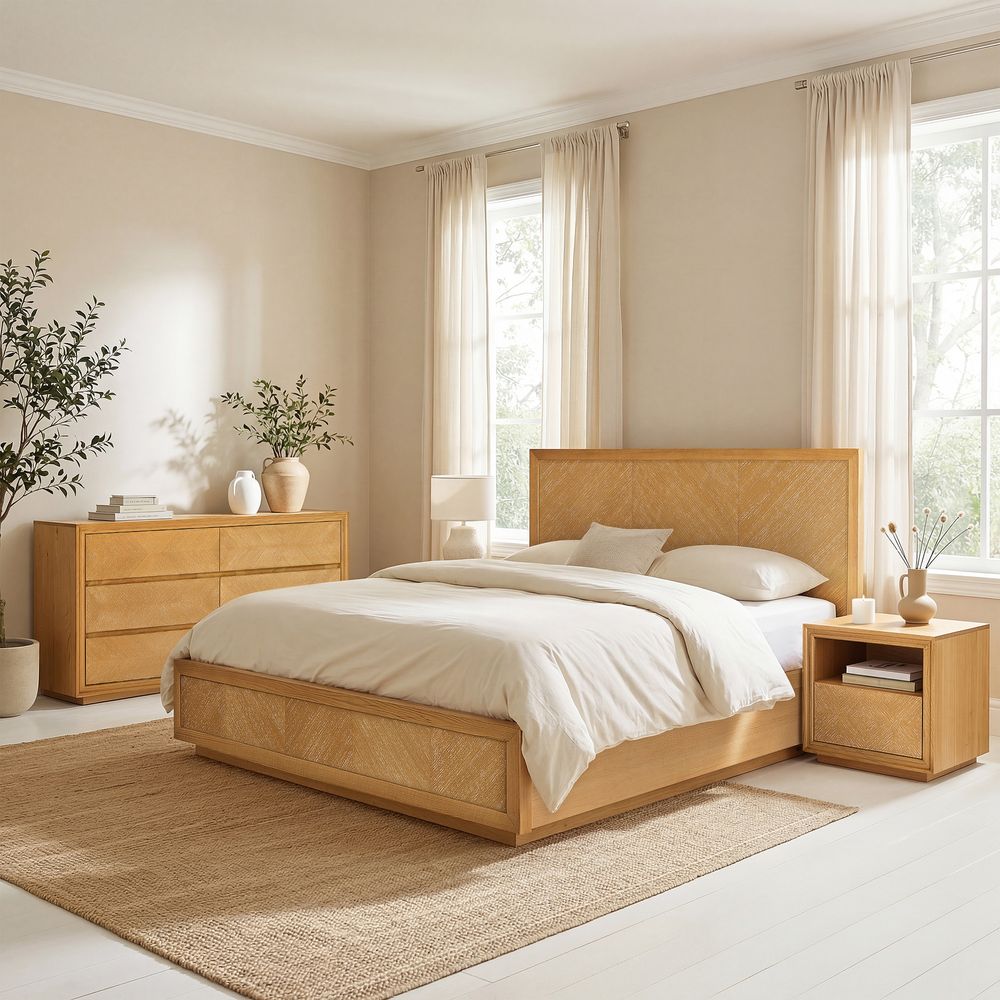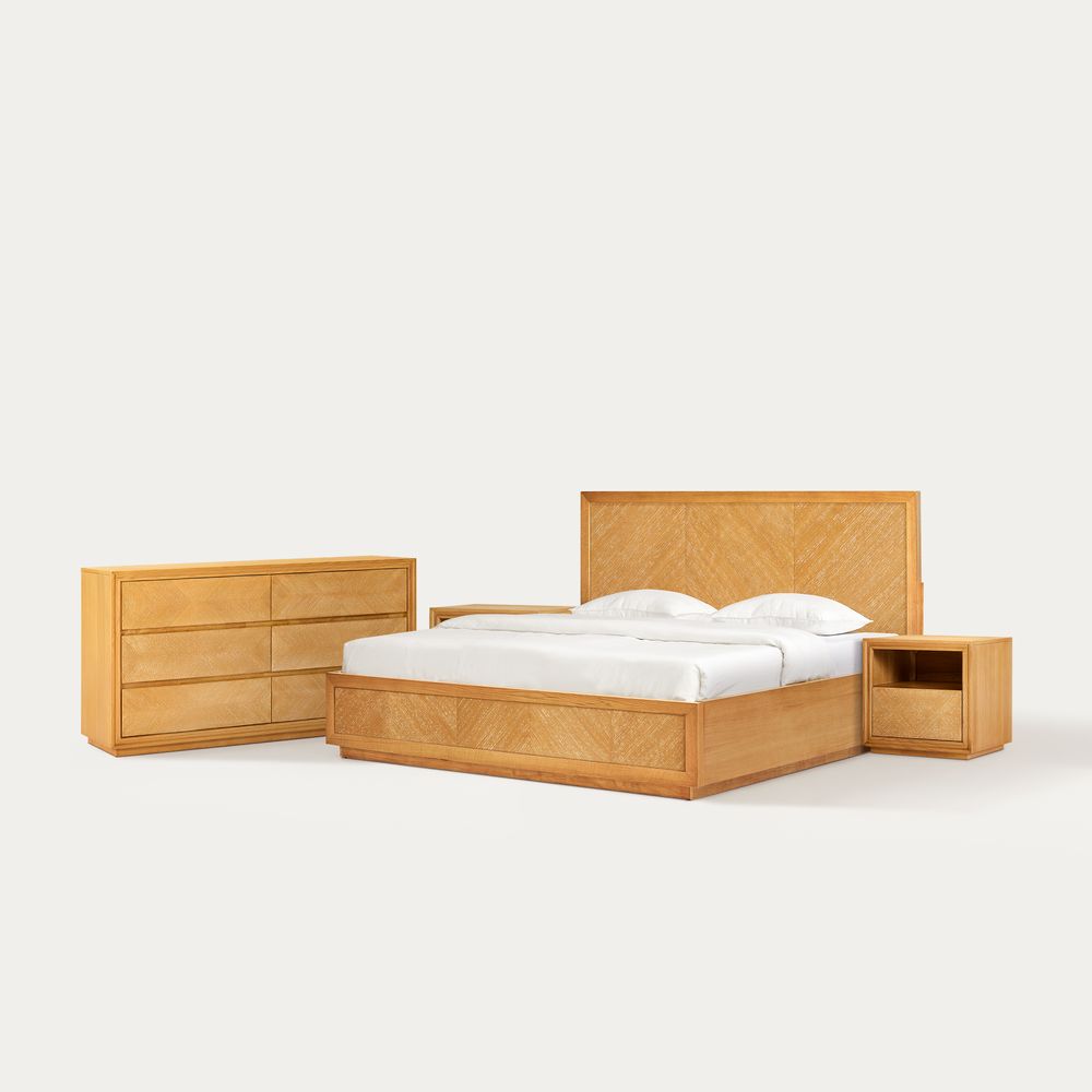 Set consists of 1 king size bed, 2 nightstands, and 1 dresser.Crafted of American solid oak and engineered wood with oak veneers.All wood is kiln-dried for added durability.Finish is achieved through multistep process in which wood is wire brushed to highlight its rich grain.Wood glazing adds visual interest with greater depth and layering and enhances coloring.Drawers are crafted with precision dovetail joints for superior sturdiness and weight-bearing strength.Solid wood blocks are used at structural joints for reinforcement.Bed accommodates most standard mattresses, box spring required, supporting up to 800 lbs.Color perception may vary due to wood characteristics, lighting, and devices. Wood grain variation is expected, as each is unique.