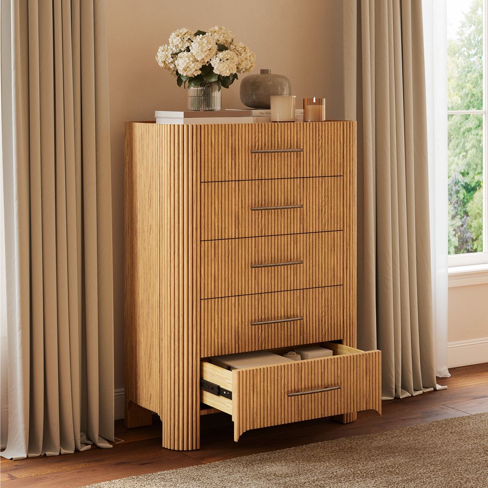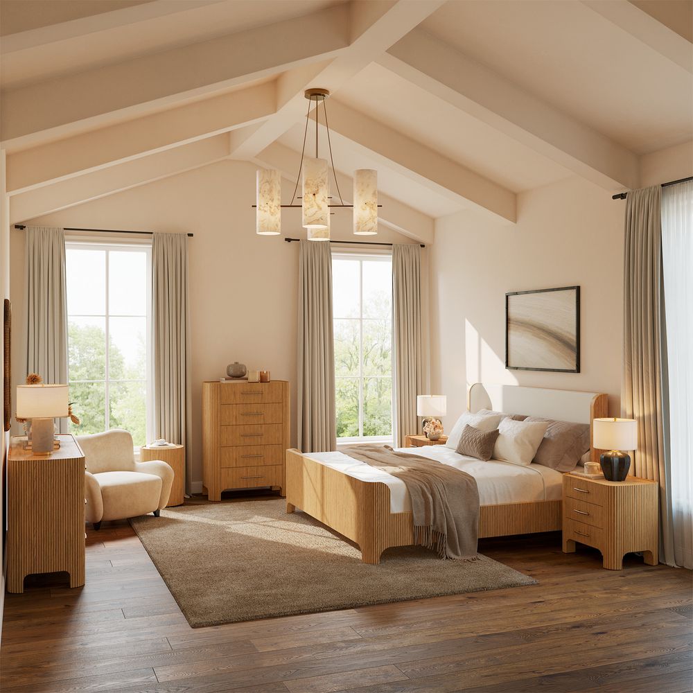 Set consists of 1 king size bed, 2 nightstands, 1 chest and 1 dresser.Crafted of American solid oak and engineered wood with oak veneers.All wood is kiln-dried for added durability.Finish is achieved through multistep process in which wood is wire brushed to highlight its rich grain.Wood glazing adds visual interest with greater depth and layering and enhances coloring.Solid wood fluting presents a natural texture.Include 6 middle support legs.Bed accommodates most standard mattresses, box spring optional, supporting up to 800 lbs.Color perception may vary due to wood characteristics, lighting, and devices. Wood grain variation is expected, as each is unique.