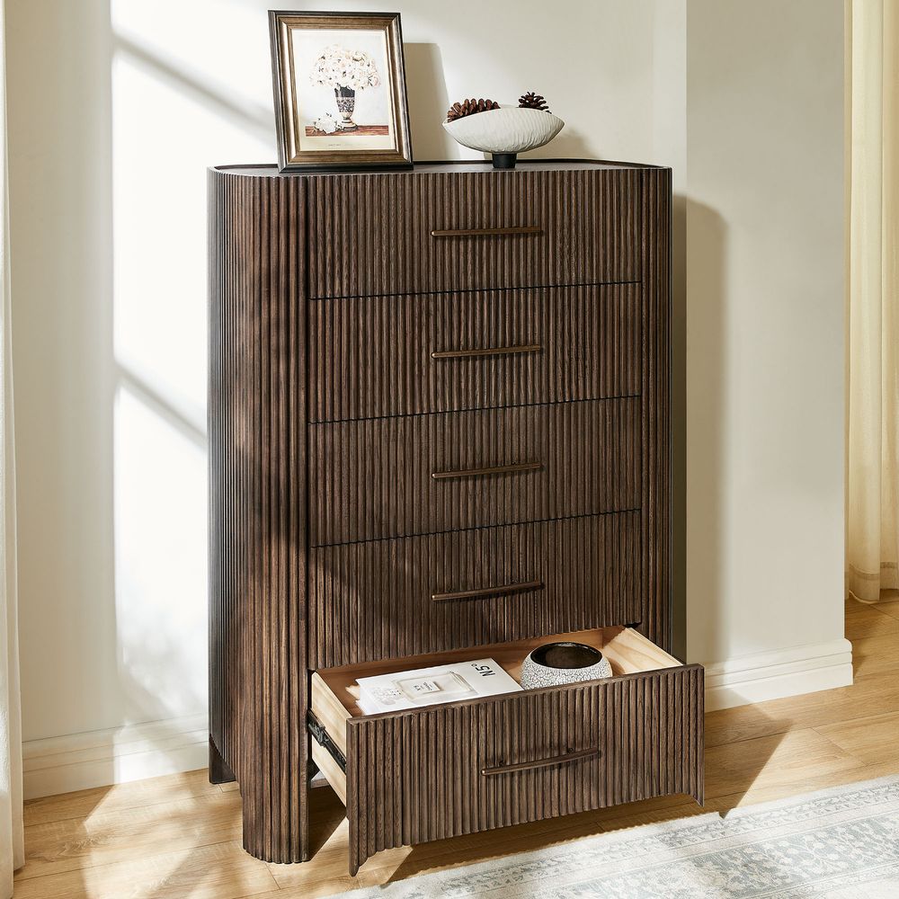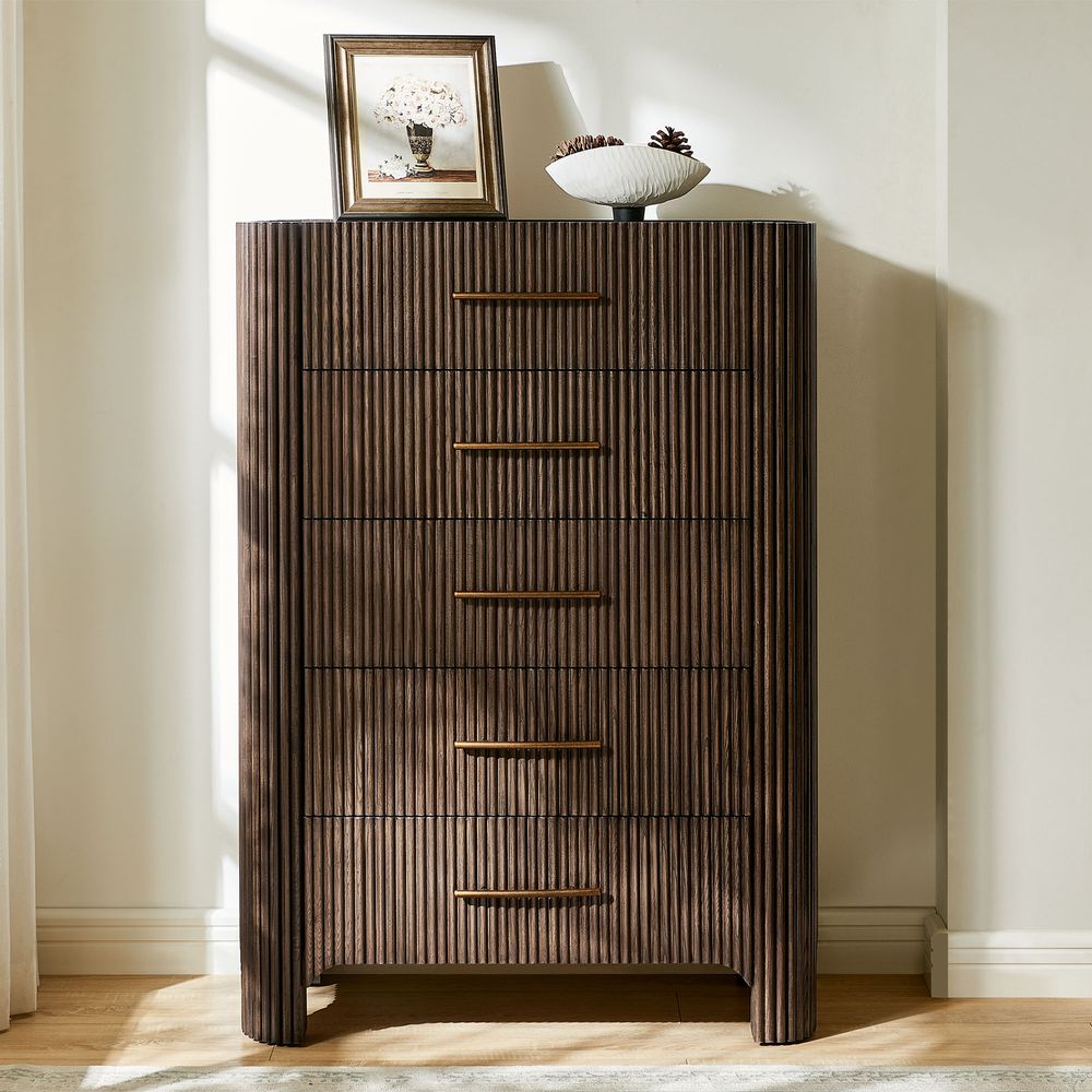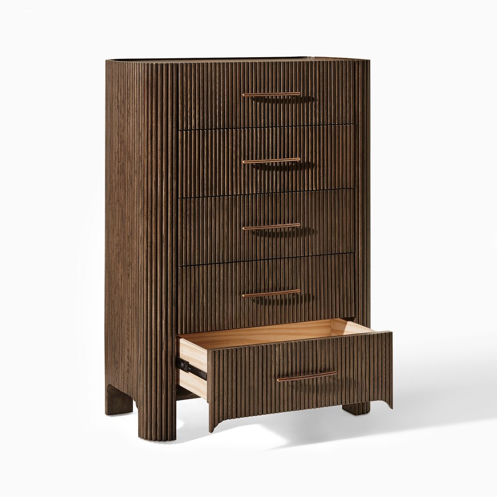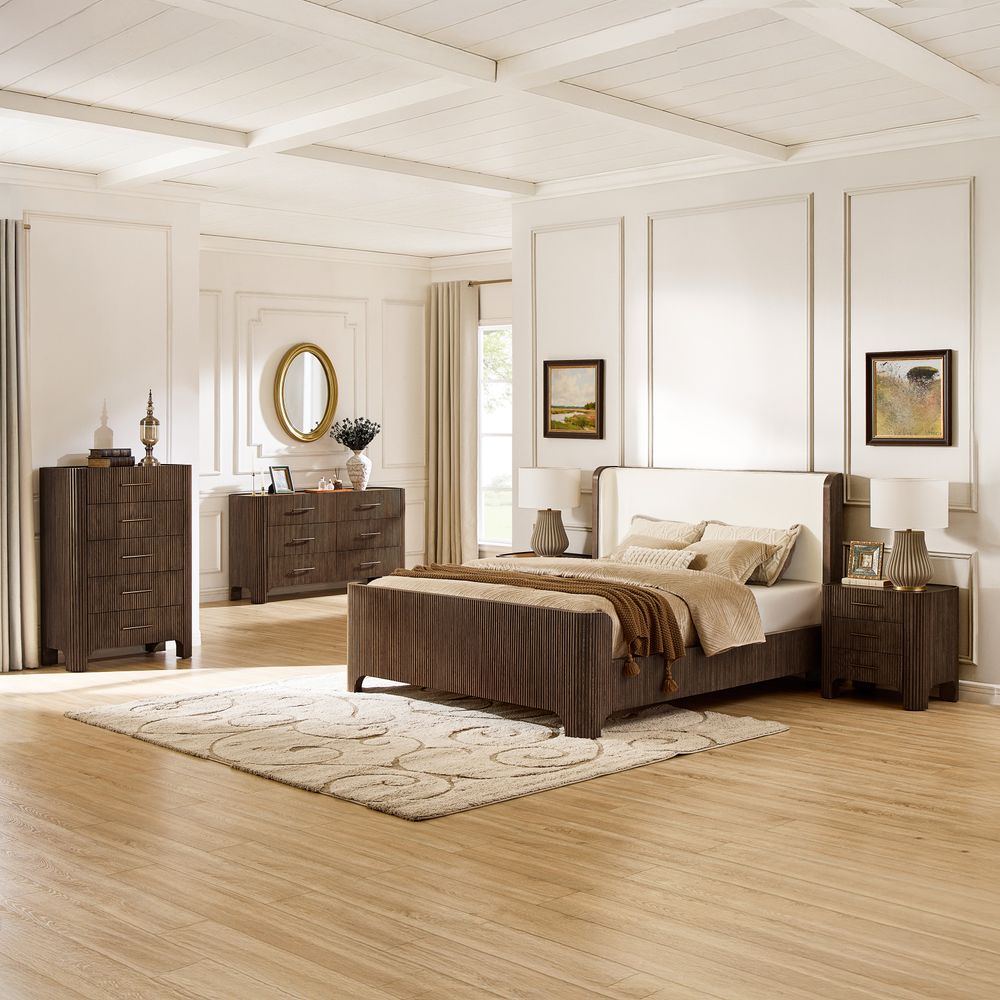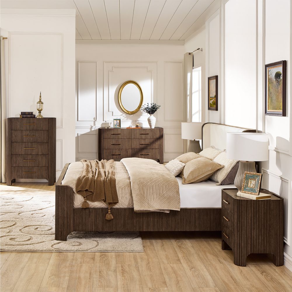 Set consists of 1 queen size bed, 2 nightstands, 1 chest and 1 dresser.Crafted of American solid oak and engineered wood with oak veneers.All wood is kiln-dried for added durability.Finish is achieved through multistep process in which wood is wire brushed to highlight its rich grain.Wood glazing adds visual interest with greater depth and layering and enhances coloring.Solid wood fluting presents a natural texture.Include 6 middle support legs.Bed accommodates most standard mattresses, box spring optional, supporting up to 800 lbs.Color perception may vary due to wood characteristics, lighting, and devices. Wood grain variation is expected, as each is unique.