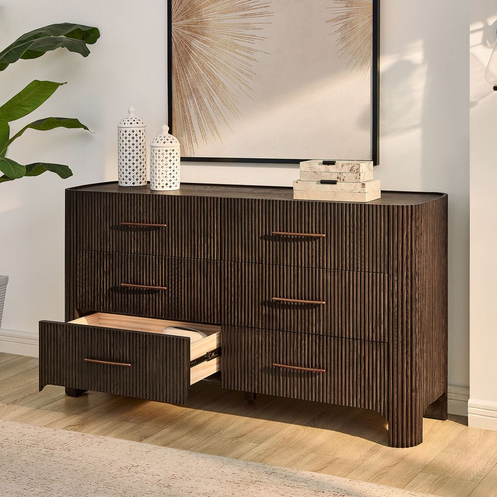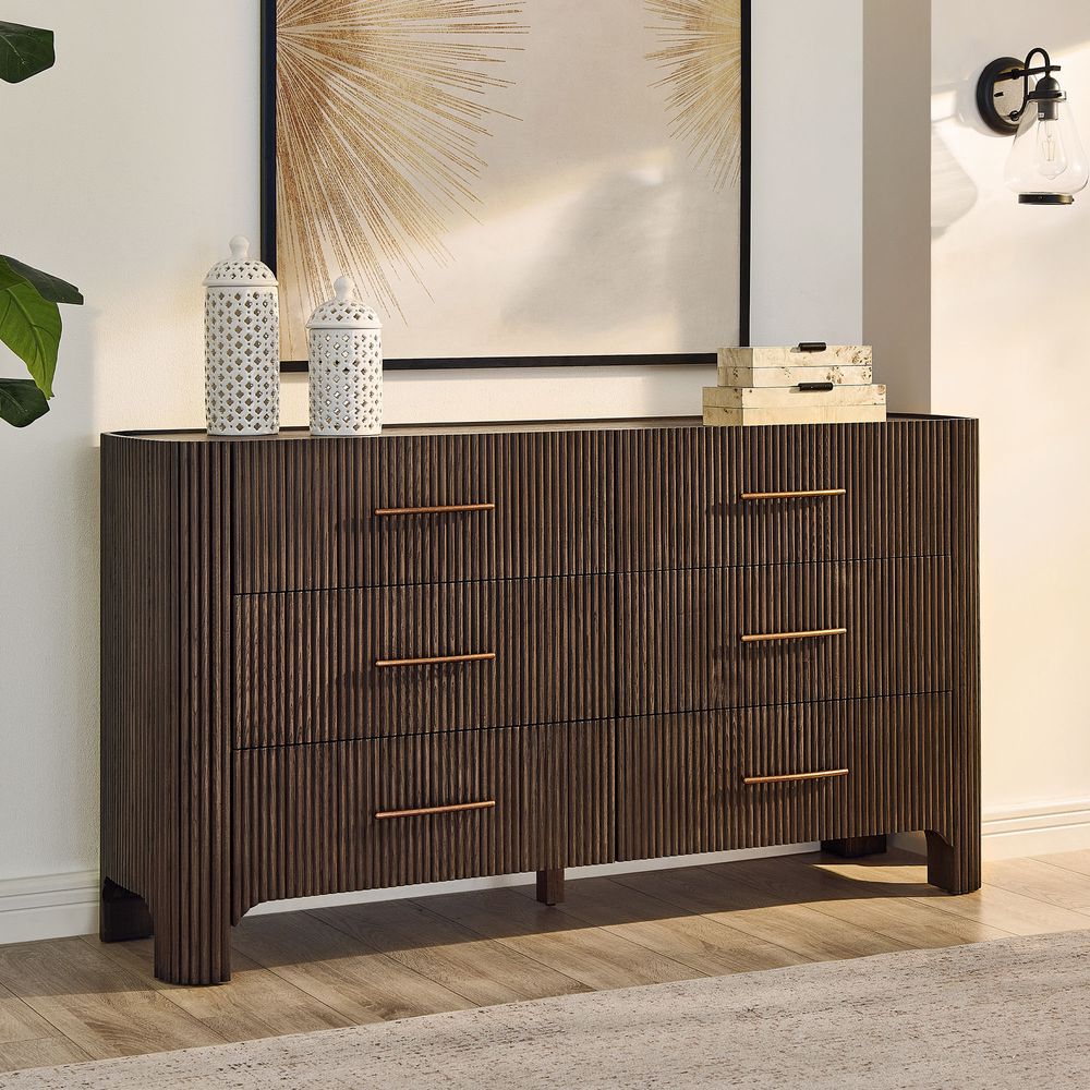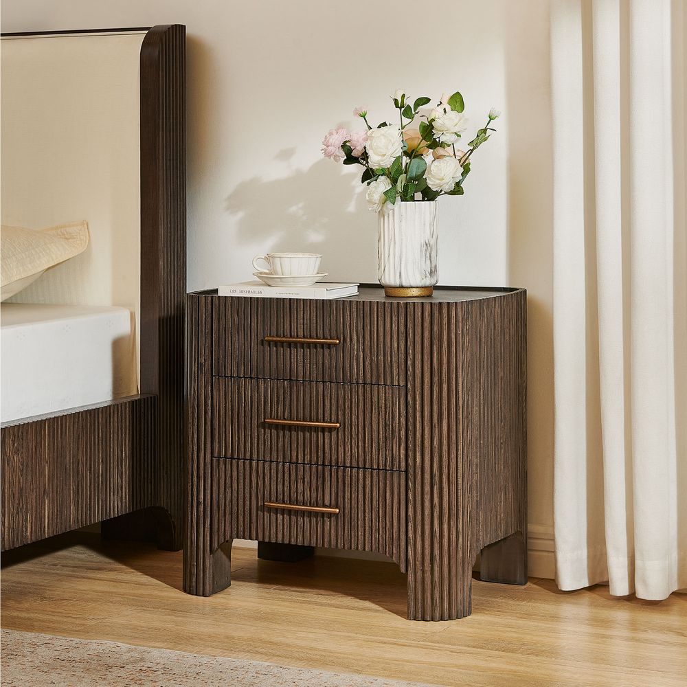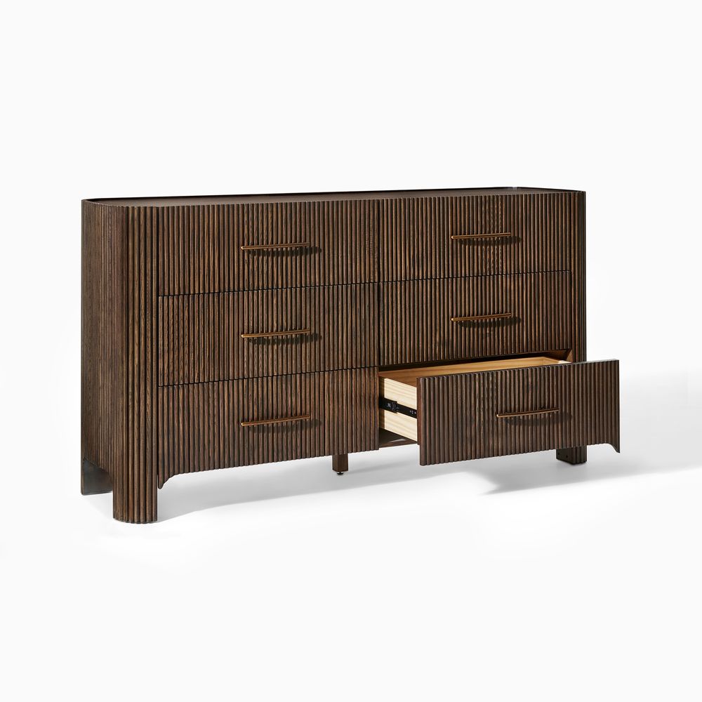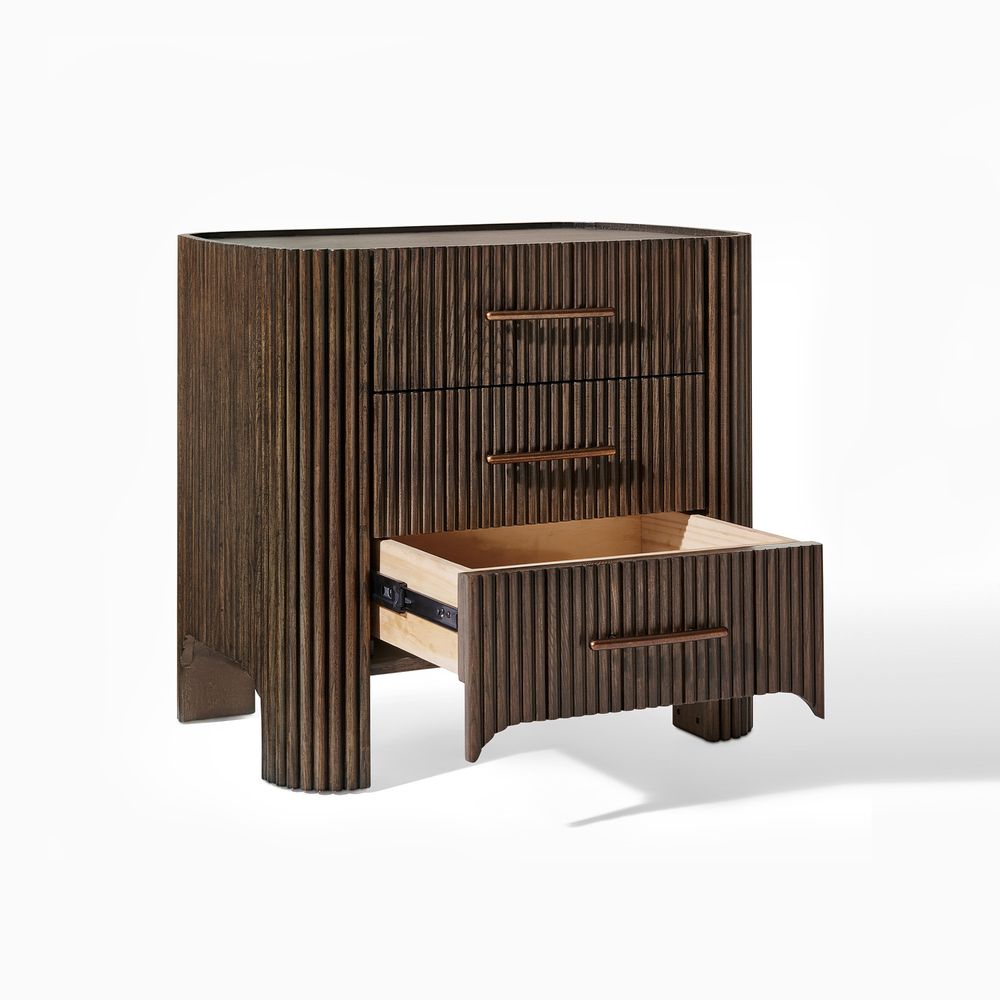 Set consists of 1 queen size bed, 2 nightstands, 1 chest and 1 dresser.Crafted of American solid oak and engineered wood with oak veneers.All wood is kiln-dried for added durability.Finish is achieved through multistep process in which wood is wire brushed to highlight its rich grain.Wood glazing adds visual interest with greater depth and layering and enhances coloring.Solid wood fluting presents a natural texture.Include 6 middle support legs.Bed accommodates most standard mattresses, box spring optional, supporting up to 800 lbs.Color perception may vary due to wood characteristics, lighting, and devices. Wood grain variation is expected, as each is unique.