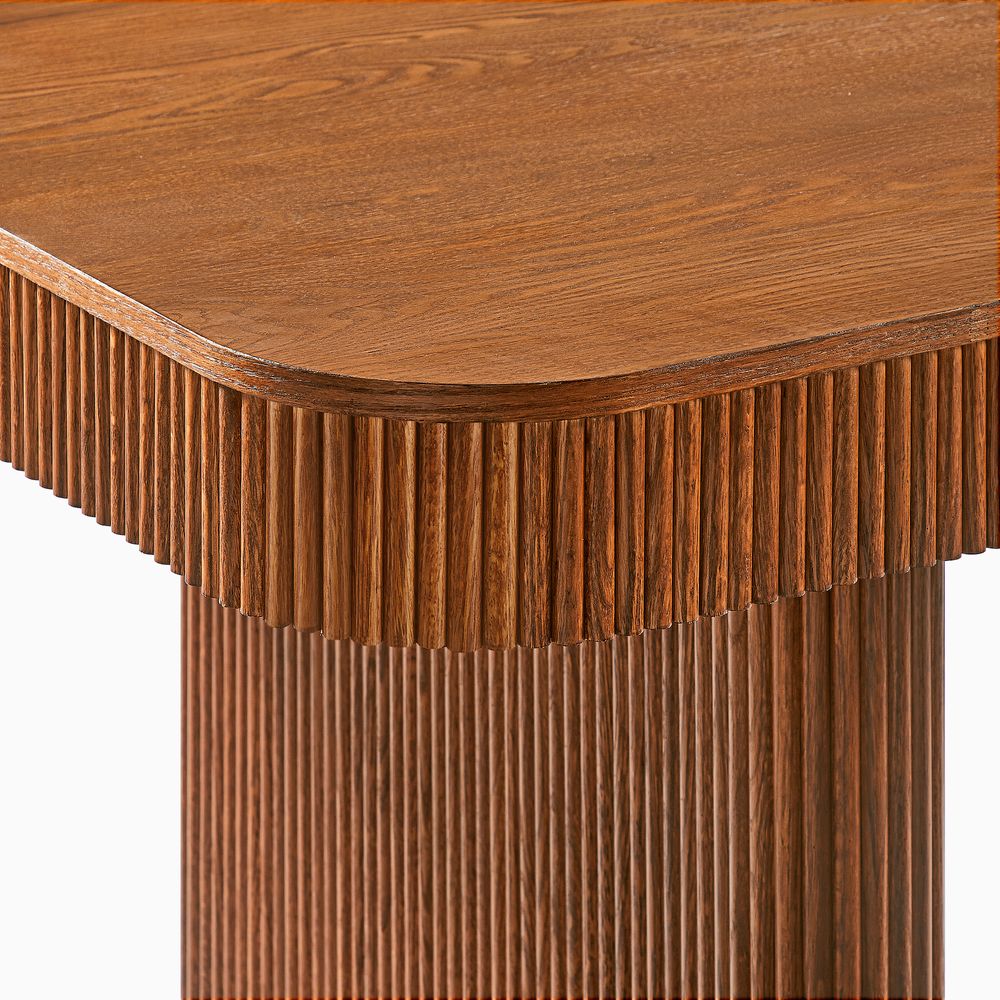 This dining set artfully merges contemporary elegance with retro warmth. Meticulously crafted from premium solid wood and plush upholstered fabric, it delivers lasting durability and inviting comfort. Distinctive in its fluted table detailing and sculpted chair silhouettes, this refined collection transforms any dining space with a seamless balance of artistic design and everyday functionality.
