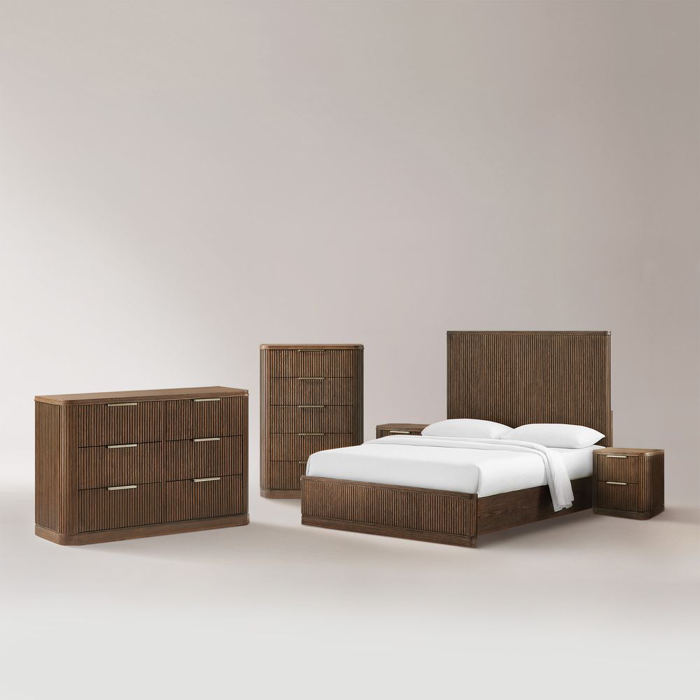 Finnley bedroom collection artfully merges modern sophistication with vintage maximalist charm. Crafted from rich poplar wood veneer and a poplar wood frame, it provides lasting durability and timeless elegance. Featuring a striking vertical fluted design, this refined collection enhances any space with a harmonious blend of bold style and meticulous craftsmanship.