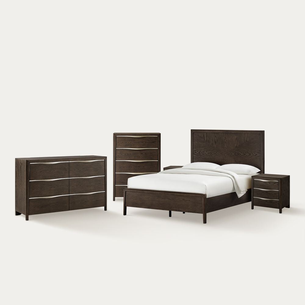 Set consists of 1 queen size bed, 2 nightstands, 1 chest and 1 dresser.Crafted of rubber wood and engineered wood with American oak veneers.All wood is kiln-dried for added durability.Finish is achieved through multistep process in which wood is wire brushed to highlight its rich grain.Wood glazing adds visual interest with greater depth and layering and enhances coloring.Drawers are crafted with precision dovetail joints for superior sturdiness and weight-bearing strength.Solid wood blocks are used at structural joints for reinforcement.Bed accommodates most standard mattresses, box spring optional, supporting up to 800 lbs.Color perception may vary due to wood characteristics, lighting, and devices. Wood grain variation is expected, as each is unique.