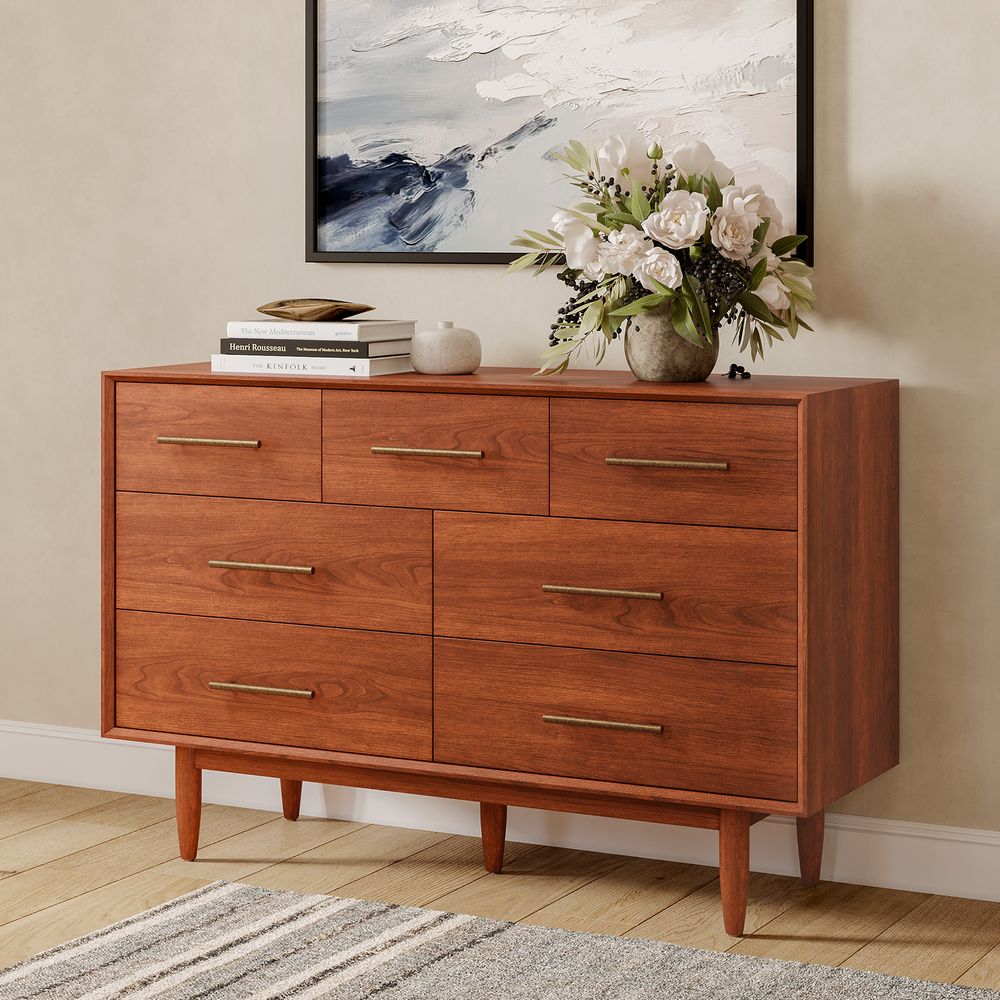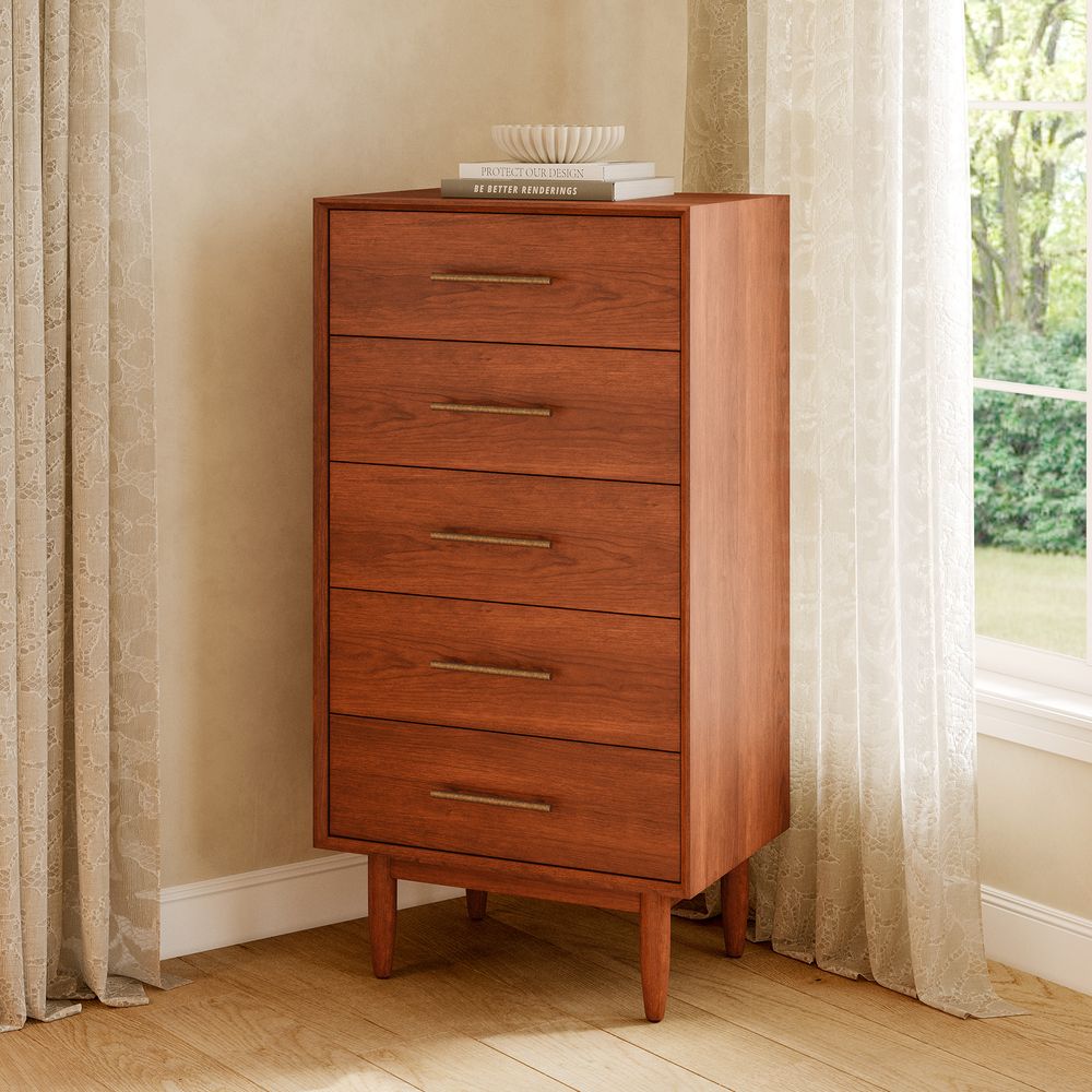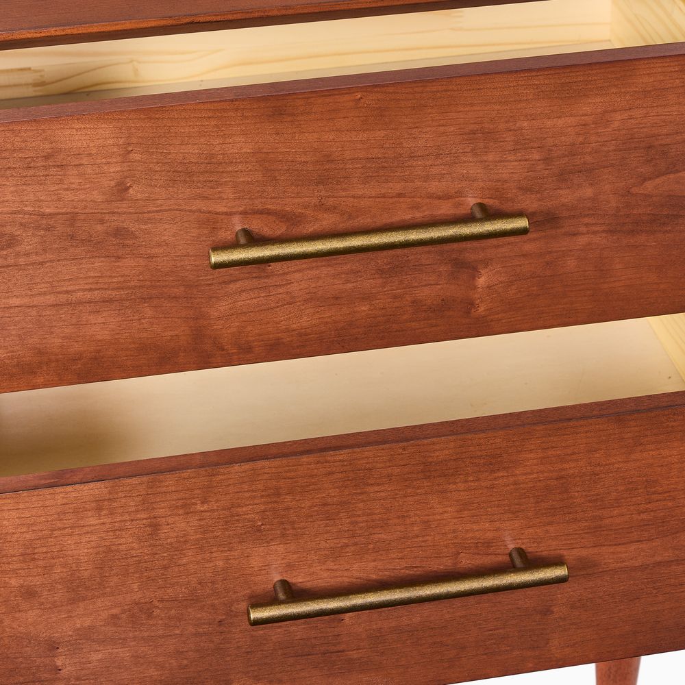 Set consists of 1 queen size bed, 2 nightstands, 1 chest and 1 dresser.Crafted of solid wood and engineered wood with cherry veneers.All wood is kiln-dried for added durability.Finish is achieved through multistep process in which wood is wire brushed to highlight its rich grain.Wood glazing adds visual interest with greater depth and layering and enhances coloring.Drawers are crafted with precision dovetail joints for superior sturdiness and weight-bearing strength.Solid wood blocks are used at structural joints for reinforcement.Bed accommodates most standard mattresses, box spring optional, supporting up to 800 lbs.Color perception may vary due to wood characteristics, lighting, and devices. Wood grain variation is expected, as each is unique.Anti-tip kit hardware (included) is highly recommended to provide protection against tipping of furniture.