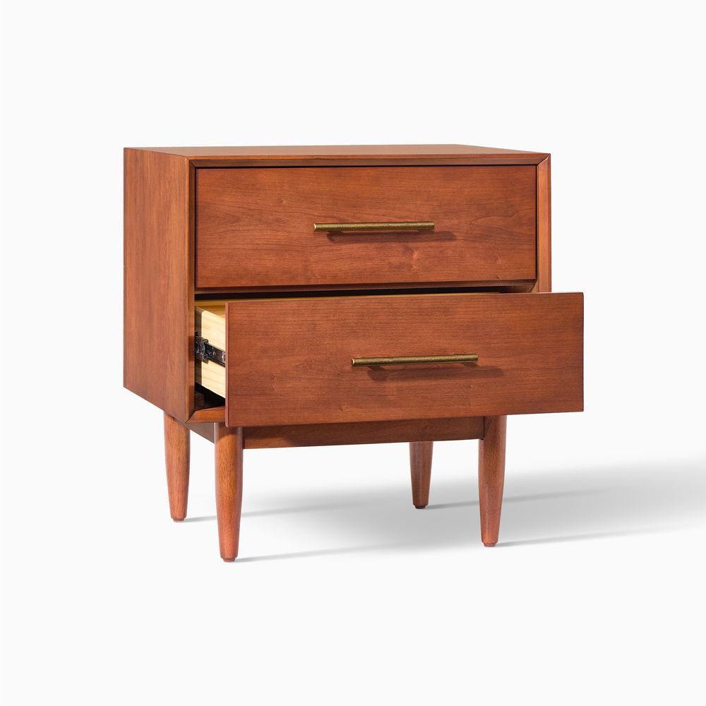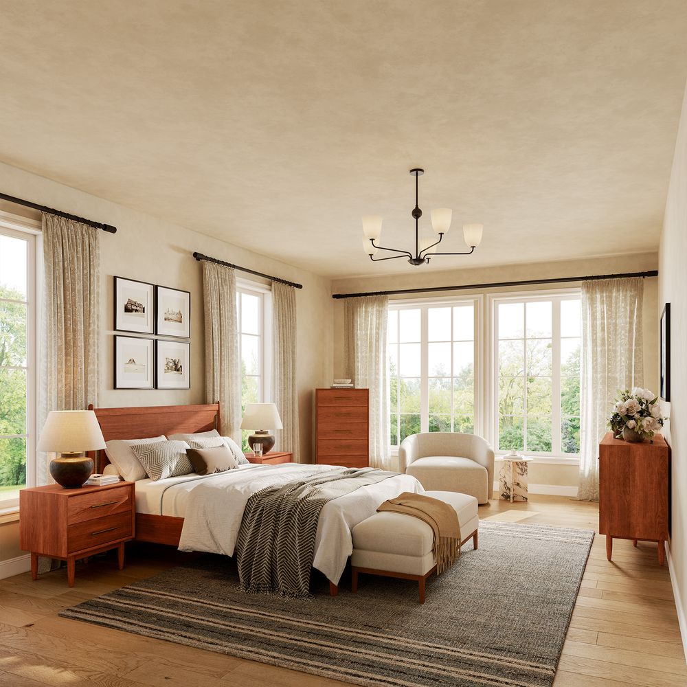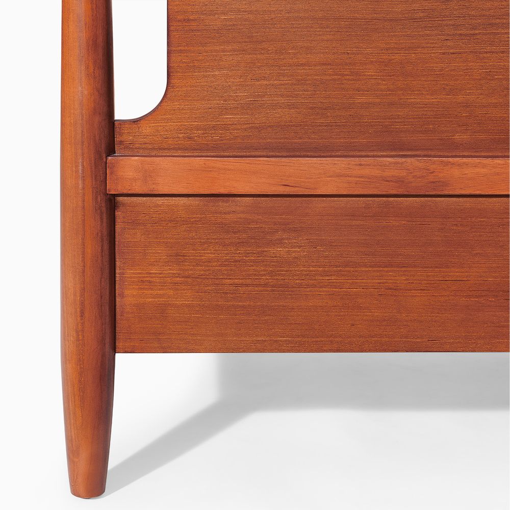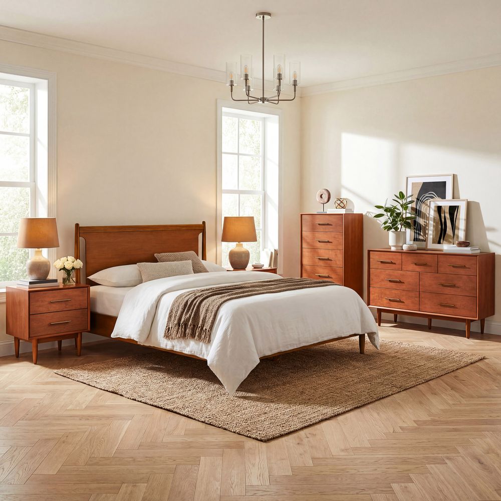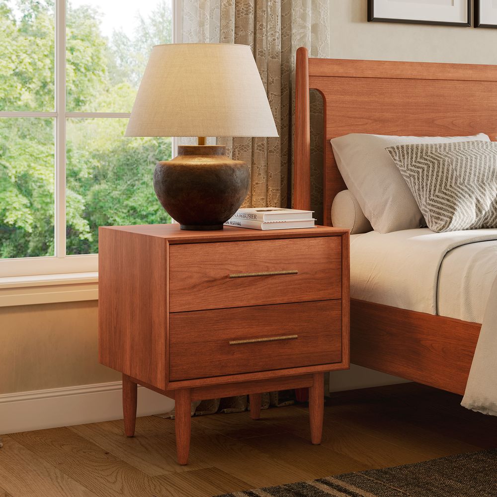 A well-matched set designed for a Mid-Century Modern bedroom, this bed frame pairs effortlessly with two nightstands. Clean lines, classic tapered wood legs, and a warm, nostalgic tone give the collection a light, airy presence, making it easy to layer with varied textures for a cozy, inviting bedroom.