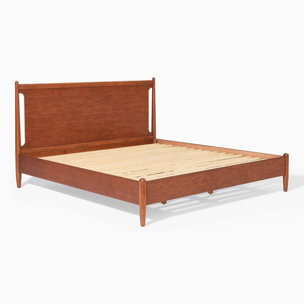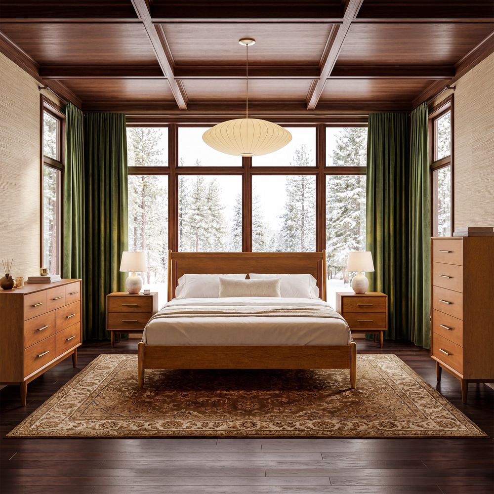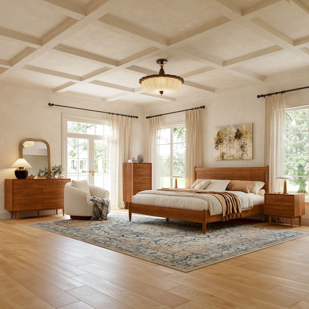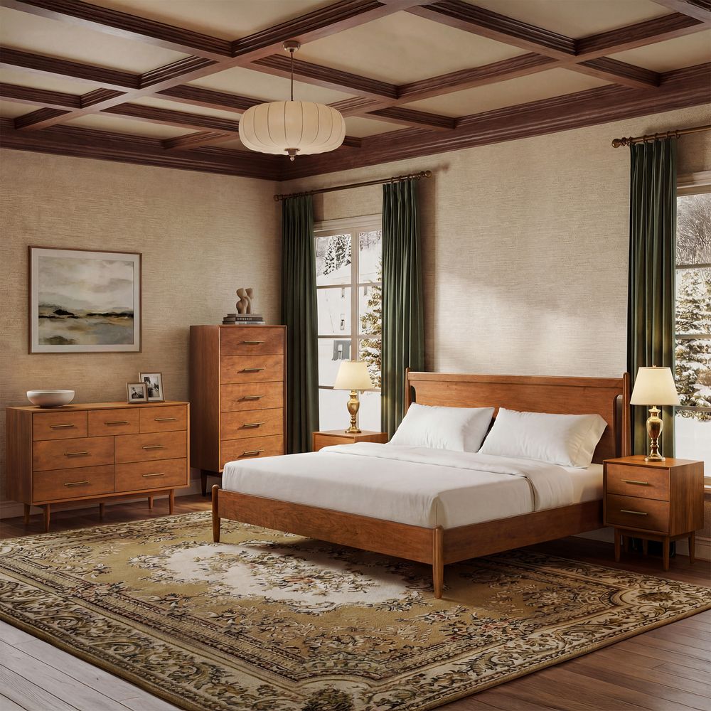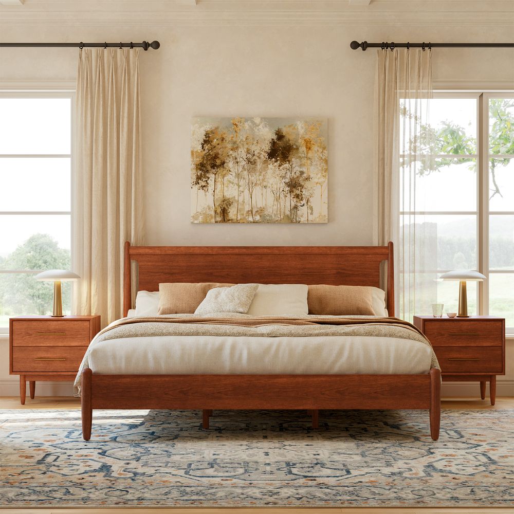 A well-matched set designed for a Mid-Century Modern bedroom, this bed frame pairs effortlessly with two nightstands. Clean lines, classic tapered wood legs, and a warm, nostalgic tone give the collection a light, airy presence, making it easy to layer with varied textures for a cozy, inviting bedroom.