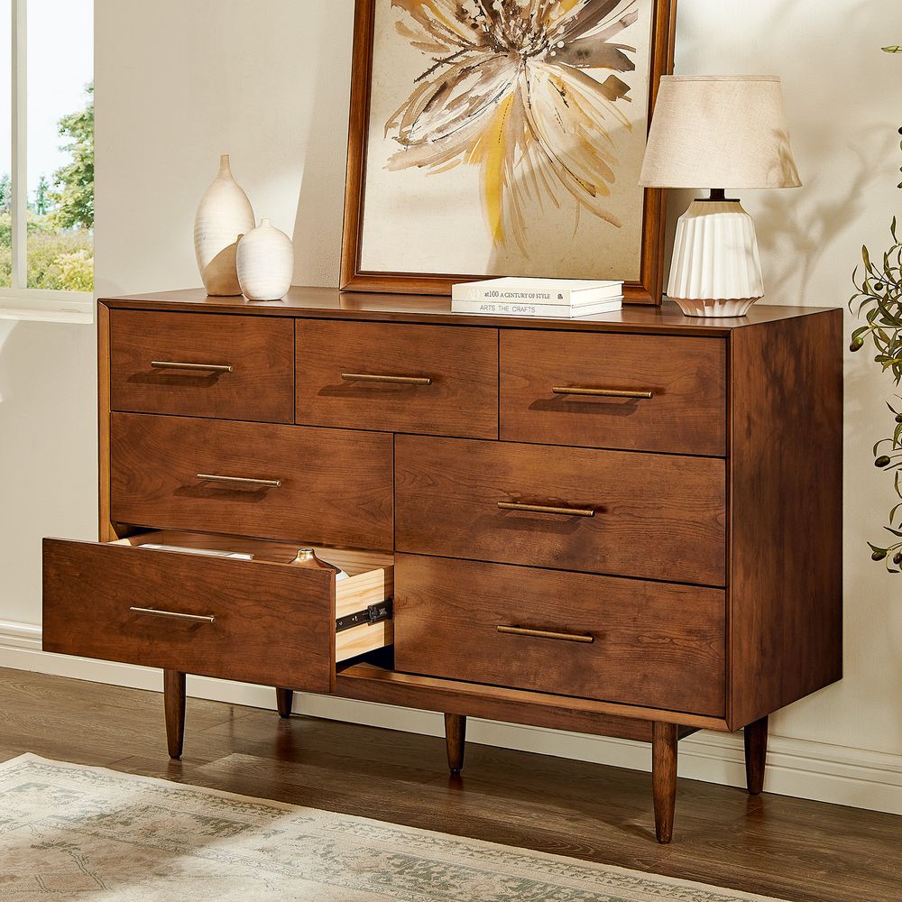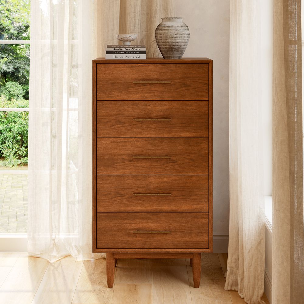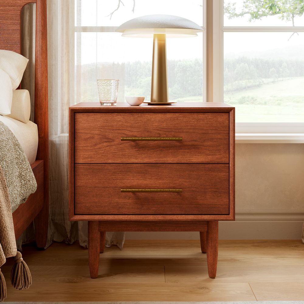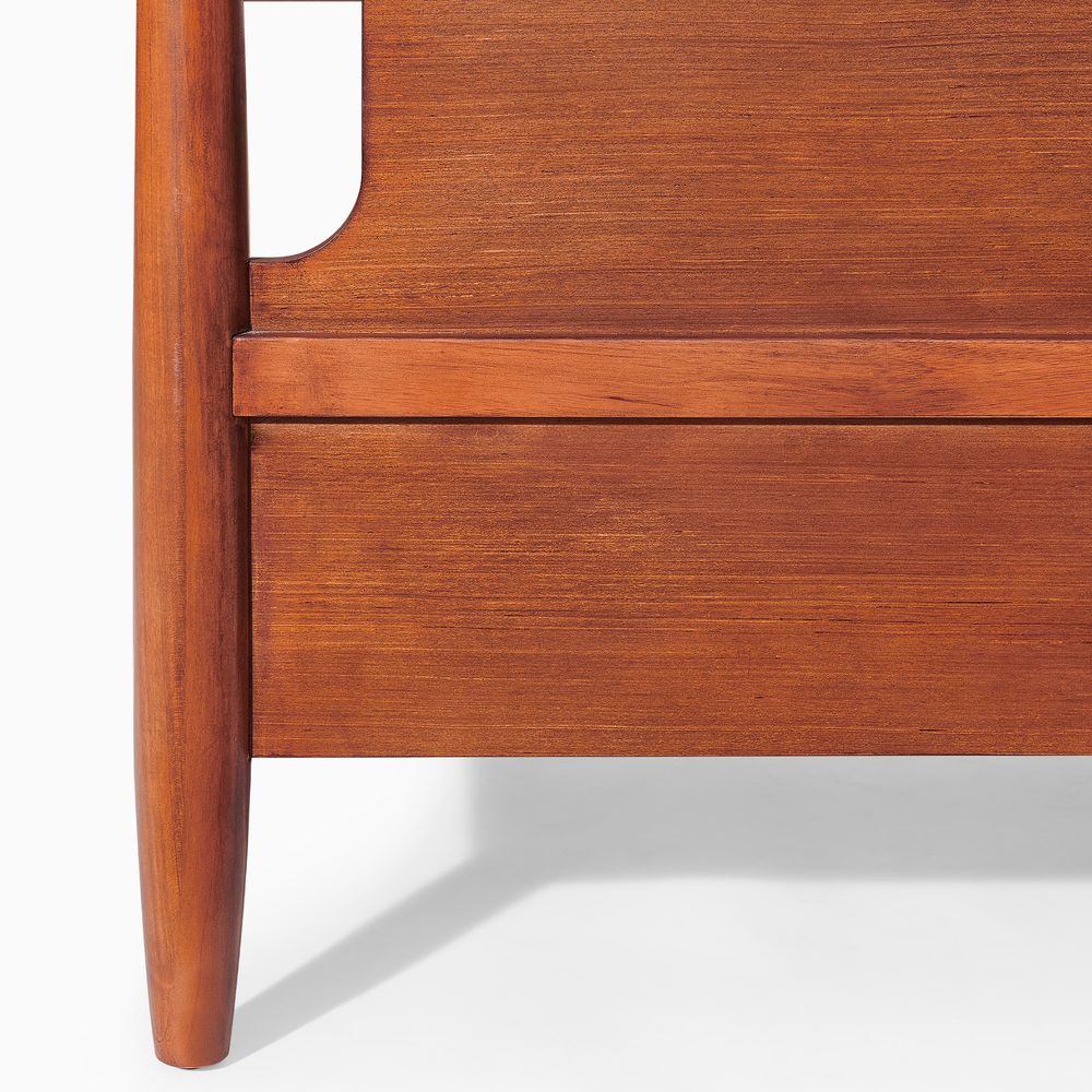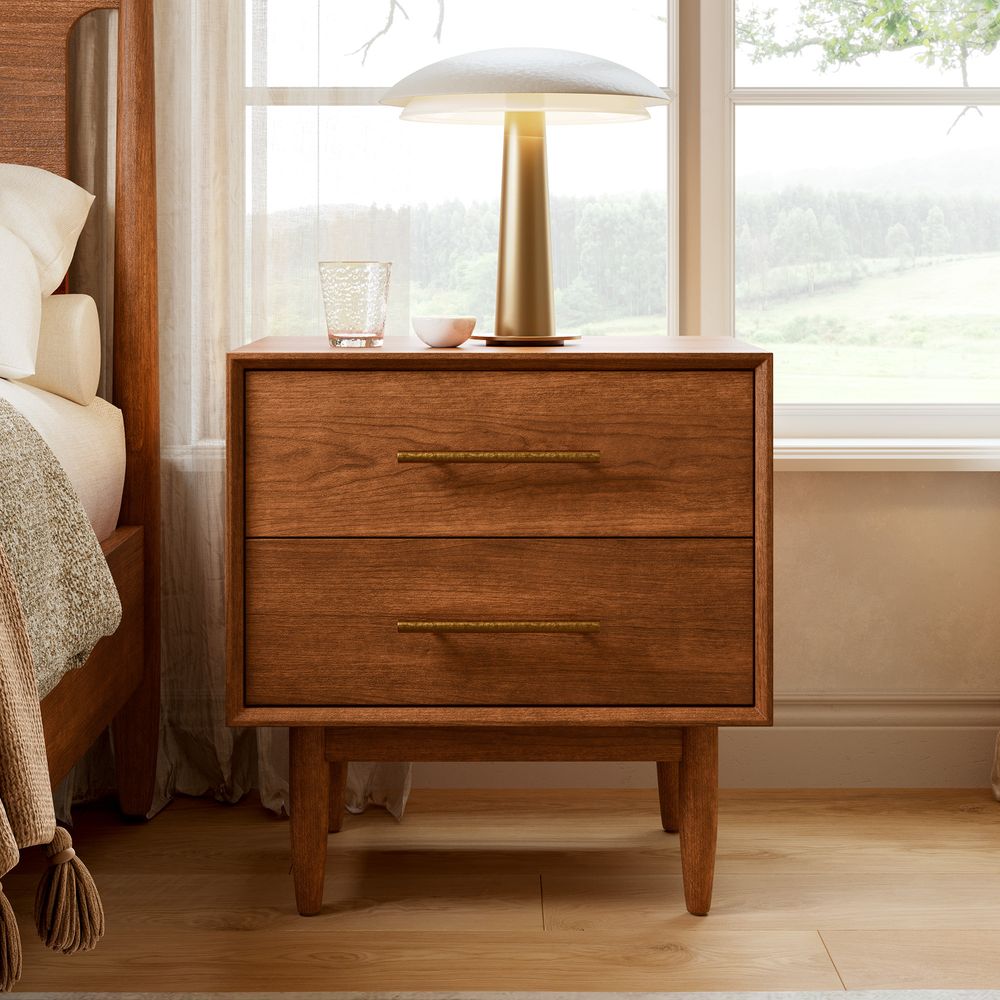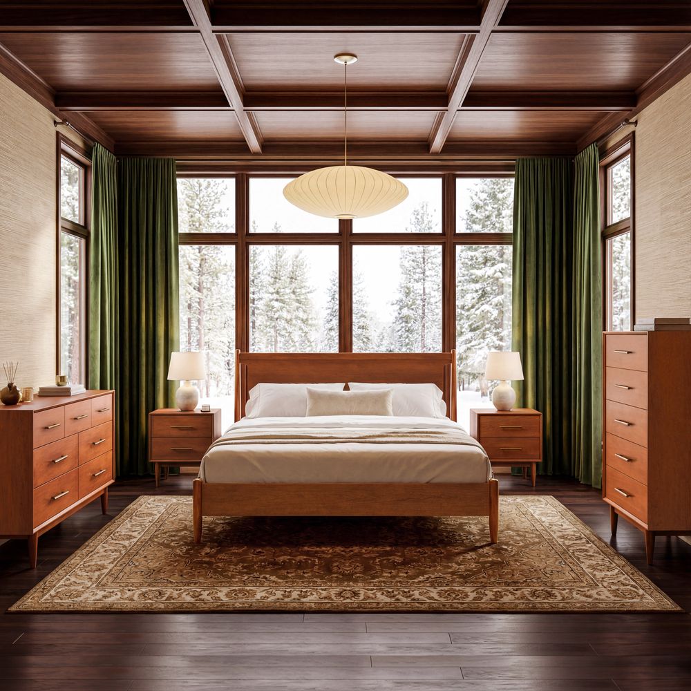 A well-matched set designed for a Mid-Century Modern bedroom, this bed frame pairs effortlessly with two nightstands. Clean lines, classic tapered wood legs, and a warm, nostalgic tone give the collection a light, airy presence, making it easy to layer with varied textures for a cozy, inviting bedroom.