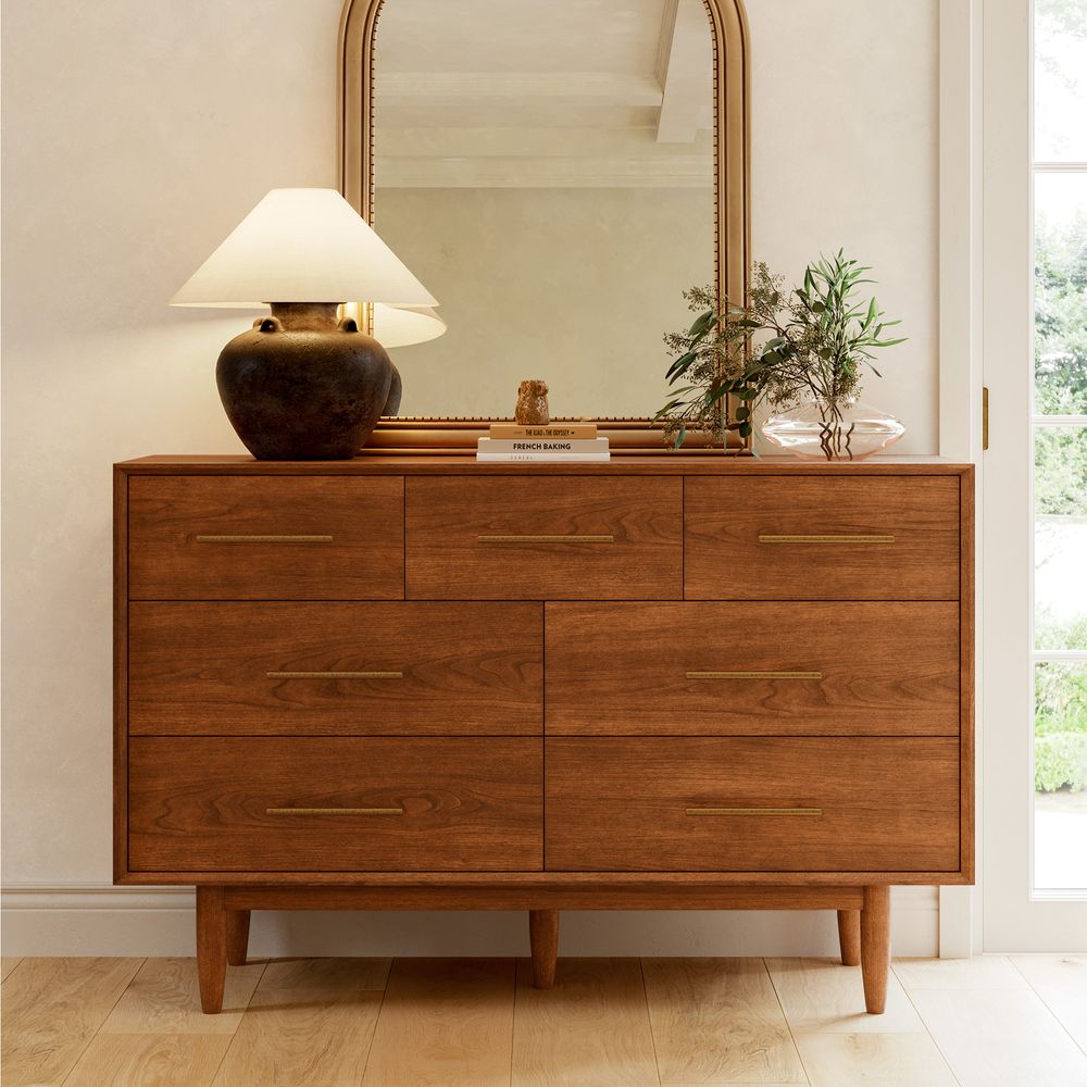 Set consists of 1 king size bed, 2 nightstands, 1 chest and 1 dresser.Crafted of solid wood and engineered wood with cherry veneers.All wood is kiln-dried for added durability.Finish is achieved through multistep process in which wood is wire brushed to highlight its rich grain.Wood glazing adds visual interest with greater depth and layering and enhances coloring.Drawers are crafted with precision dovetail joints for superior sturdiness and weight-bearing strength.Solid wood blocks are used at structural joints for reinforcement.Bed accommodates most standard mattresses, box spring optional, supporting up to 800 lbs.Color perception may vary due to wood characteristics, lighting, and devices. Wood grain variation is expected, as each is unique.Anti-tip kit hardware (included) is highly recommended to provide protection against tipping of furniture.