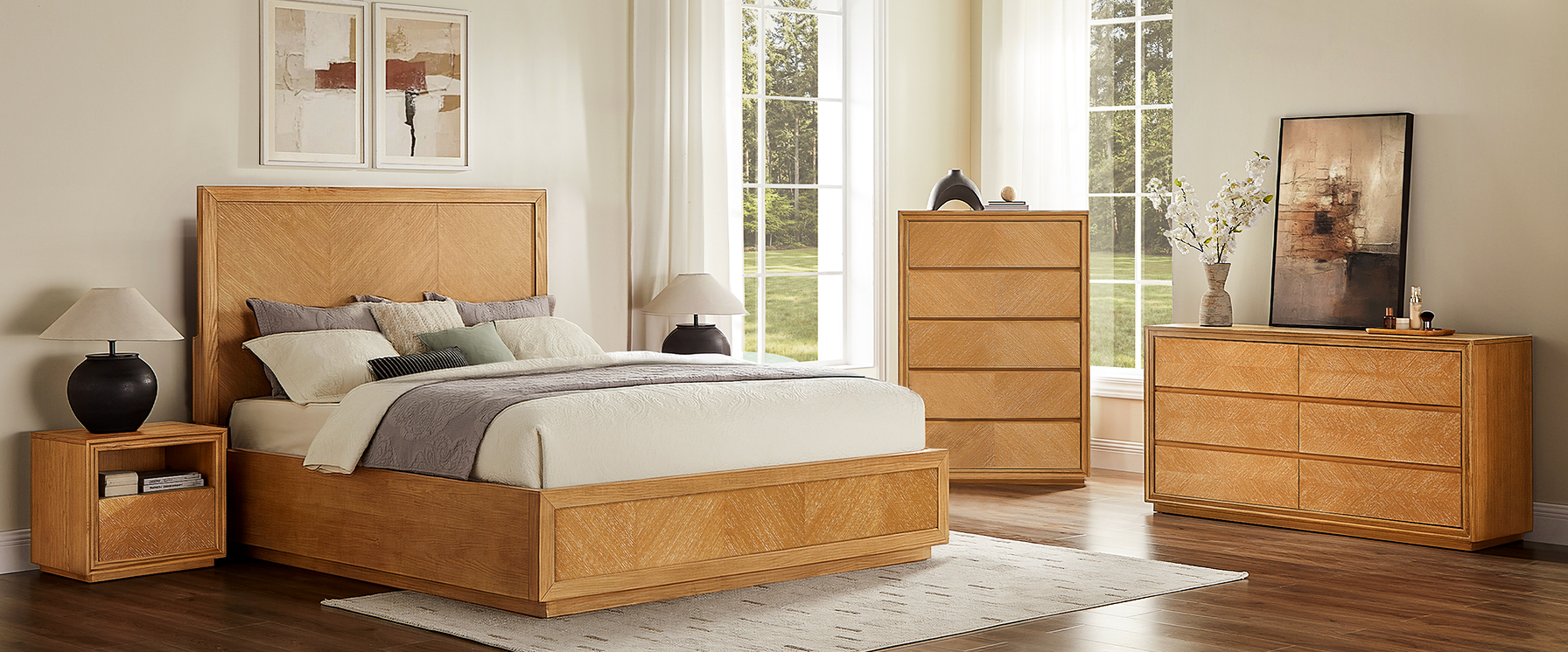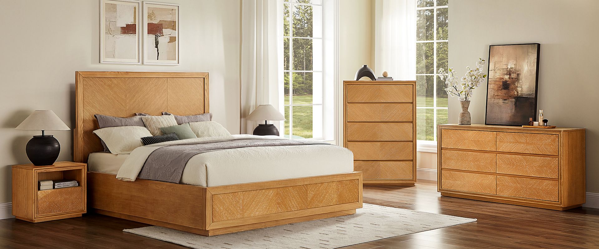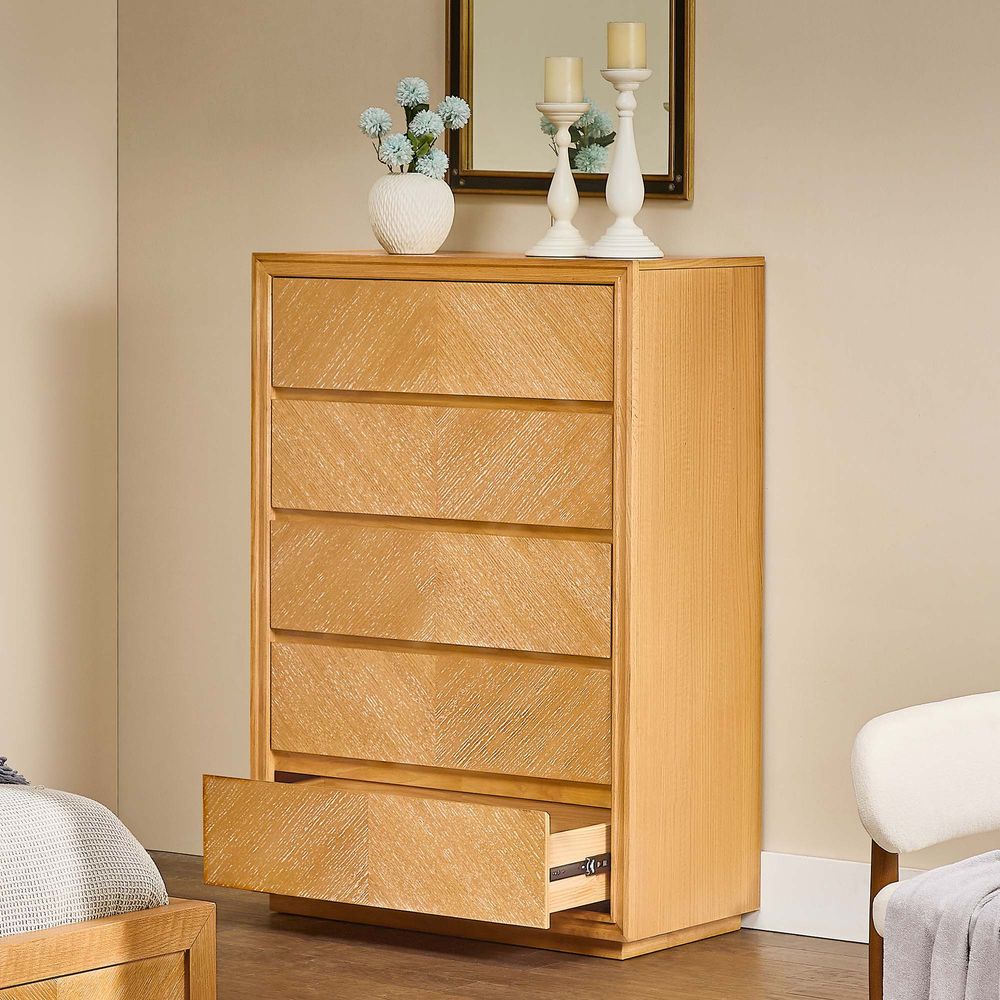 Set consists of 1 queen size bed, 2 nightstands, 1 chest and 1 dresser.Crafted of American solid oak and engineered wood with oak veneers.All wood is kiln-dried for added durability.Finish is achieved through multistep process in which wood is wire brushed to highlight its rich grain.Wood glazing adds visual interest with greater depth and layering and enhances coloring.Drawers are crafted with precision dovetail joints for superior sturdiness and weight-bearing strength.Solid wood blocks are used at structural joints for reinforcement.Bed accommodates most standard mattresses, box spring required, supporting up to 800 lbs.Color perception may vary due to wood characteristics, lighting, and devices. Wood grain variation is expected, as each is unique.