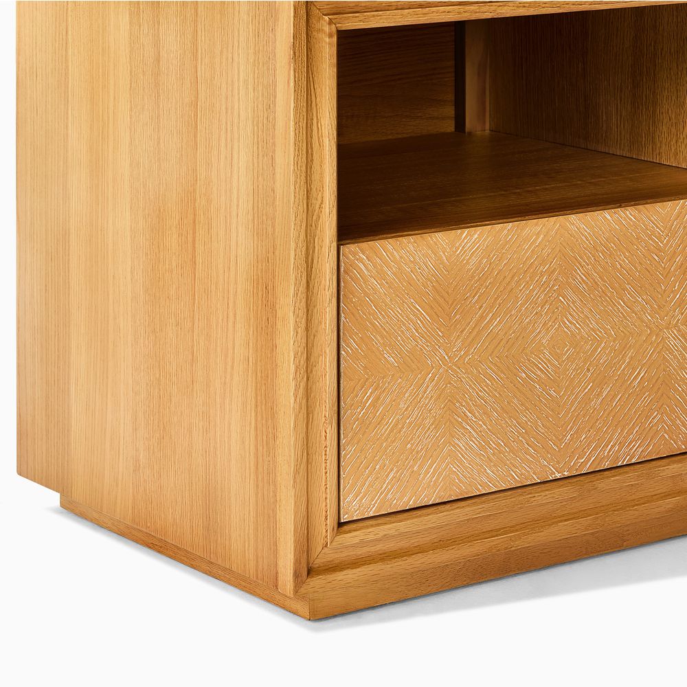 Thursen is defined by an intricate parquet design, where wooden tiles reveal rich grain and subtle tonal variation. Angled carvings form a geometric pattern that adds depth and catches a soft luster under shifting light. Art-frame–like edges outline the form, while a recessed base introduces an architectural, vintage sensibility. Restrained yet rich in detail, Thursen offers quiet sophistication with lasting versatility.