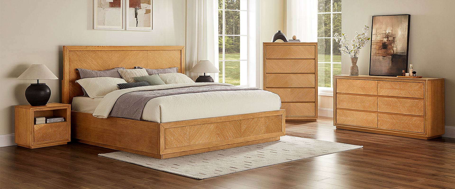 Set consists of 1 king size bed, 2 nightstands, 1 chest and 1 dresser.Crafted of American solid oak and engineered wood with oak veneers.All wood is kiln-dried for added durability.Finish is achieved through multistep process in which wood is wire brushed to highlight its rich grain.Wood glazing adds visual interest with greater depth and layering and enhances coloring.Drawers are crafted with precision dovetail joints for superior sturdiness and weight-bearing strength.Solid wood blocks are used at structural joints for reinforcement.Bed accommodates most standard mattresses, box spring required, supporting up to 800 lbs.Color perception may vary due to wood characteristics, lighting, and devices. Wood grain variation is expected, as each is unique.