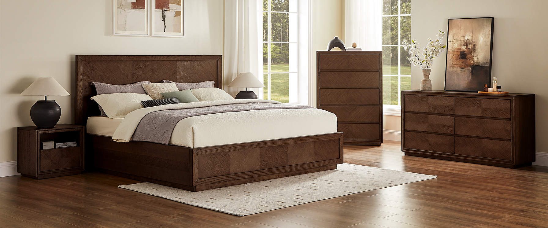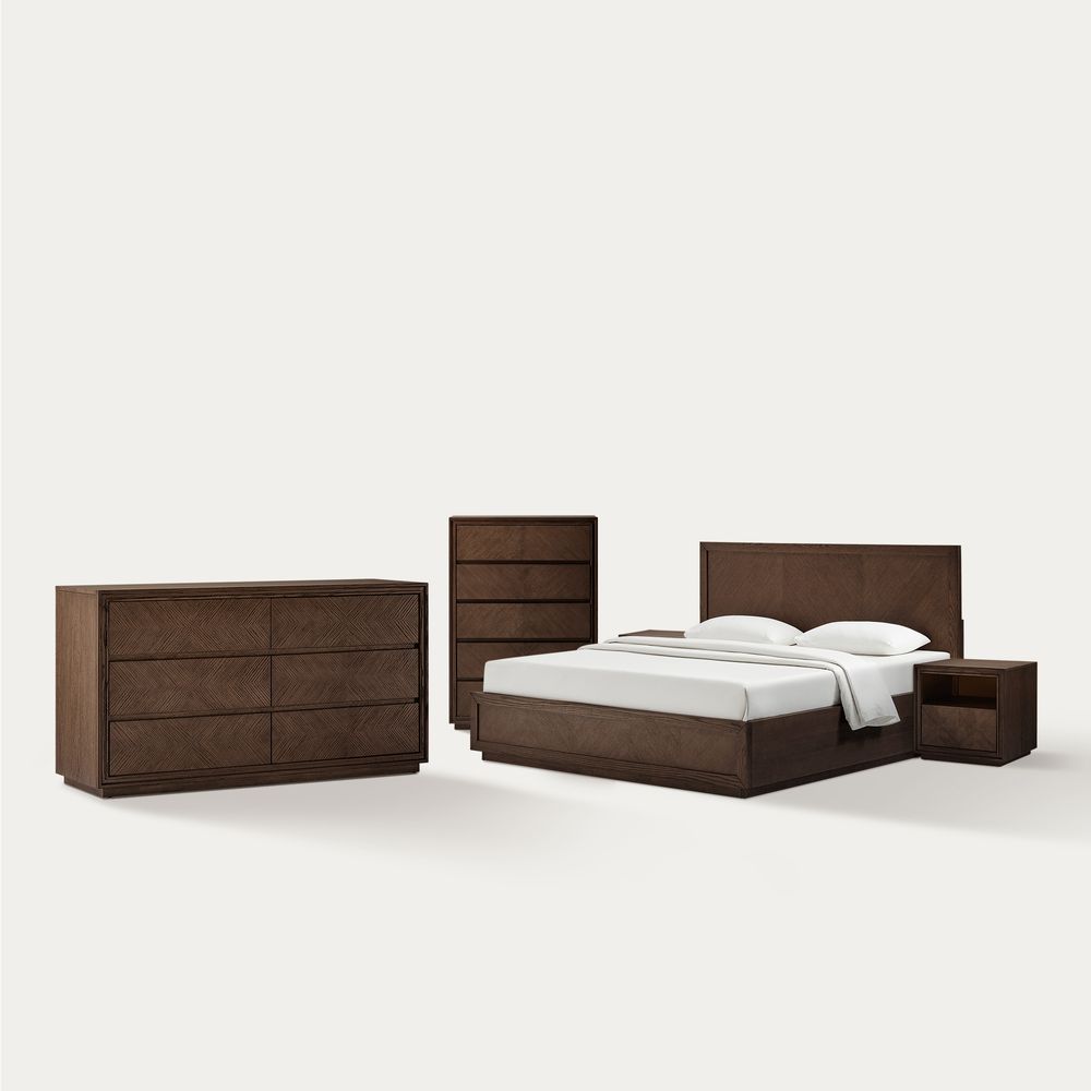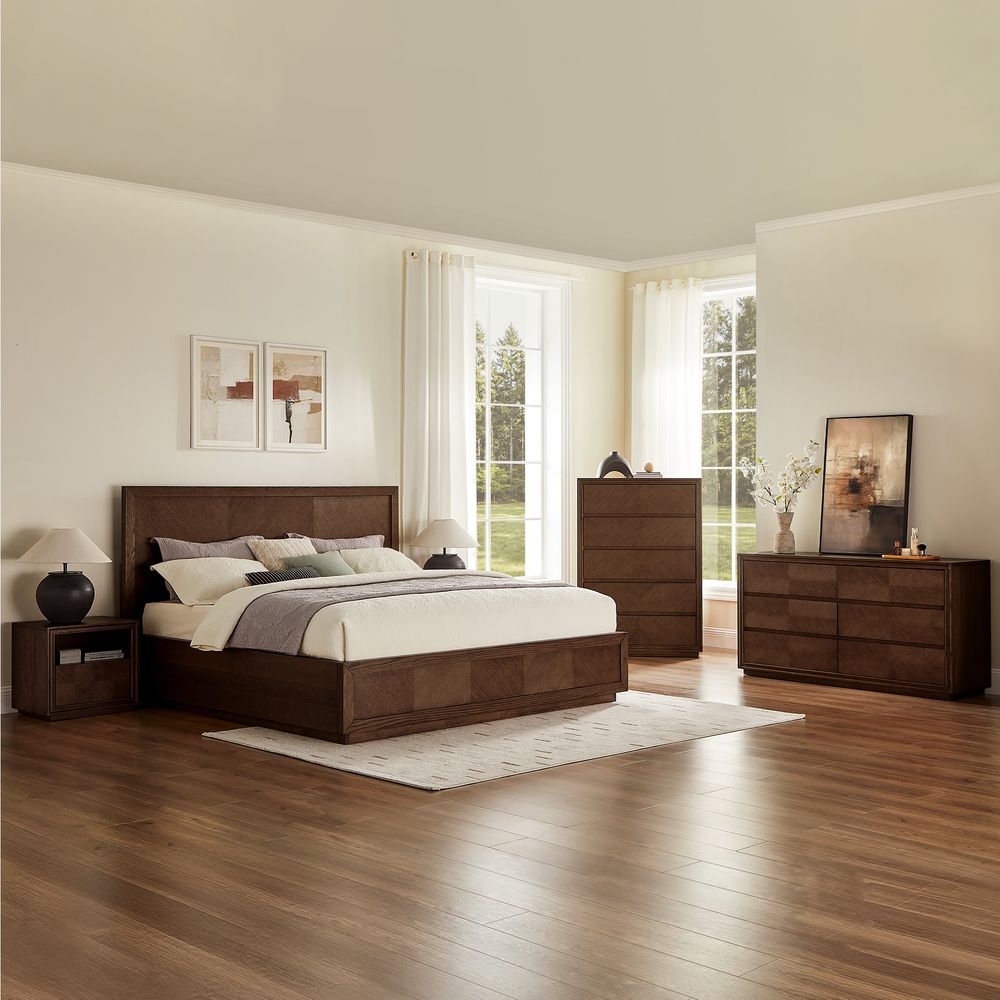 Set consists of 1 king size bed, 2 nightstands, 1 chest and 1 dresser.Crafted of American solid oak and engineered wood with oak veneers.All wood is kiln-dried for added durability.Finish is achieved through multistep process in which wood is wire brushed to highlight its rich grain.Wood glazing adds visual interest with greater depth and layering and enhances coloring.Drawers are crafted with precision dovetail joints for superior sturdiness and weight-bearing strength.Solid wood blocks are used at structural joints for reinforcement.Bed accommodates most standard mattresses, box spring required, supporting up to 800 lbs.Color perception may vary due to wood characteristics, lighting, and devices. Wood grain variation is expected, as each is unique.