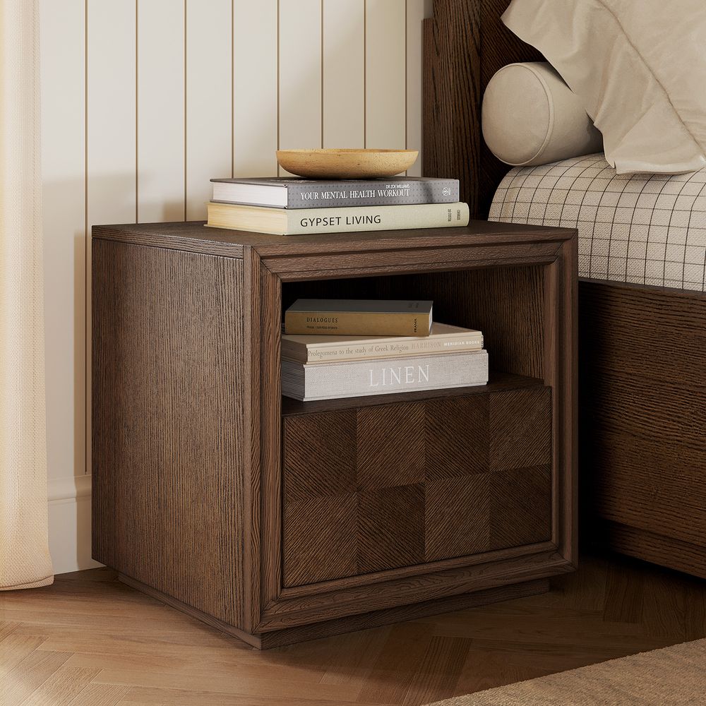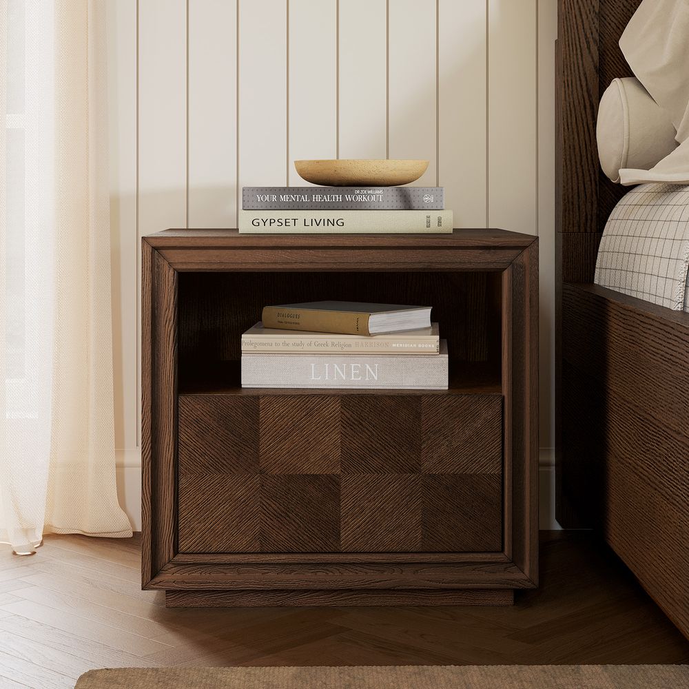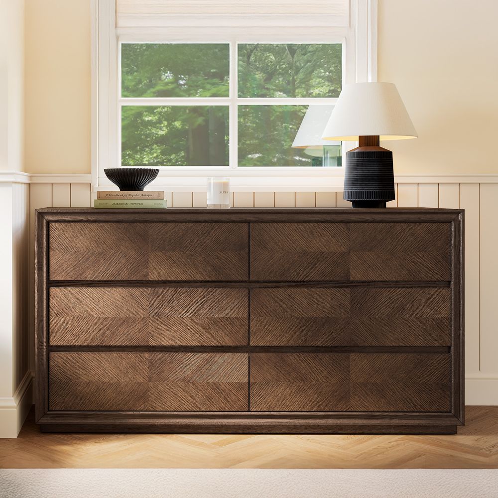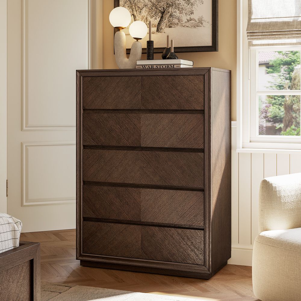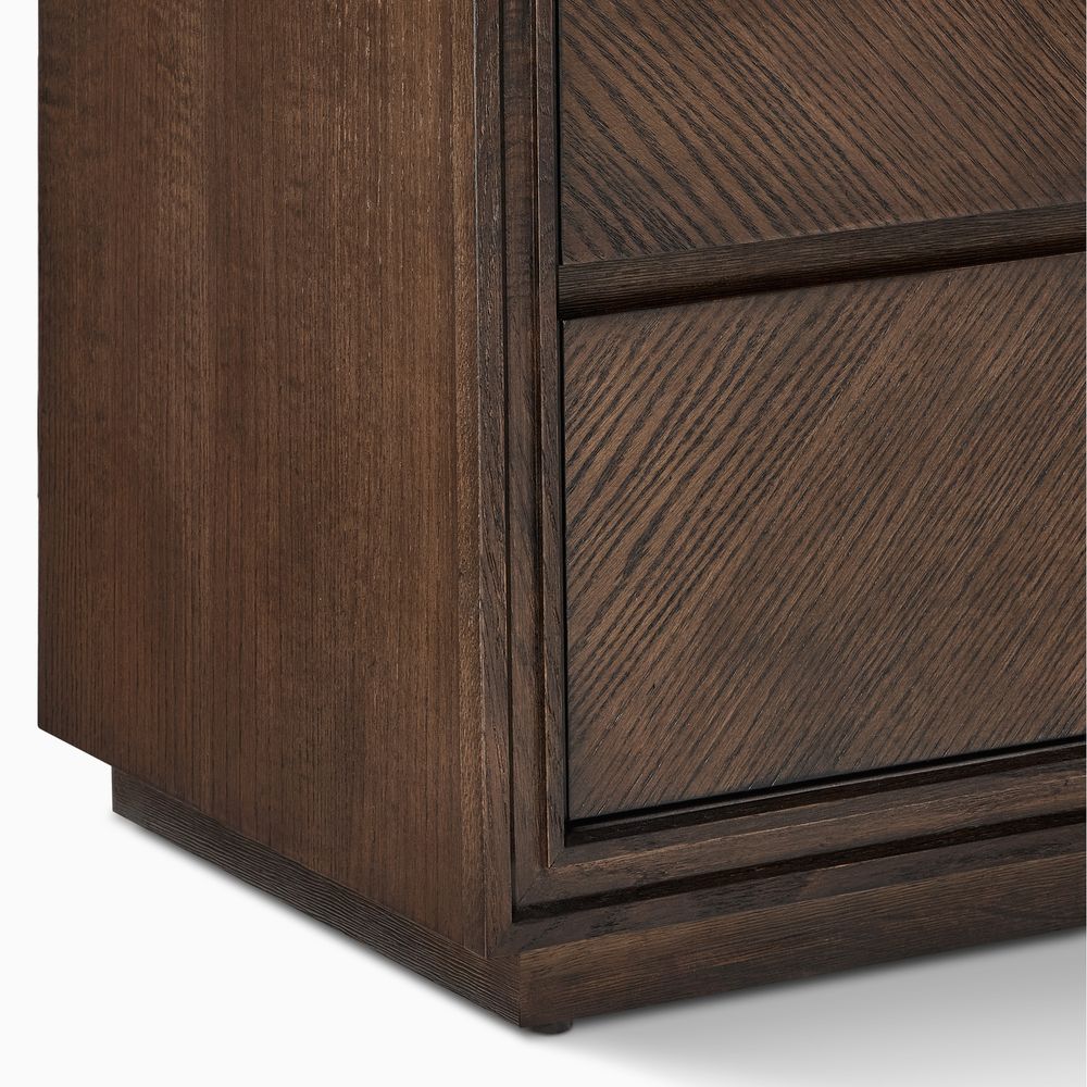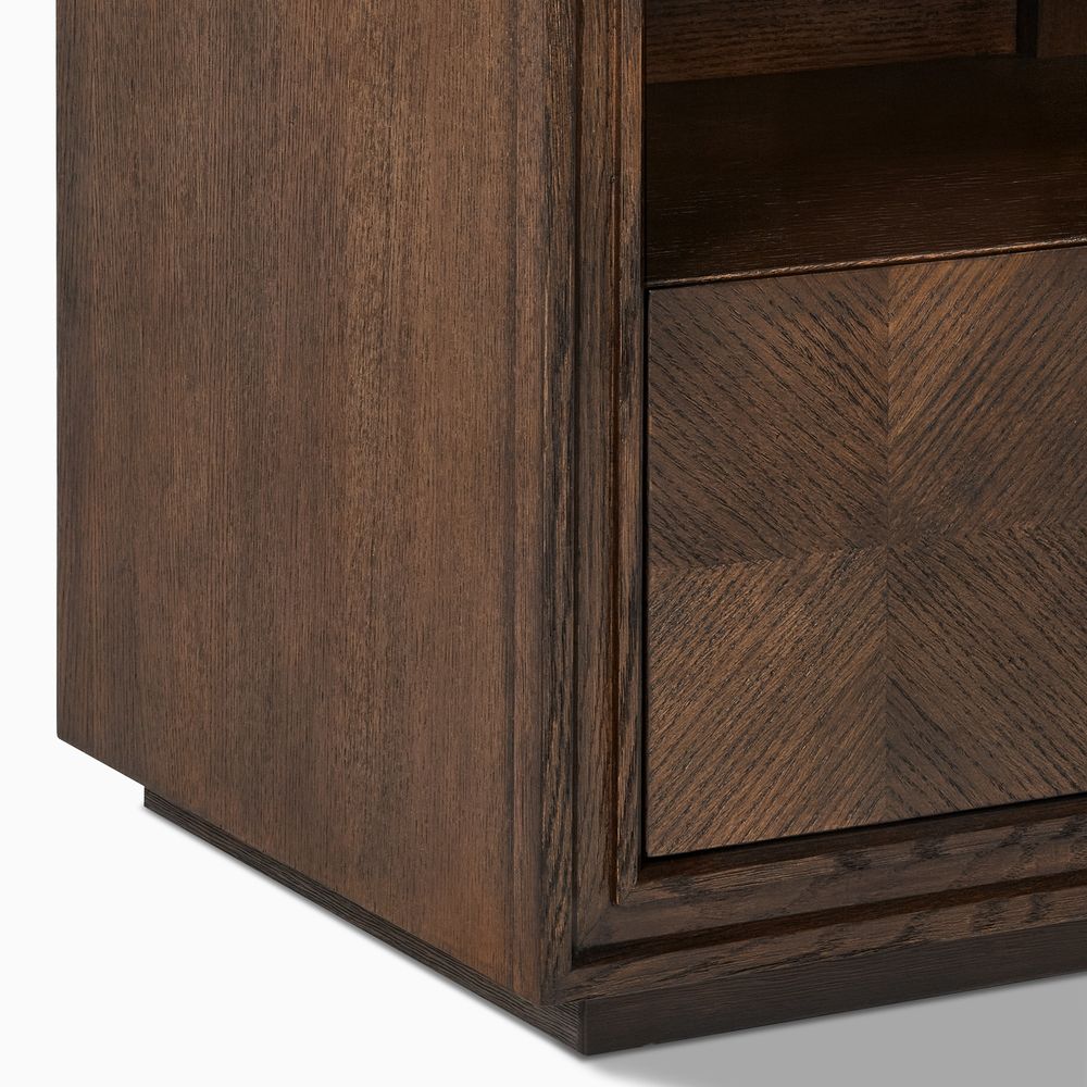 Thursen is defined by an intricate parquet design, where wooden tiles reveal rich grain and subtle tonal variation. Angled carvings form a geometric pattern that adds depth and catches a soft luster under shifting light. Art-frame–like edges outline the form, while a recessed base introduces an architectural, vintage sensibility. Restrained yet rich in detail, Thursen offers quiet sophistication with lasting versatility.