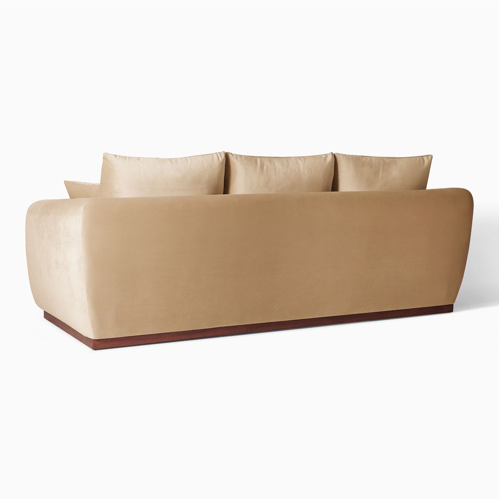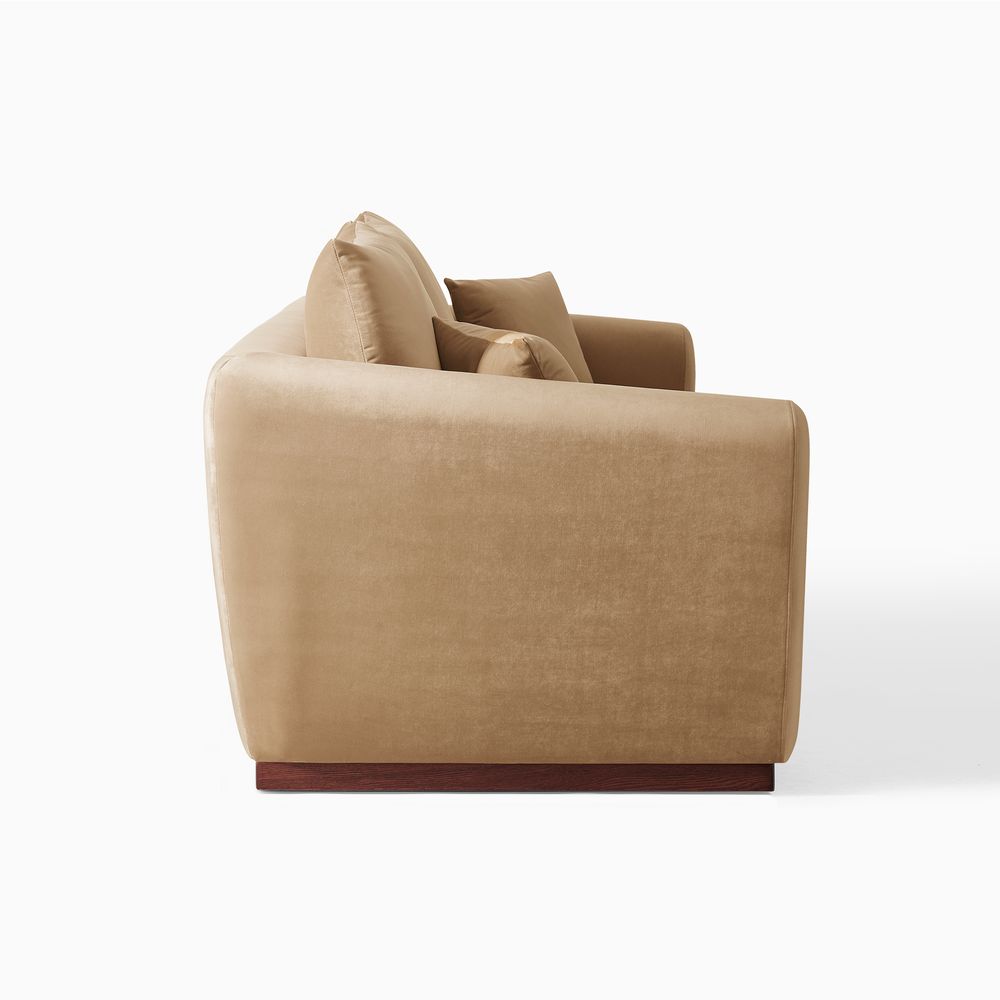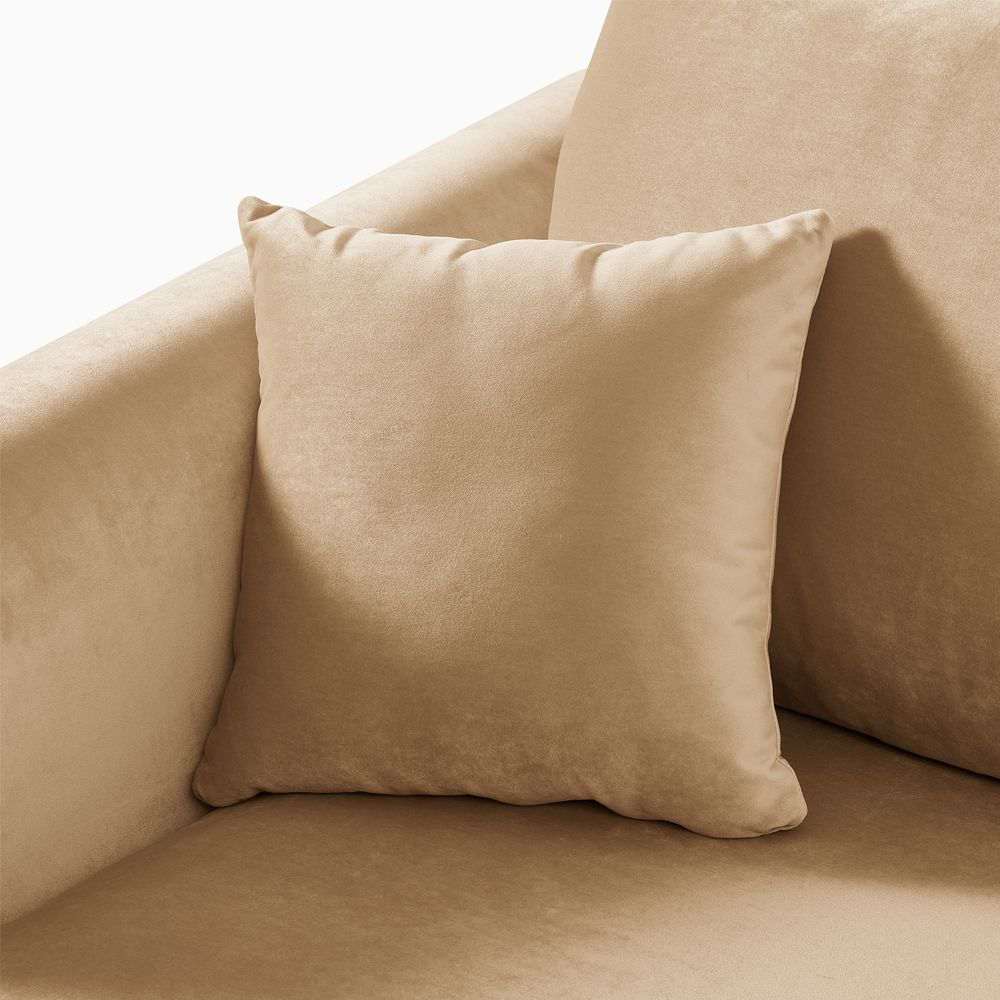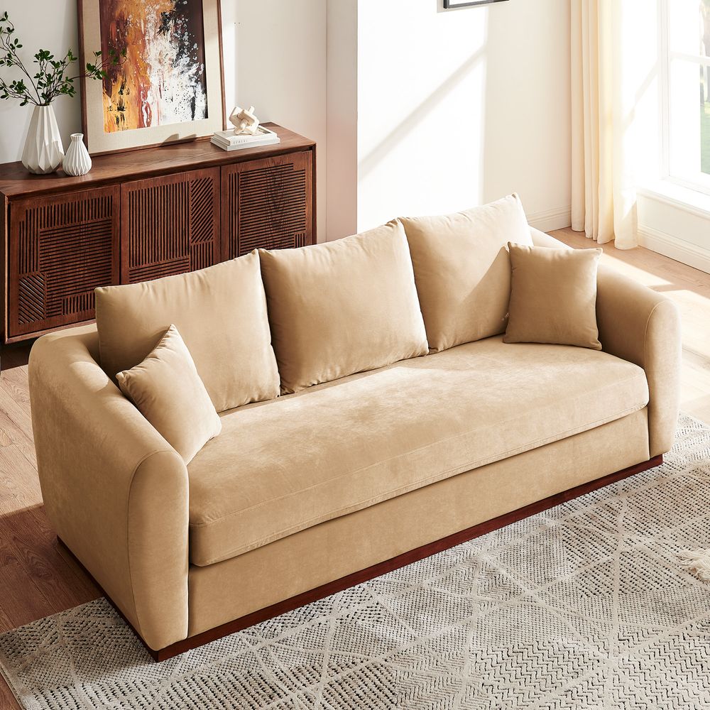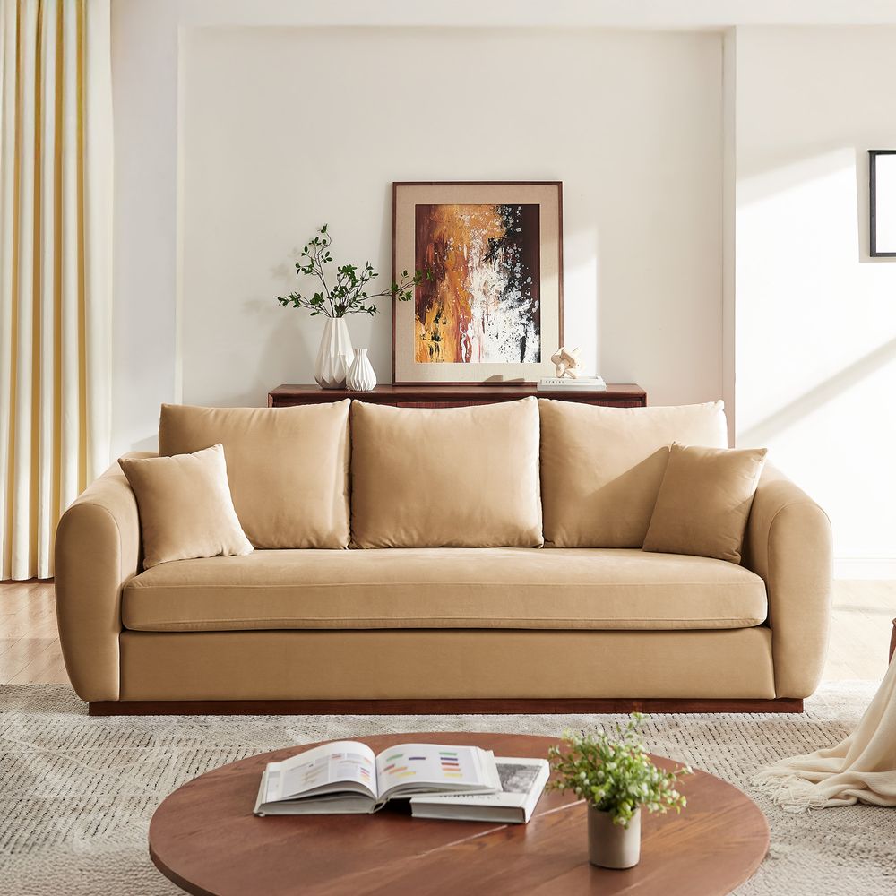 American solid ash wood and plywood frame.Durable velvet fabric with a soft, shorpile and matte finish.Seat cushions have fiber-wrapped, high-resiliency polyurethane foam cores.Sinuous spring suspension with reinforced elastic webbing.The upholstery on the sofa adds soft padding for cozy, stylish seating surfaces.Cushion covers unzip to remove.3 square cushions and 2 throw pillows are included.91" sofa designed for 3-4 people's gathering.Items purchased at different times may not match due to different dye lots, also color perception can vary by lighting and devices.