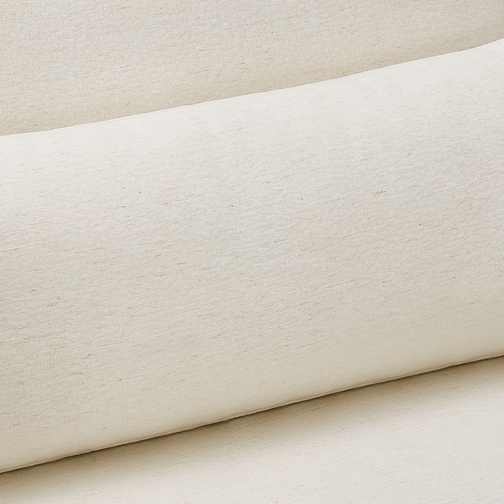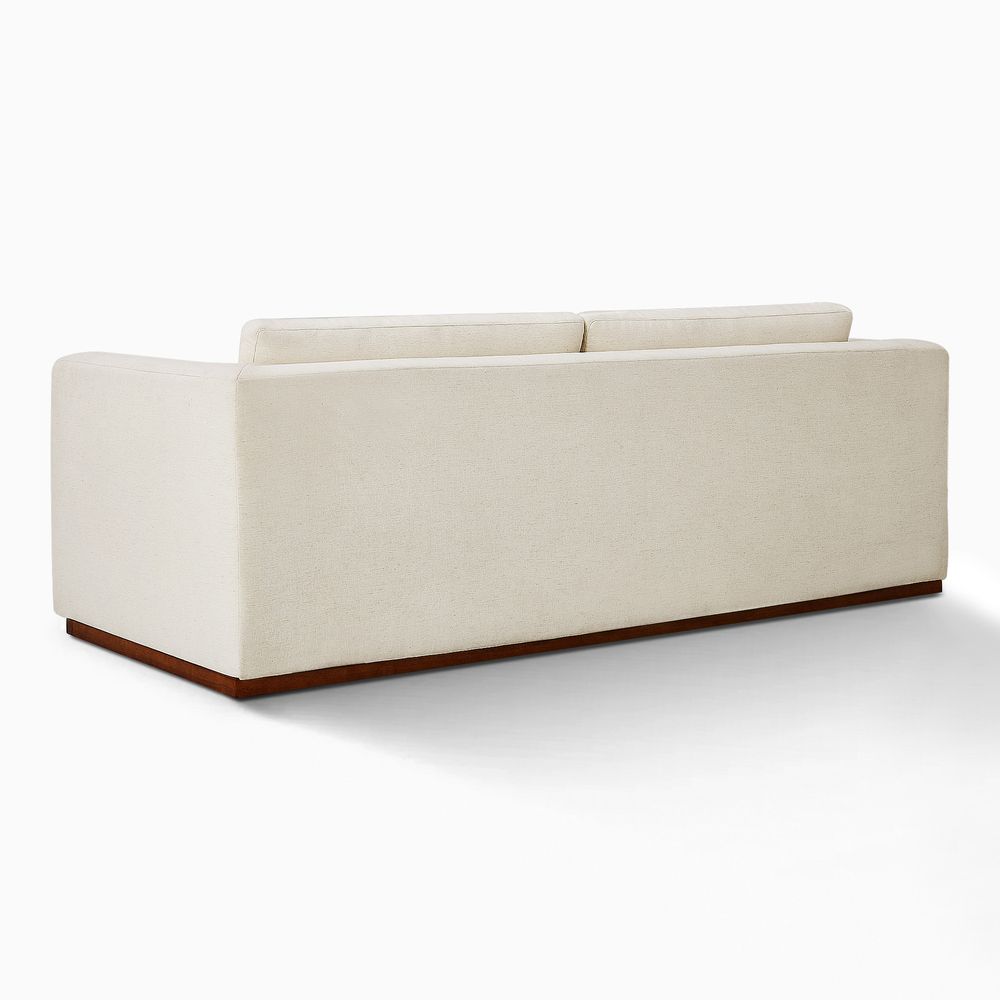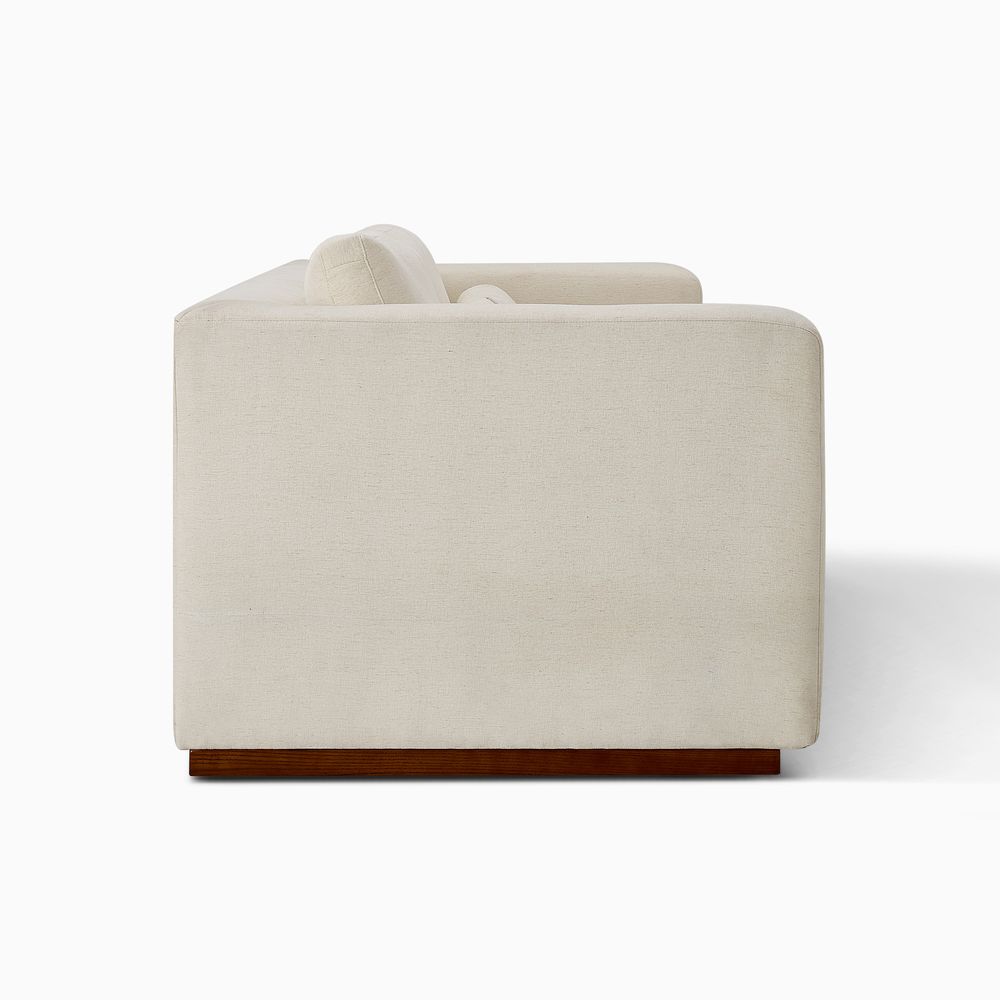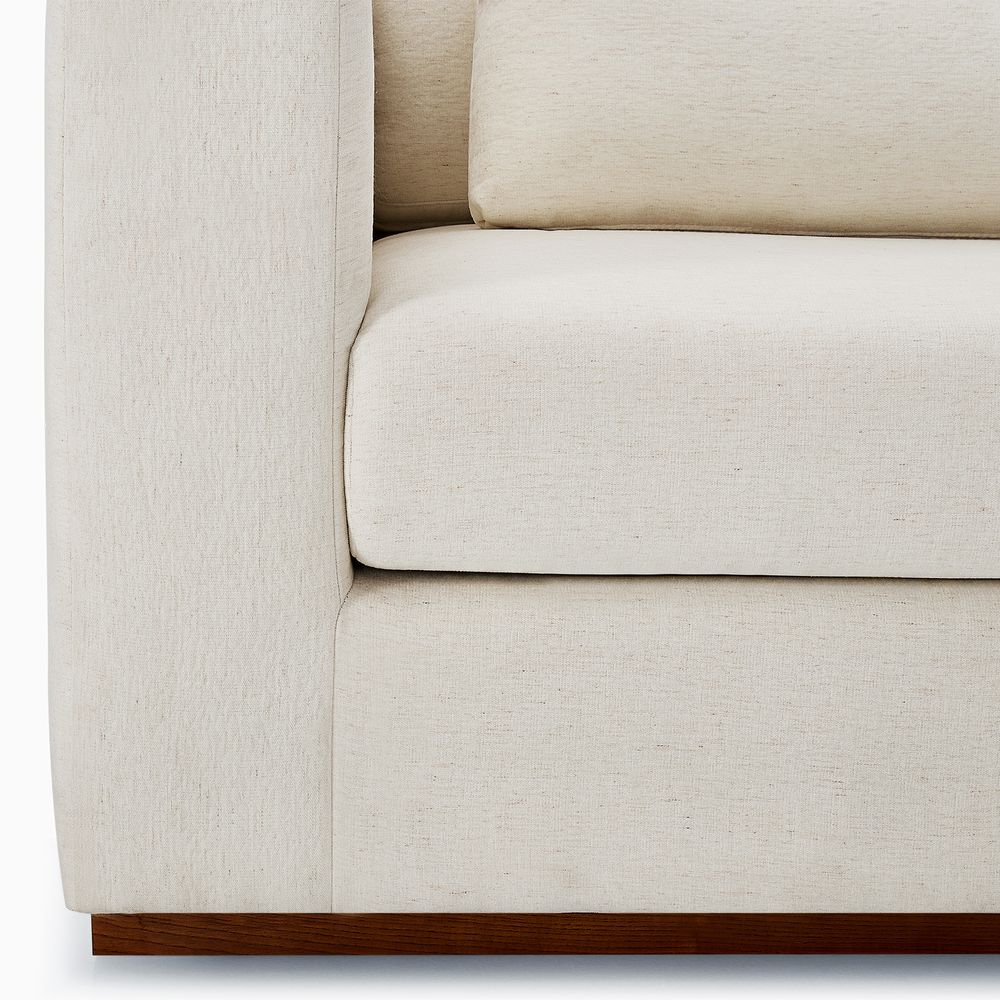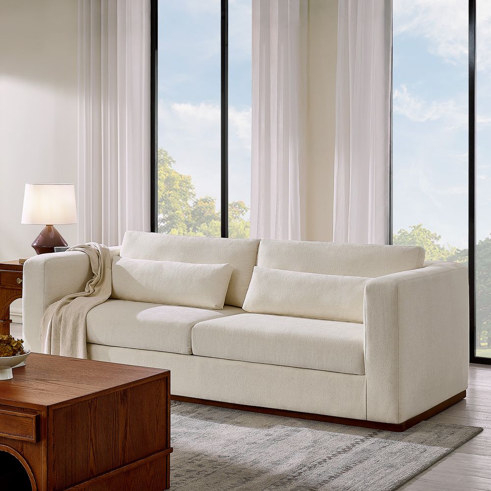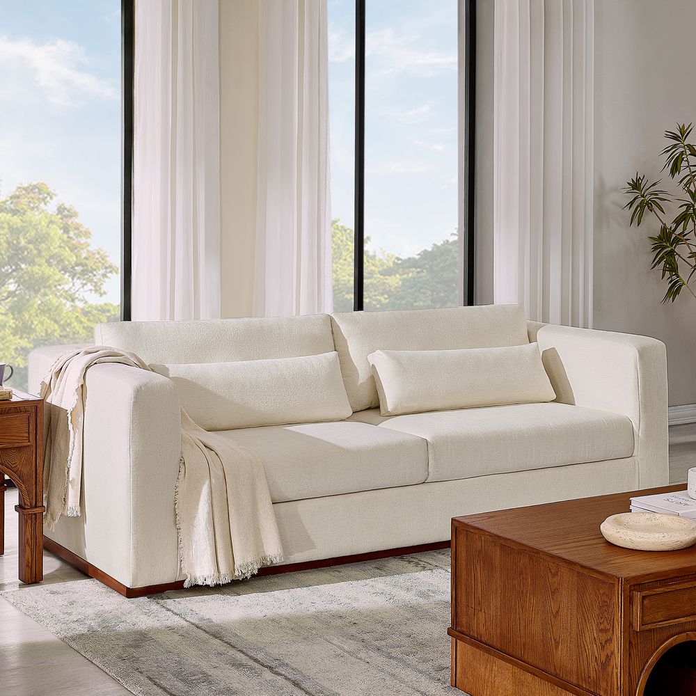 Alba features gently angled cushioning that, paired with extra lumbar pillows, creates a supportive fit. Wide armrests offer generous room to rest and encourage relaxed lounging. Nestled on a solid wood plinth, the sofa introduces a warm wooden touch that completes the neutral palette, giving the piece a clean, current look.