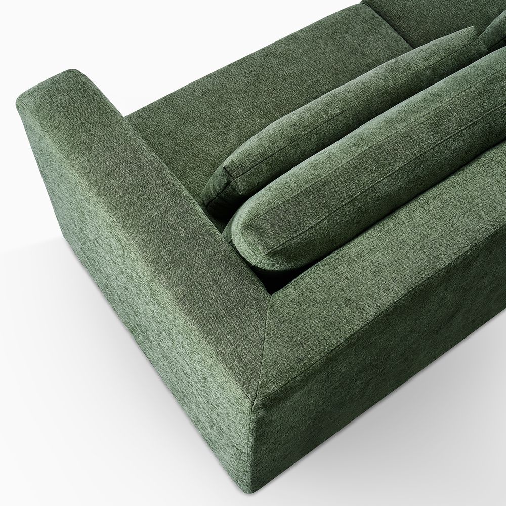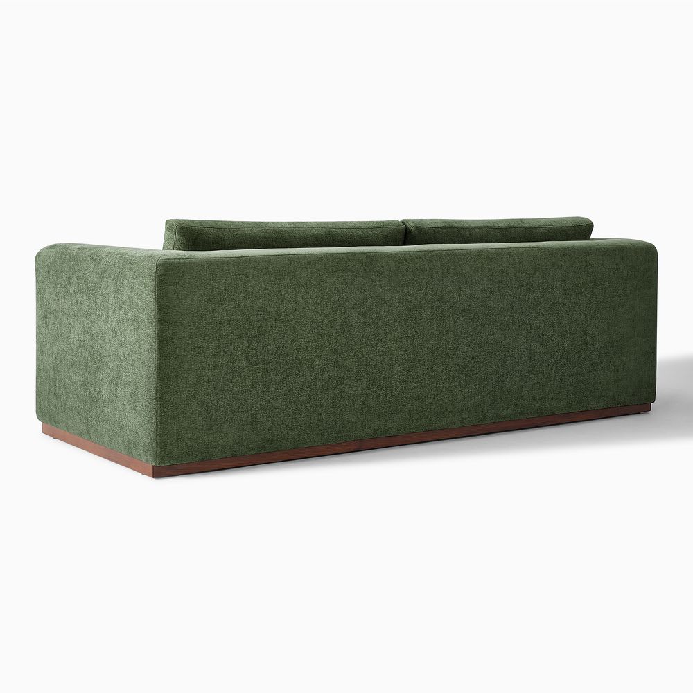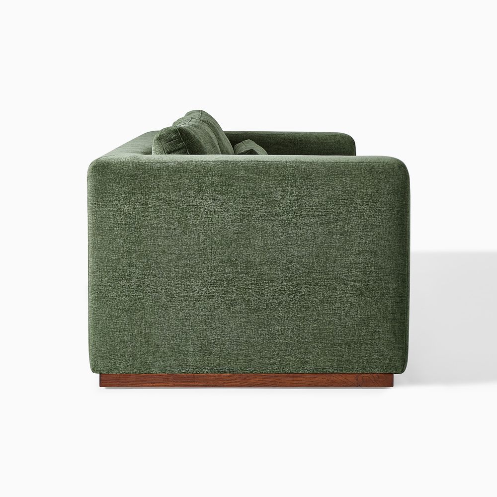 Alba features gently angled cushioning that, paired with extra lumbar pillows, creates a supportive fit. Wide armrests offer generous room to rest and encourage relaxed lounging. Nestled on a solid wood plinth, the sofa introduces a warm wooden touch that completes the neutral palette, giving the piece a clean, current look.
