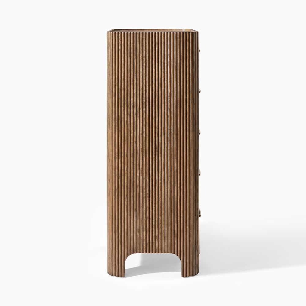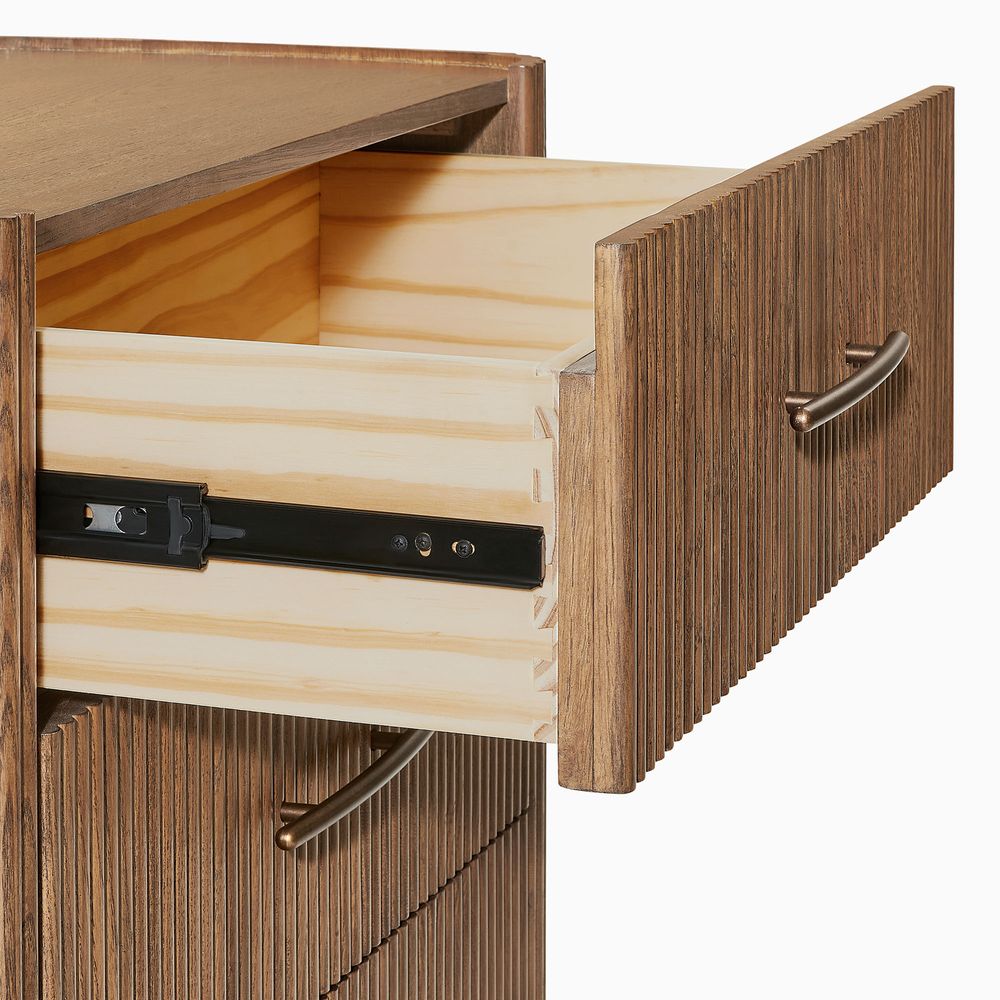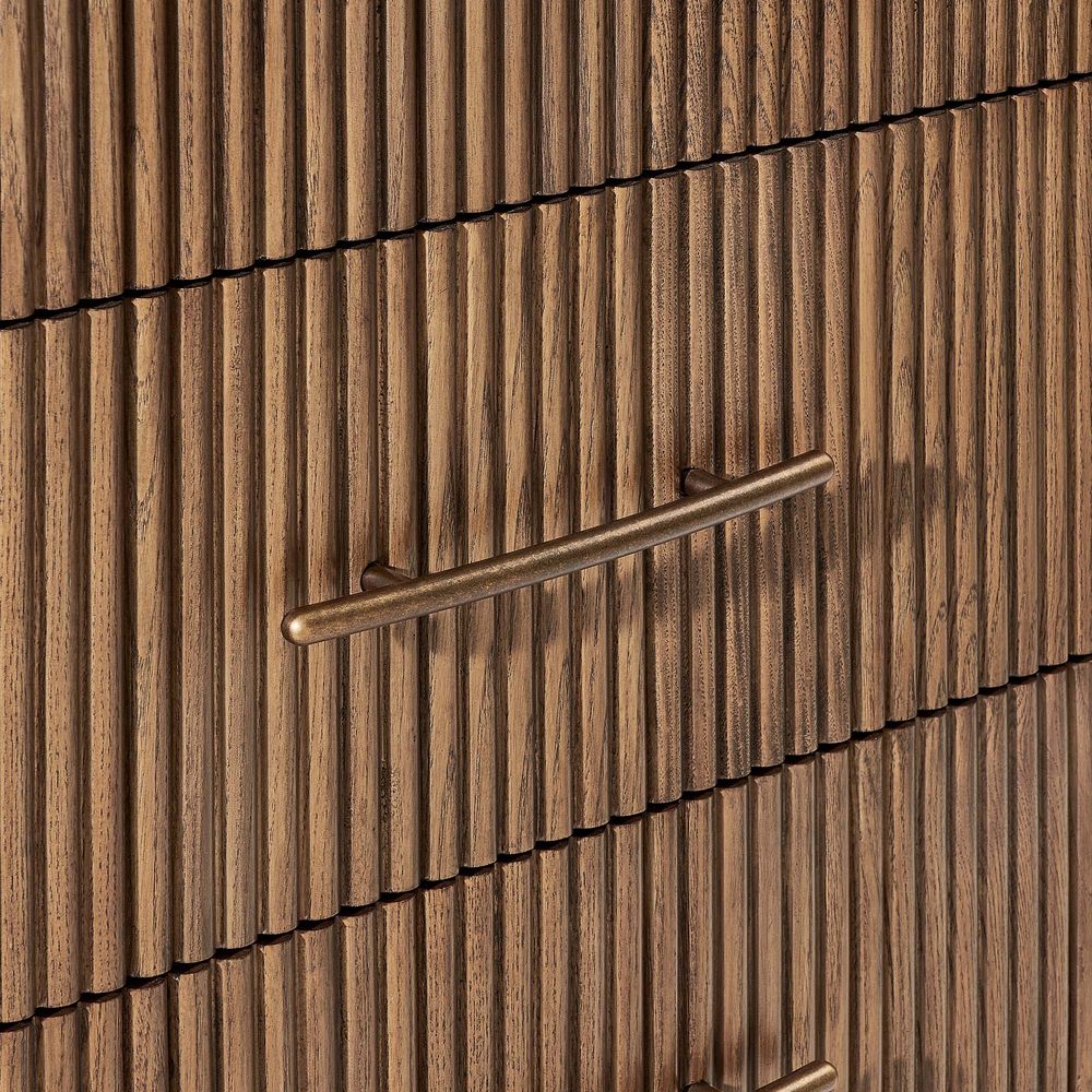 The drawers are accented with slim, transverse metal-tone handles, while the gently recessed top is framed by rounded wood strips. Together, the overall design feels cohesive, effortless, and naturally breezy.