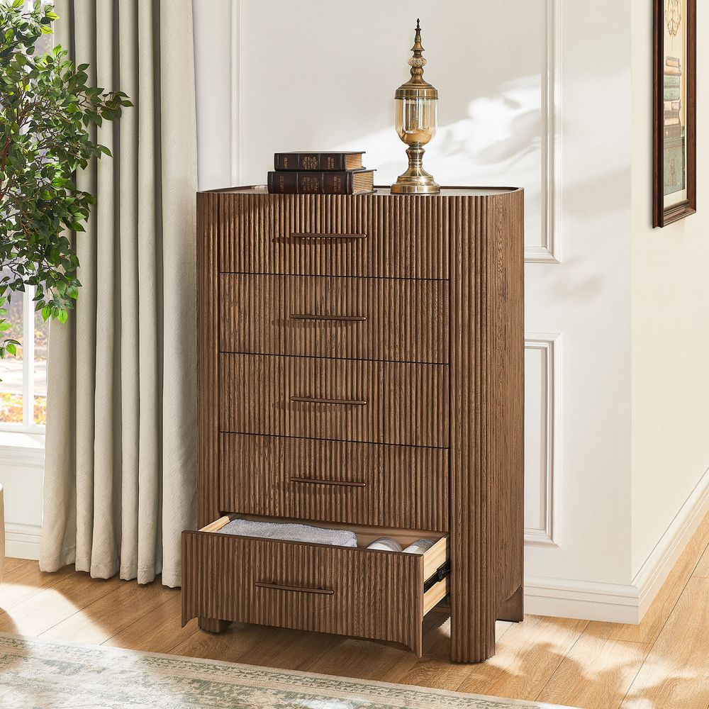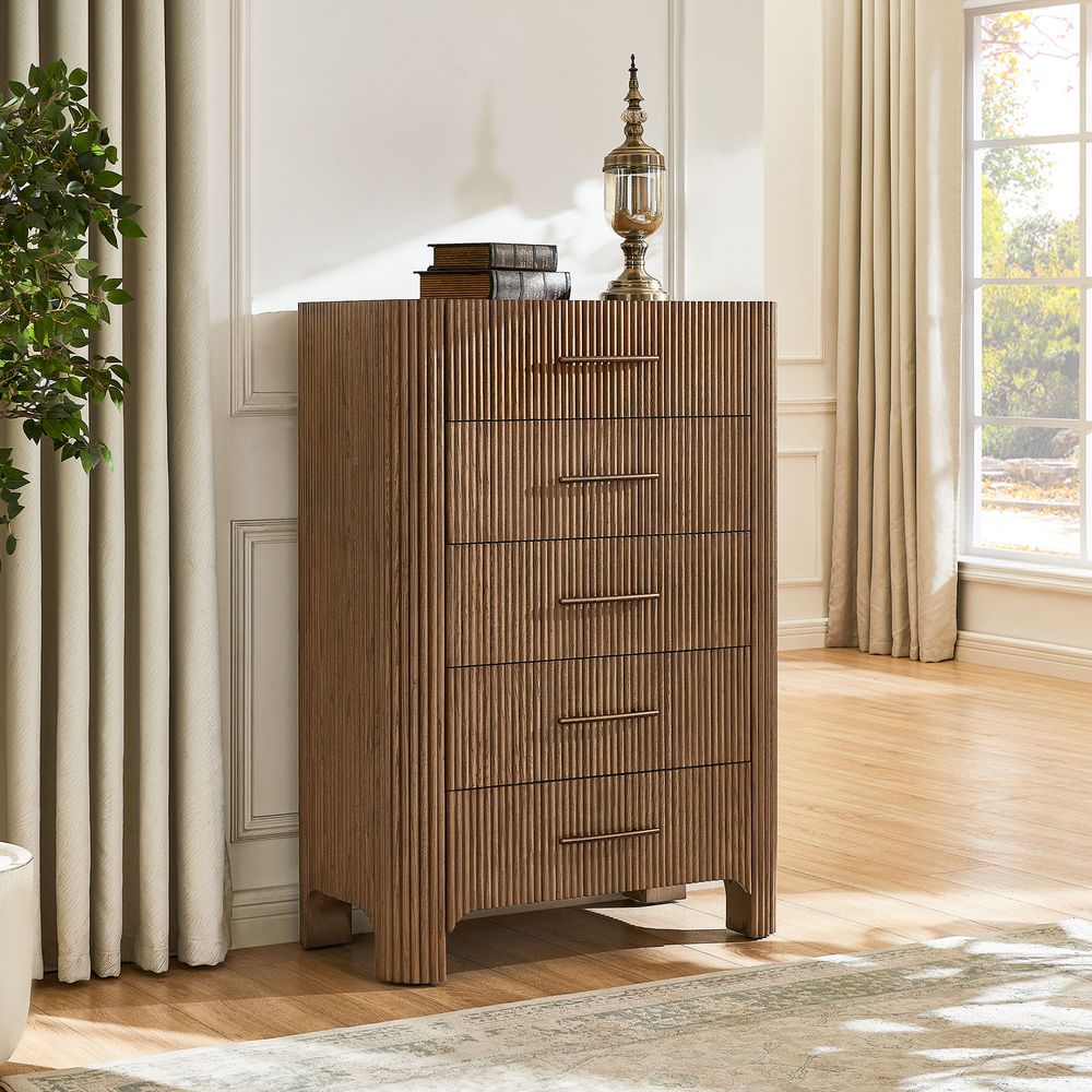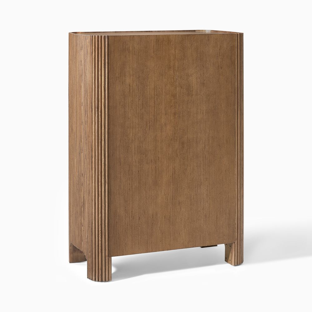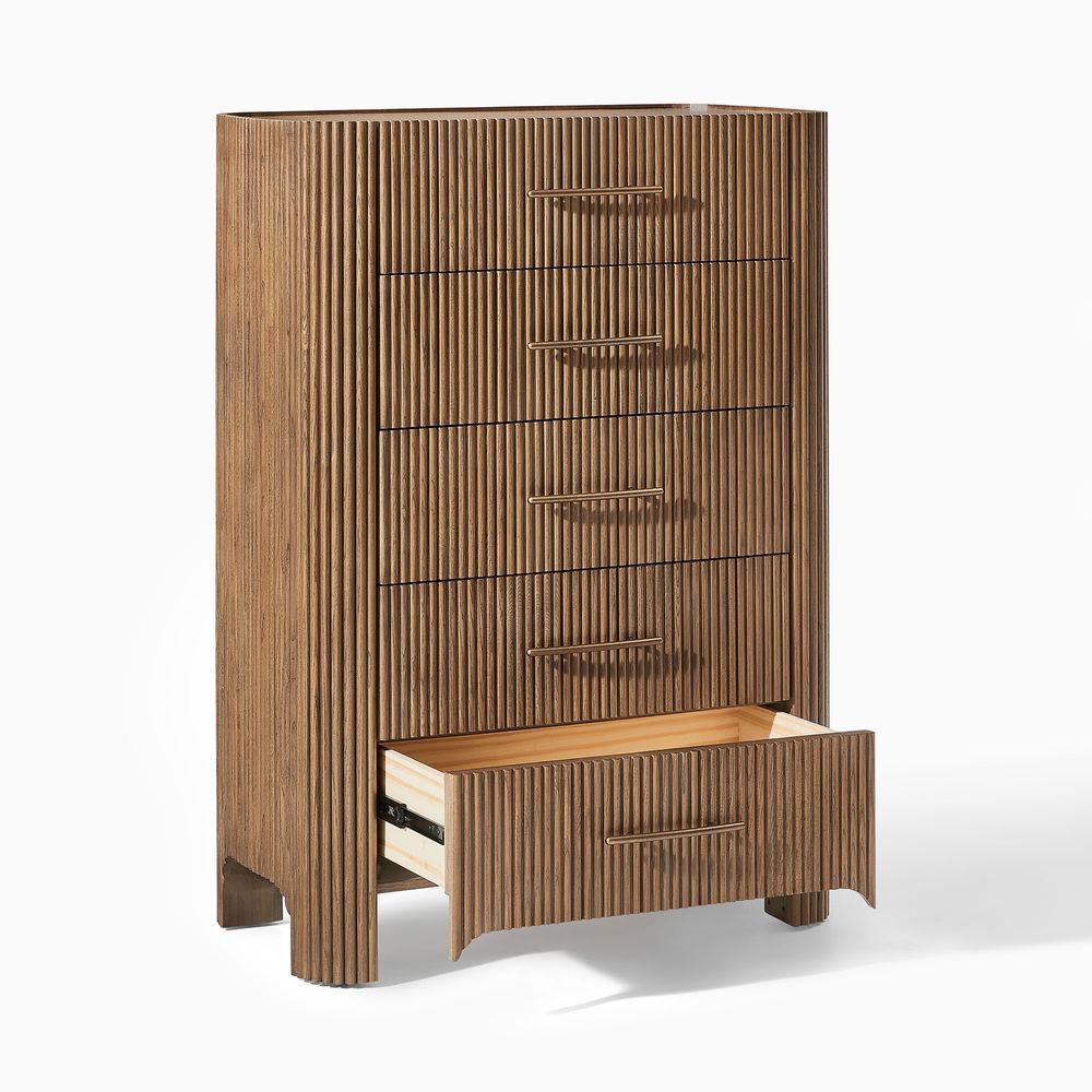 The drawers are accented with slim, transverse metal-tone handles, while the gently recessed top is framed by rounded wood strips. Together, the overall design feels cohesive, effortless, and naturally breezy.