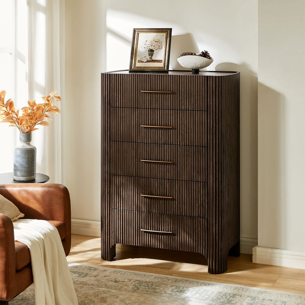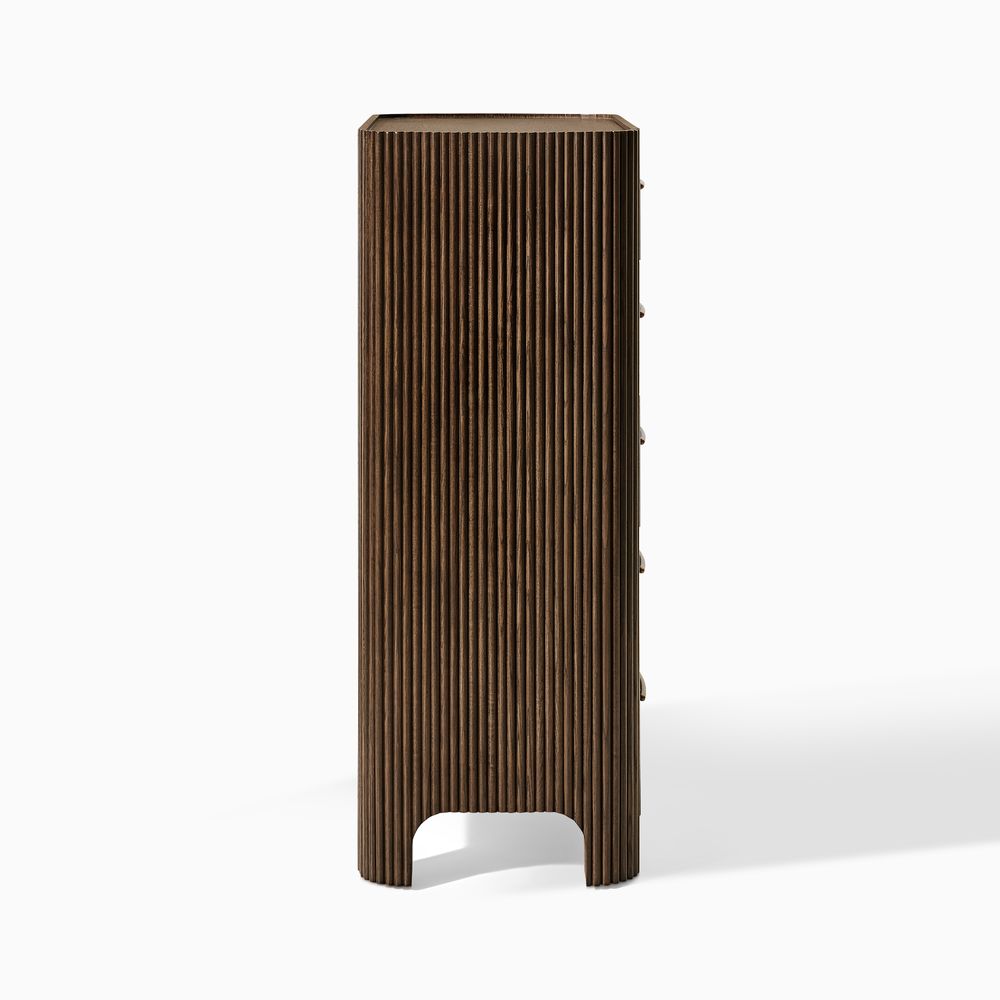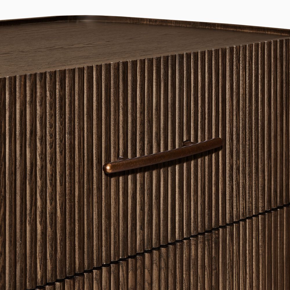 The drawers are accented with slim, transverse metal-tone handles, while the gently recessed top is framed by rounded wood strips. Together, the overall design feels cohesive, effortless, and naturally breezy.
