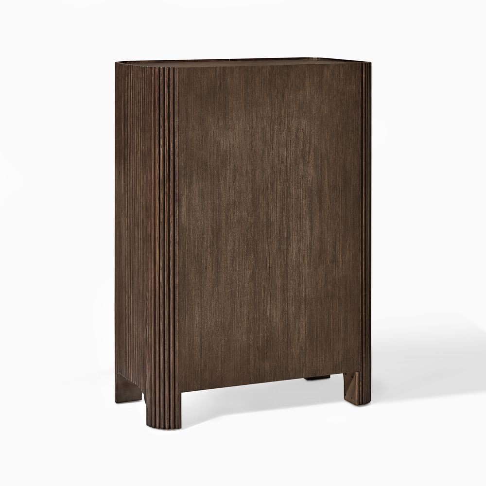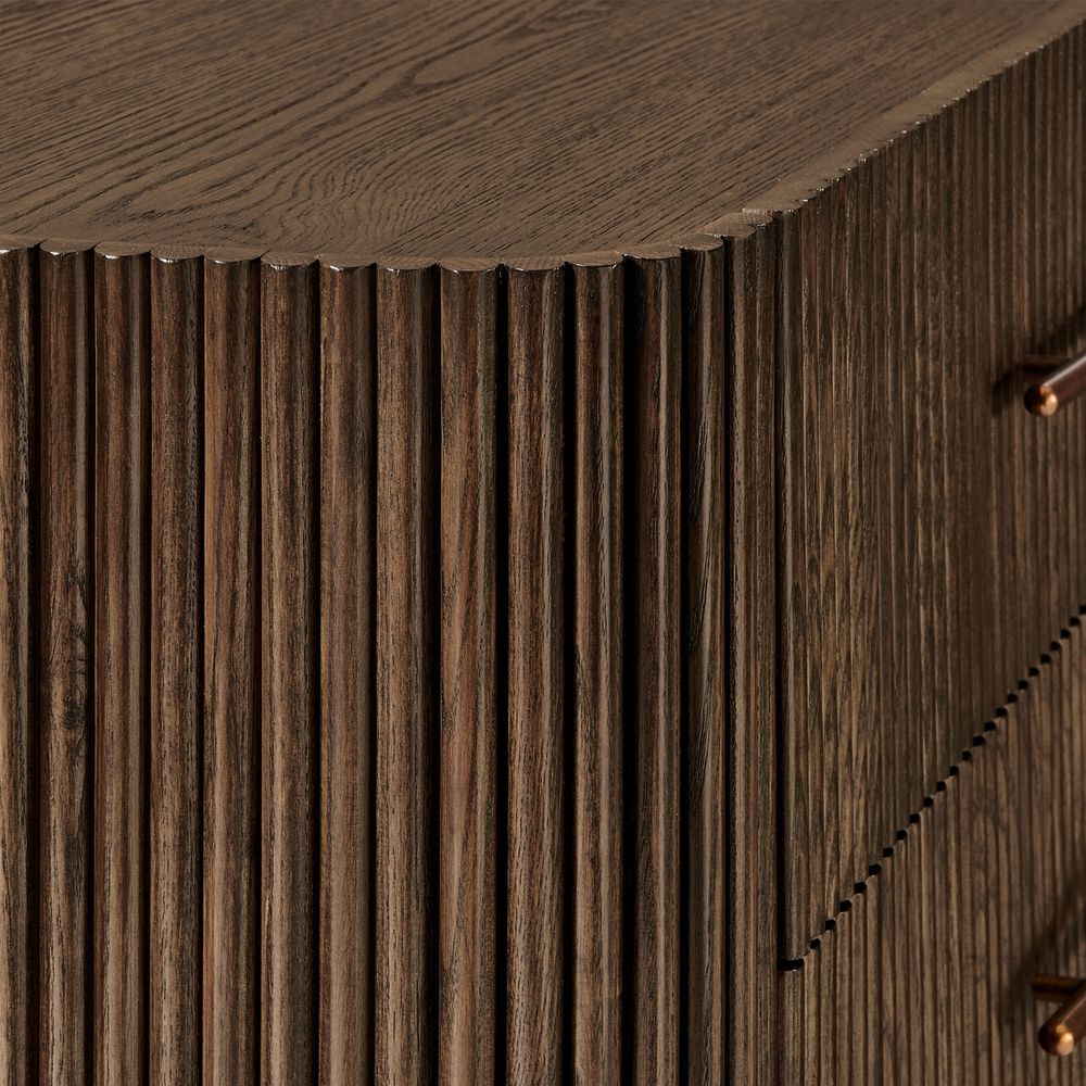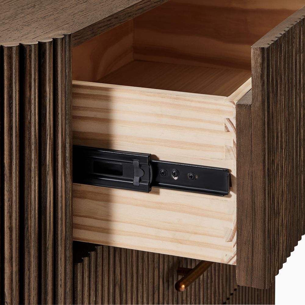 Crafted of American solid ash wood, engineered wood with solid wood veneers.All wood is kiln-dried for added durability.Finish is achieved through multistep process in which wood is wire brushed to highlight its rich grain.Wood glazing adds visual interest with greater depth and layering and enhances coloring.Solid wood blocks are used at structural joints for reinforcement.Drawers are crafted with precision dovetail joints for superior sturdiness and weight-bearing strength.Anti-tip kit hardware (included) is highly recommended to provide protection against tipping of furniture.Color perception may vary due to wood characteristics, lighting, and devices. Wood grain variation is expected, as each is unique.