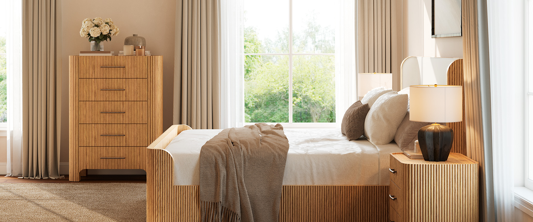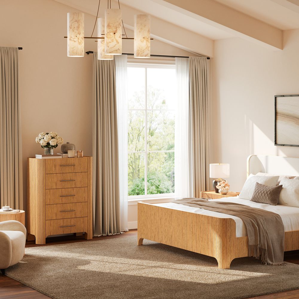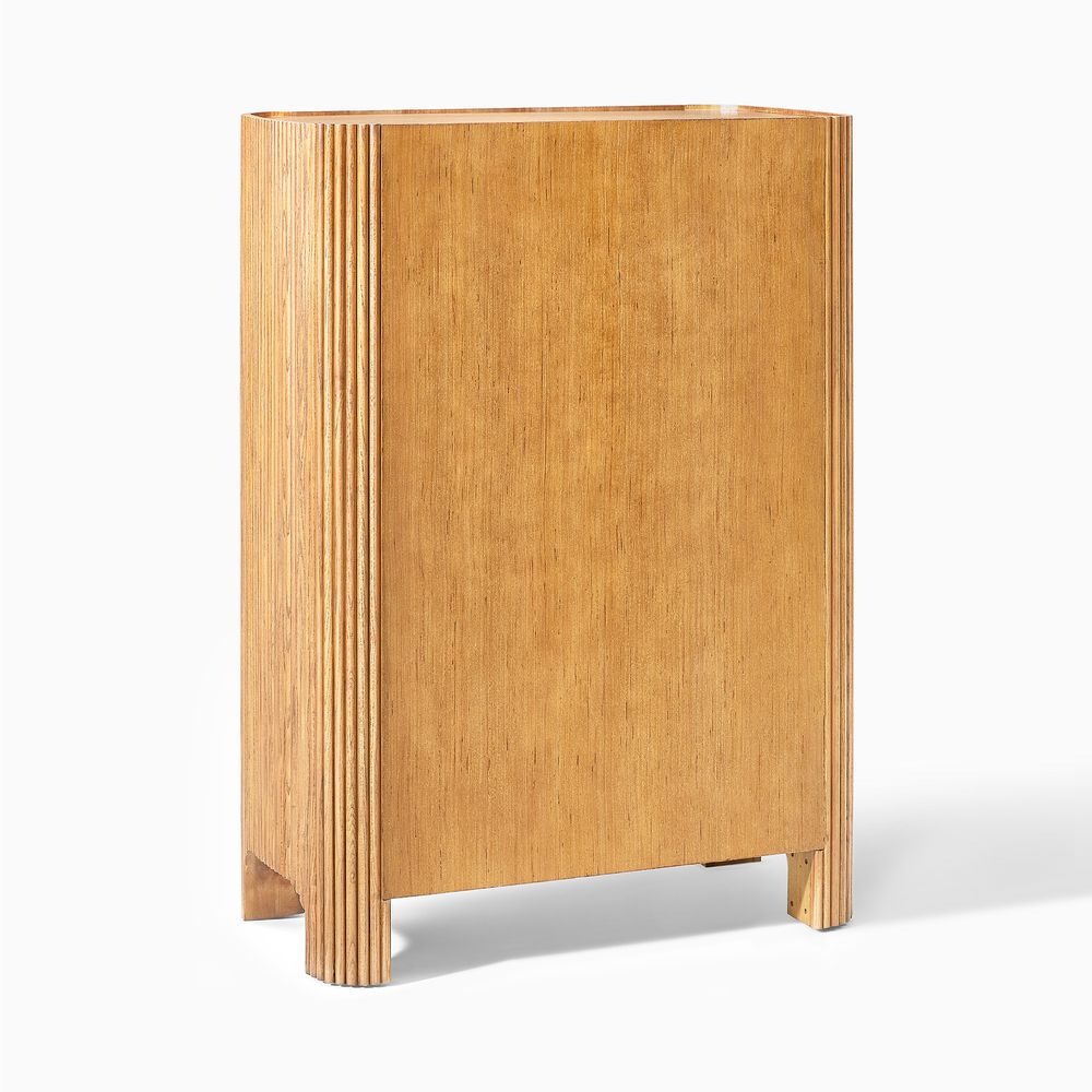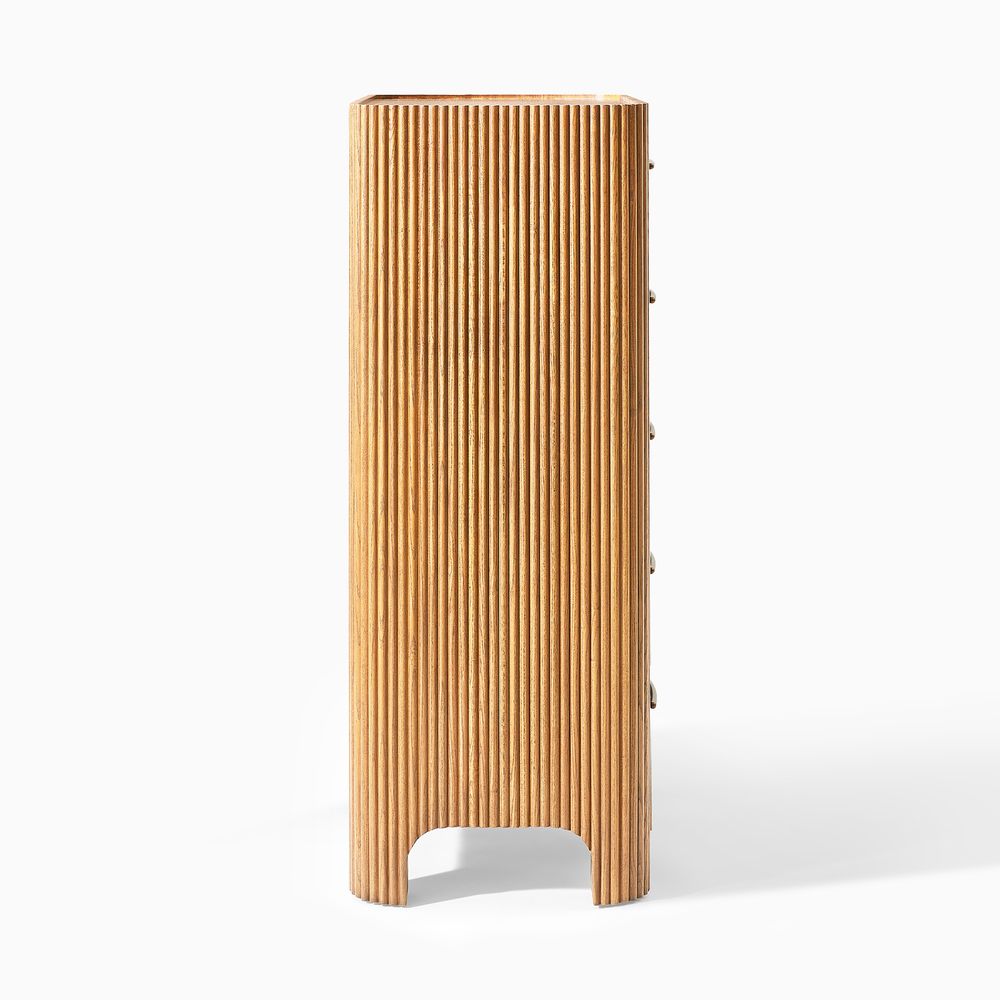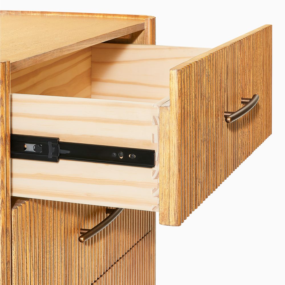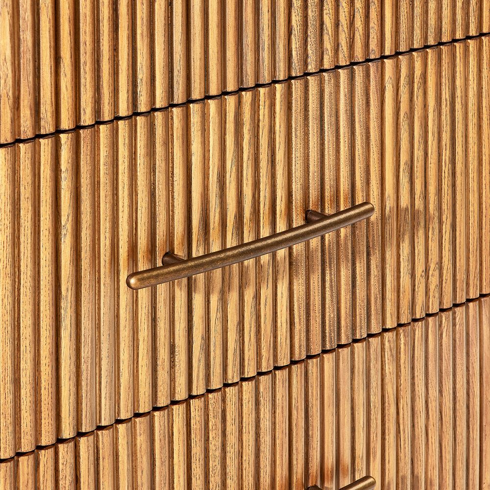 The drawers are accented with slim, transverse metal-tone handles, while the gently recessed top is framed by rounded wood strips. Together, the overall design feels cohesive, effortless, and naturally breezy.
