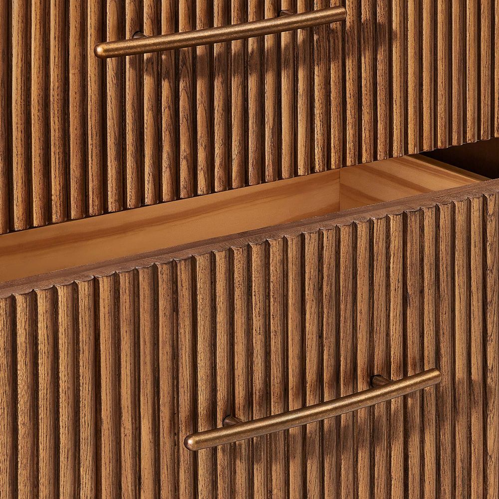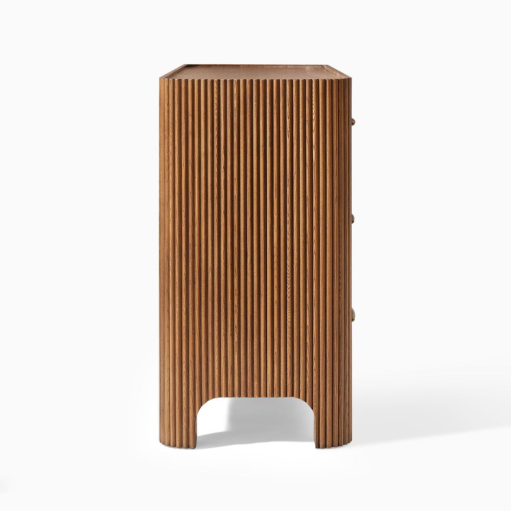 The drawers are accented with slim, transverse metal-tone handles, while the gently recessed top is framed by rounded wood strips. Together, the overall design feels cohesive, effortless, and naturally breezy.