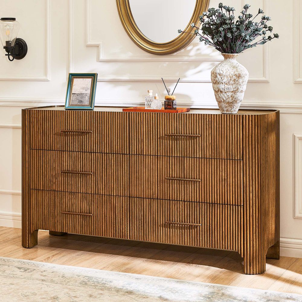 Crafted of American solid ash wood, engineered wood with solid wood veneers.All wood is kiln-dried for added durability.Finish is achieved through multistep process in which wood is wire brushed to highlight its rich grain.Wood glazing adds visual interest with greater depth and layering and enhances coloring.Solid wood blocks are used at structural joints for reinforcement.Drawers are crafted with precision dovetail joints for superior sturdiness and weight-bearing strength.Anti-tip kit hardware (included) is highly recommended to provide protection against tipping of furniture.Color perception may vary due to wood characteristics, lighting, and devices. Wood grain variation is expected, as each is unique.