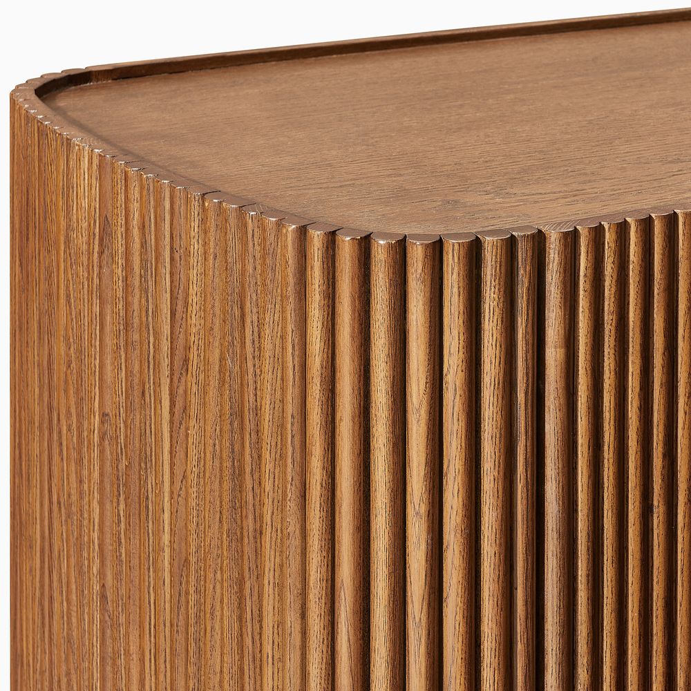 Alexa is defined by organic textures and rounded details. Solid wood strips wrap continuously from the top, along the panels, and down to the legs, with varied lengths that create a fluid, sculpted base curve. Natural variations in wood grain and tone add depth and visual interest throughout the piece.