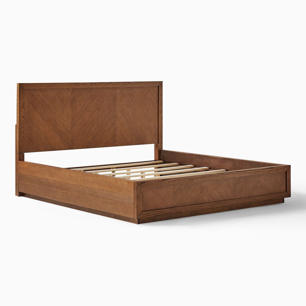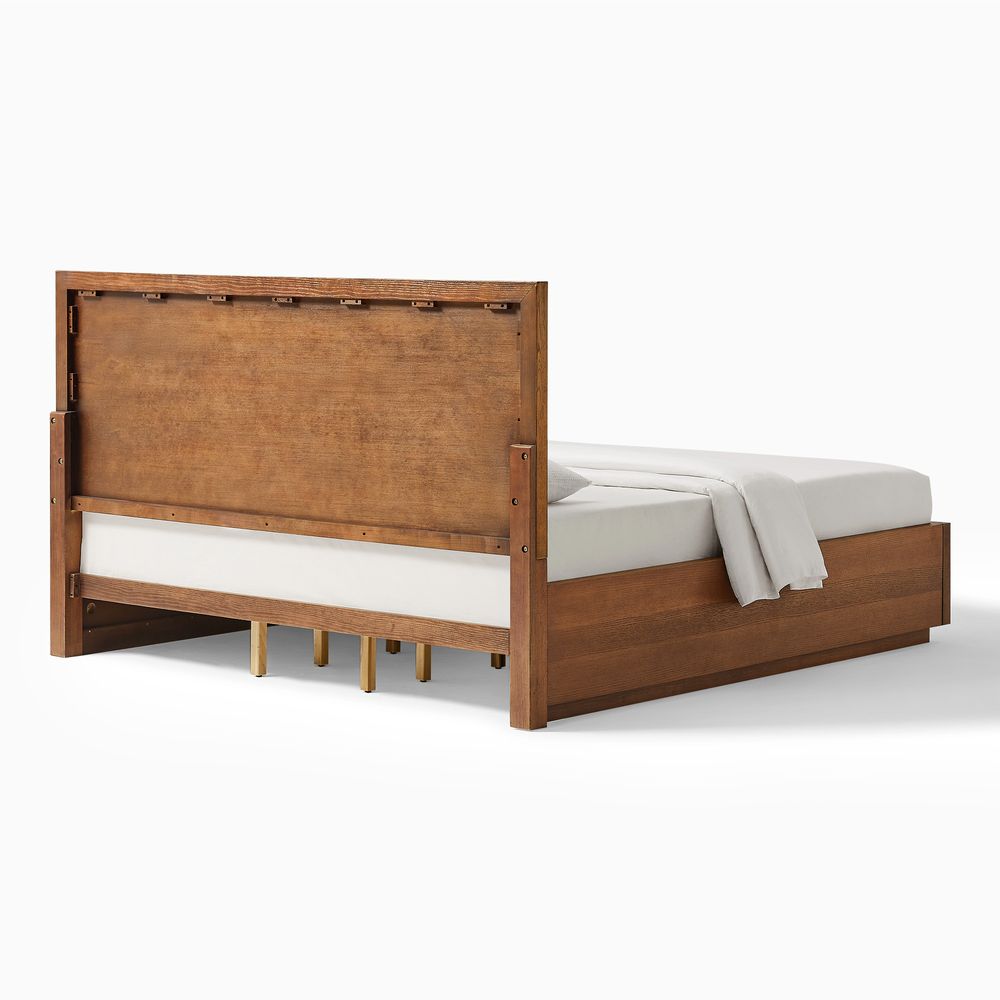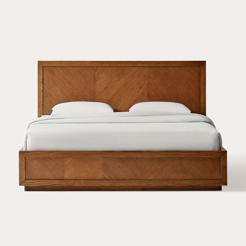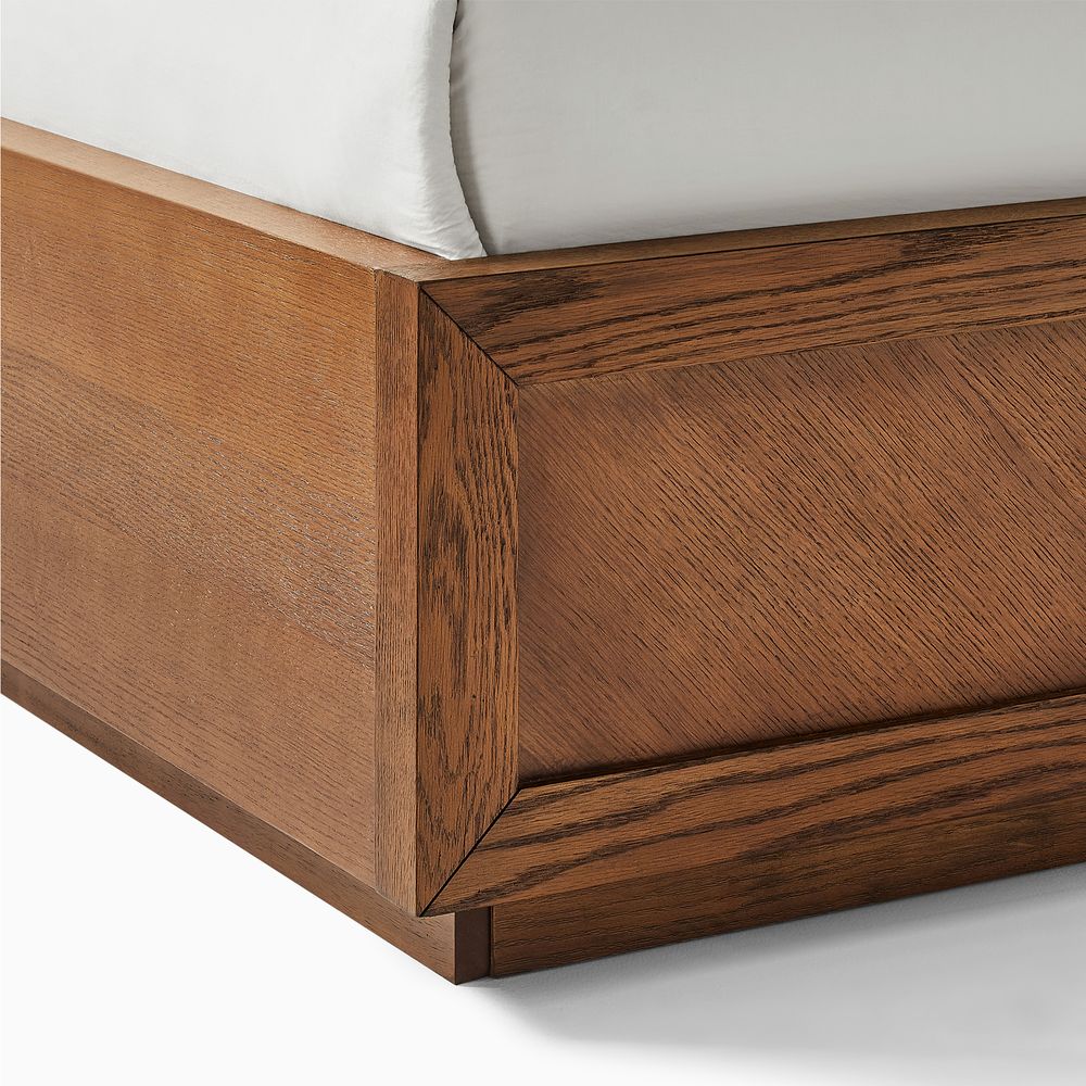Crafted of American solid oak and engineered wood with oak veneers.All wood is kiln-dried for added durability.Finish is achieved through multistep process in which wood is wire brushed to highlight its rich grain.Wood glazing adds visual interest with greater depth and layering and enhances coloring.Include 12 middle support legs.Bed accommodates most standard mattresses, box spring required, supporting up to 800 lbs.Color perception may vary due to wood characteristics, lighting, and devices. Wood grain variation is expected, as each is unique.