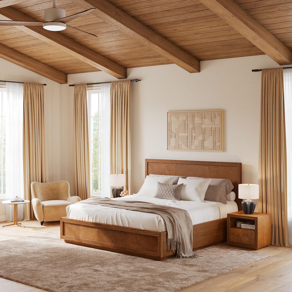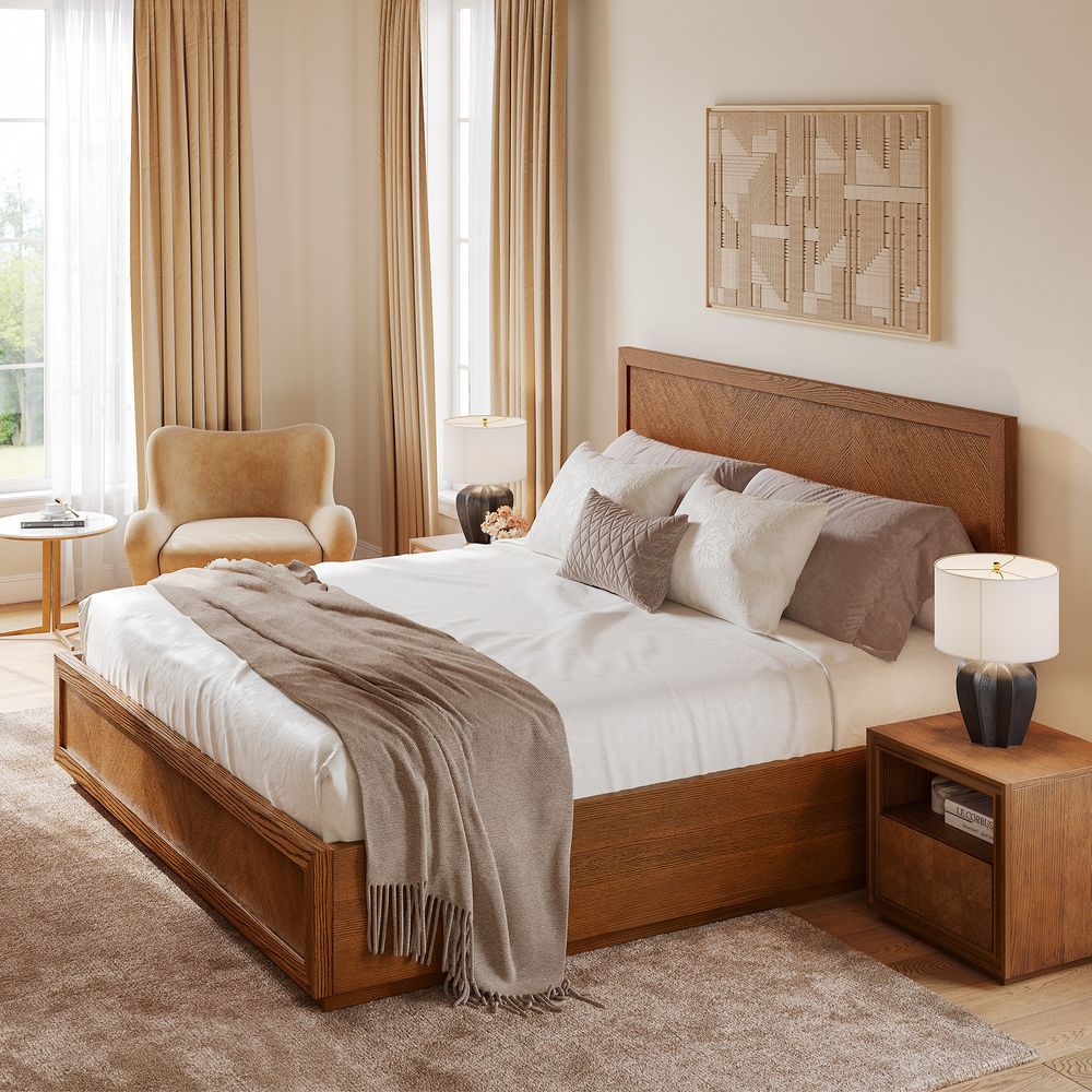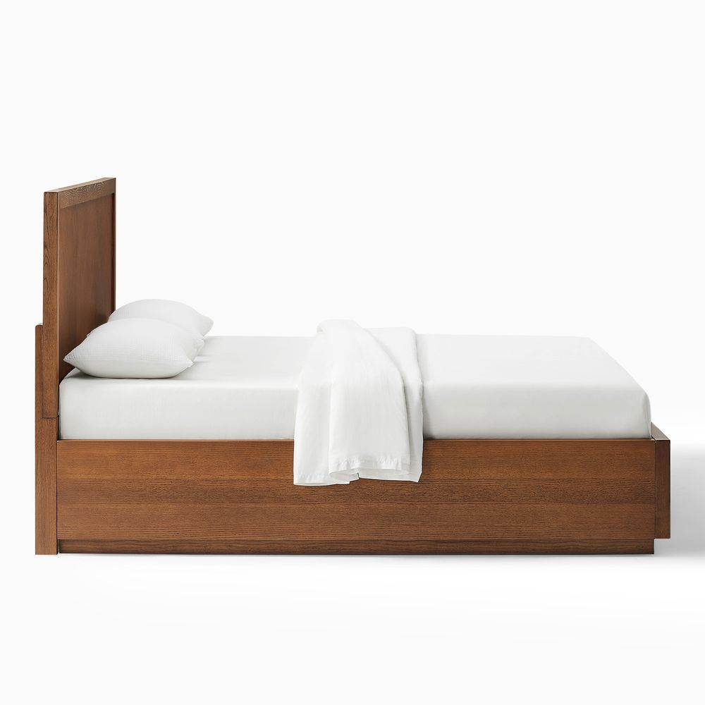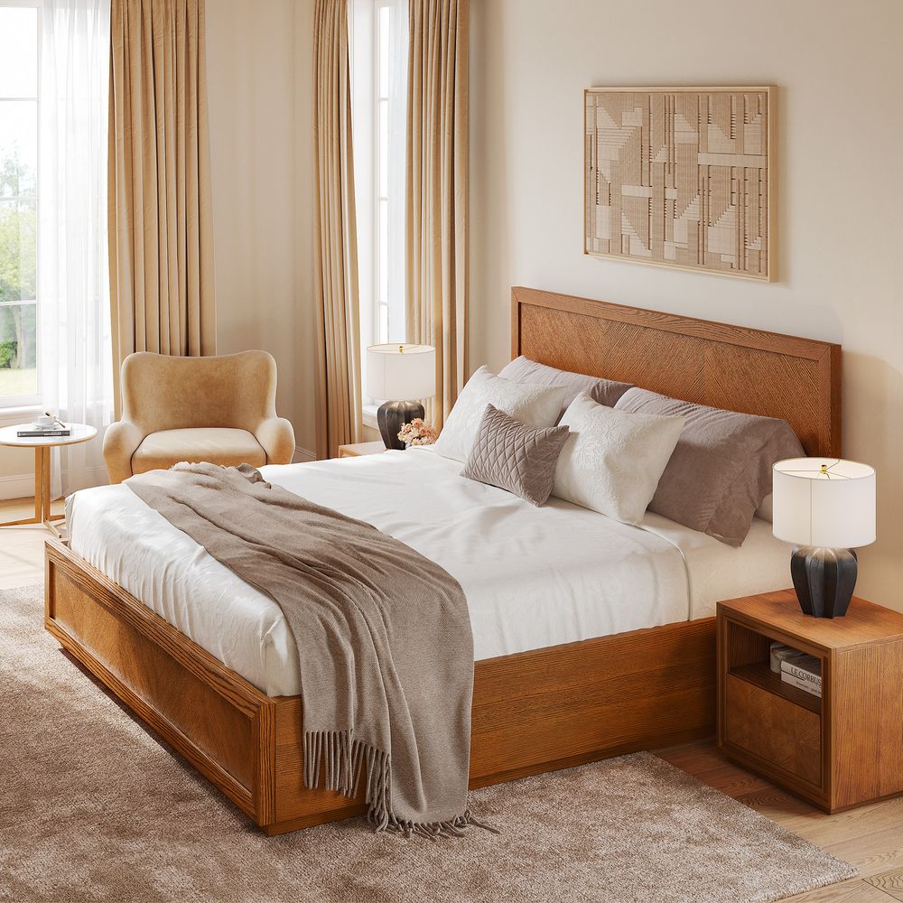Crafted of American solid oak and engineered wood with oak veneers.All wood is kiln-dried for added durability.Finish is achieved through multistep process in which wood is wire brushed to highlight its rich grain.Wood glazing adds visual interest with greater depth and layering and enhances coloring.Include 12 middle support legs.Bed accommodates most standard mattresses, box spring required, supporting up to 800 lbs.Color perception may vary due to wood characteristics, lighting, and devices. Wood grain variation is expected, as each is unique.