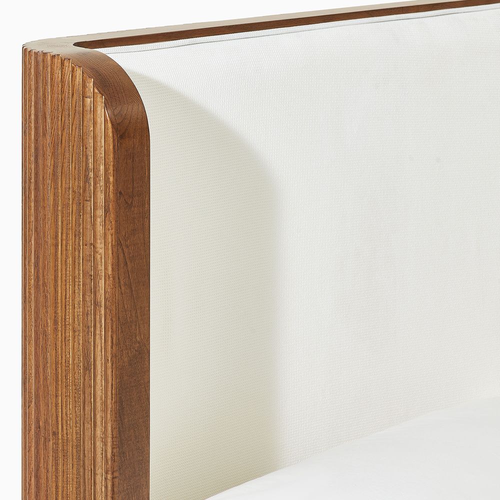 Upholstered headboard adds a soft touch to the warm wood and sheltering curves.