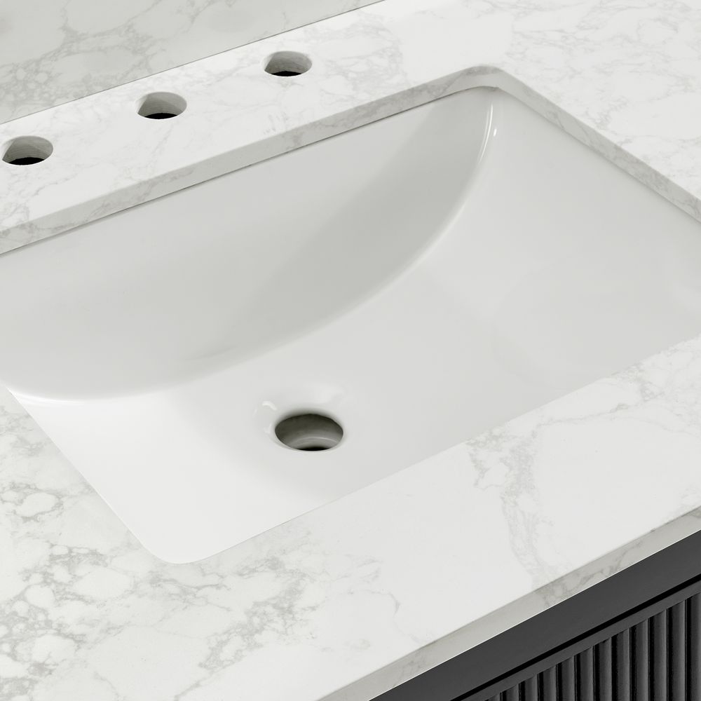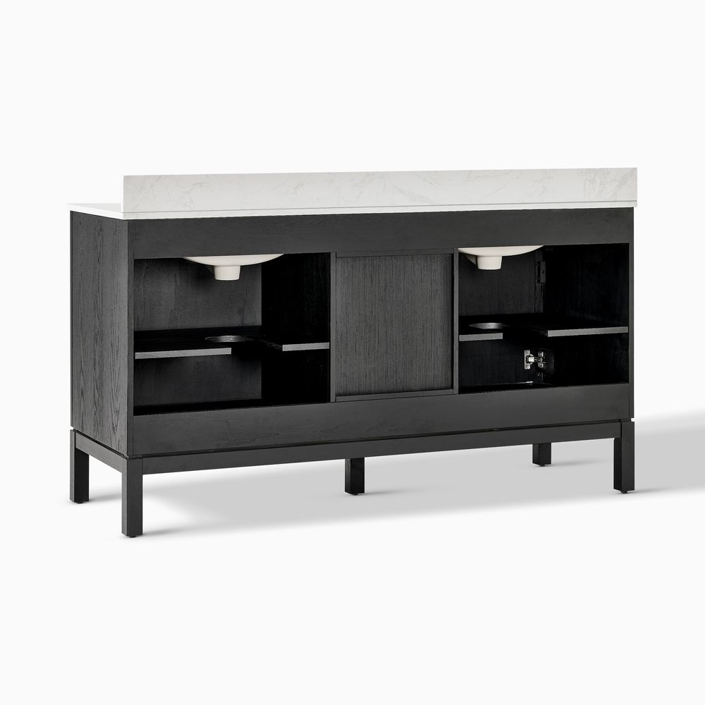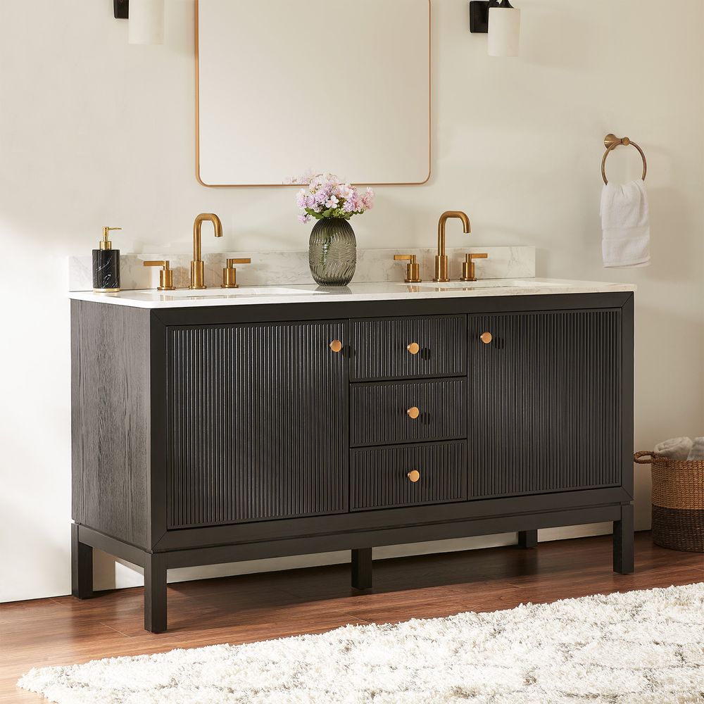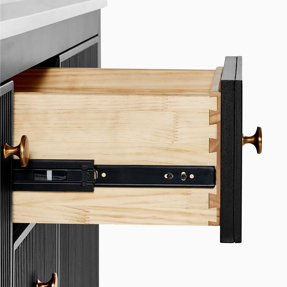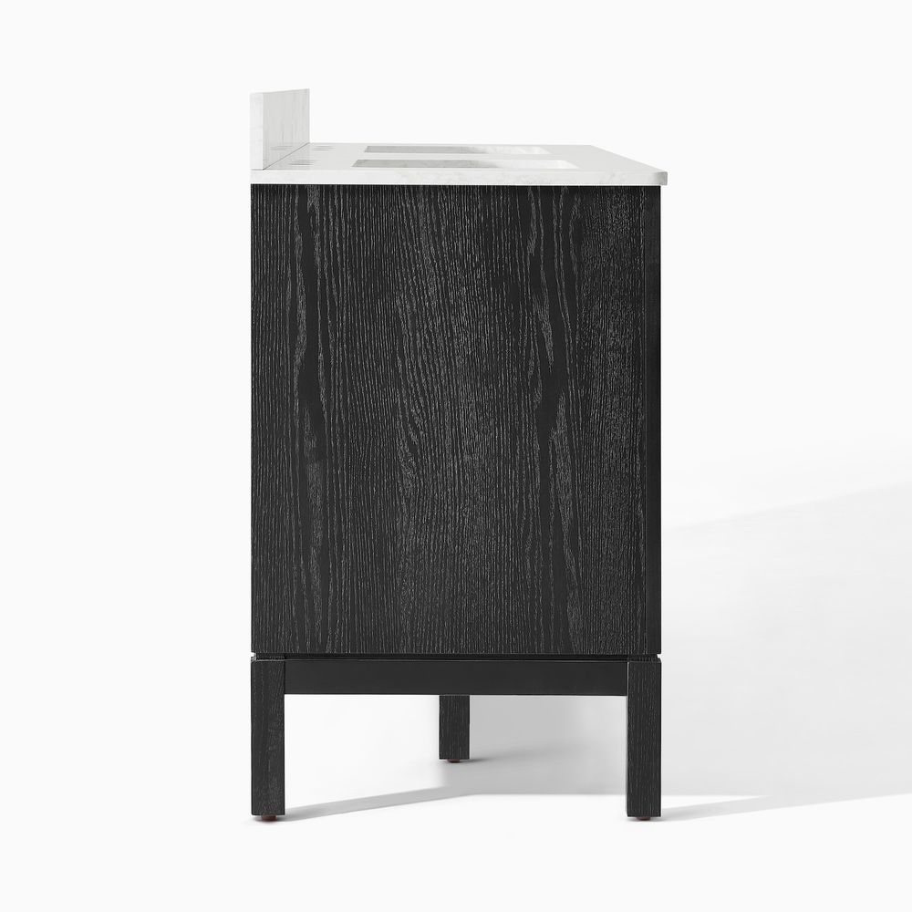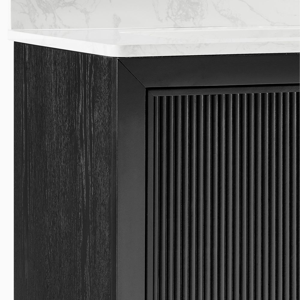 Crafted of cultured marble, solid wood, and plywood with oak veneers.Countertop and backsplash are honed and sealed for a satin finish with deep veining and natural color contrasts.All wood is kiln-dried for added durability.Drawers are crafted with precision dovetail joints for superior sturdiness and weight-bearing strength.Solid wood blocks are used at structural joints for reinforcement.Solid wood fluting presents a natural texture.Color perception may vary due to wood characteristics, lighting, and devices. Wood grain variation is expected, as each is unique.Variation in the veining of stone is to be expected, as each piece will be unique.