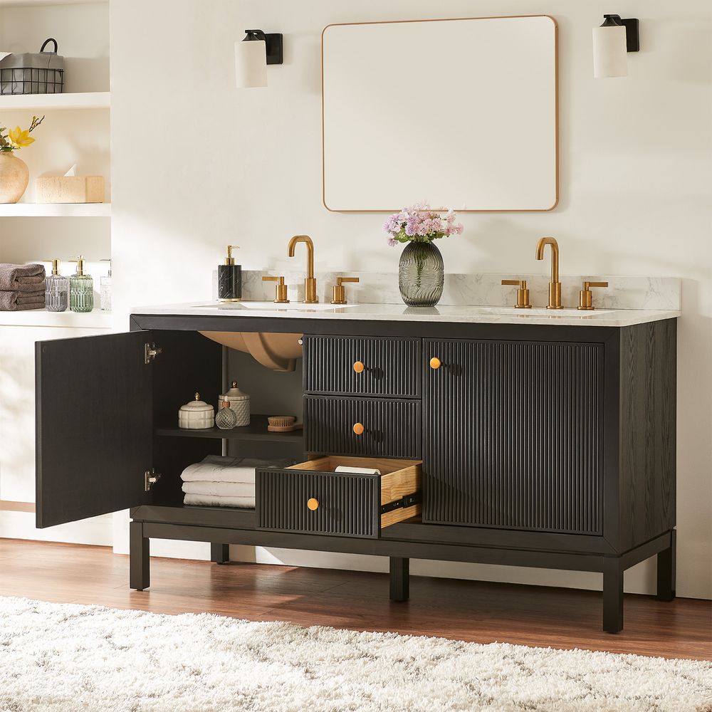 The Alva bathroom vanity exemplifies warm modernity, featuring a textured countertop and solid wood fluting that creates dynamic light and shadow. With two cabinets and three drawers, it offers practical storage while blending the natural character of wood with clean, contemporary design.