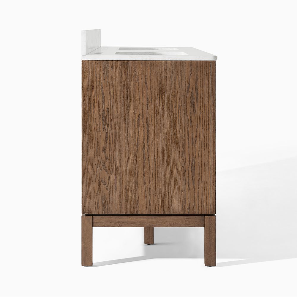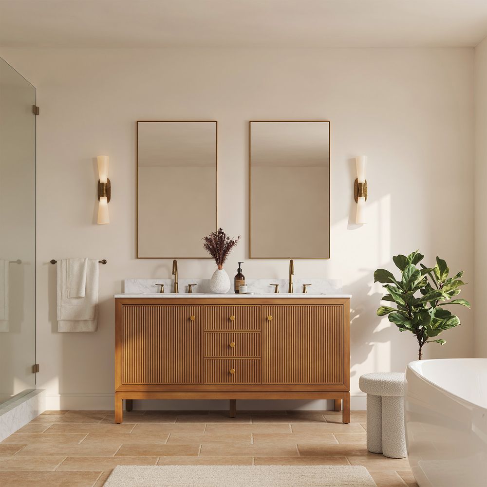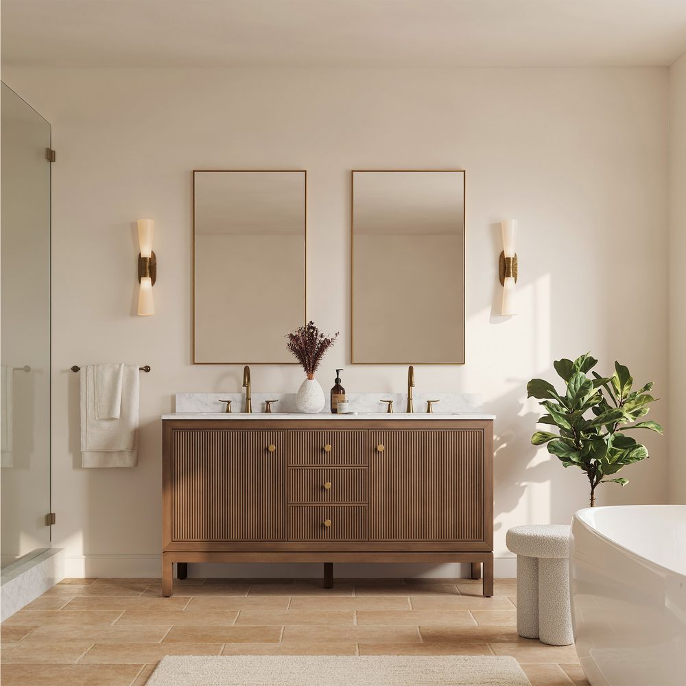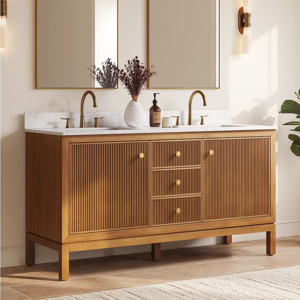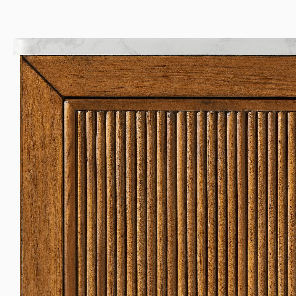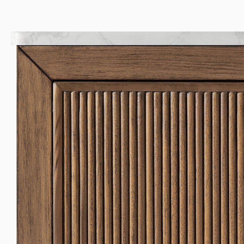 The Alva bathroom vanity exemplifies warm modernity, featuring a textured countertop and solid wood fluting that creates dynamic light and shadow. With two cabinets and three drawers, it offers practical storage while blending the natural character of wood with clean, contemporary design.