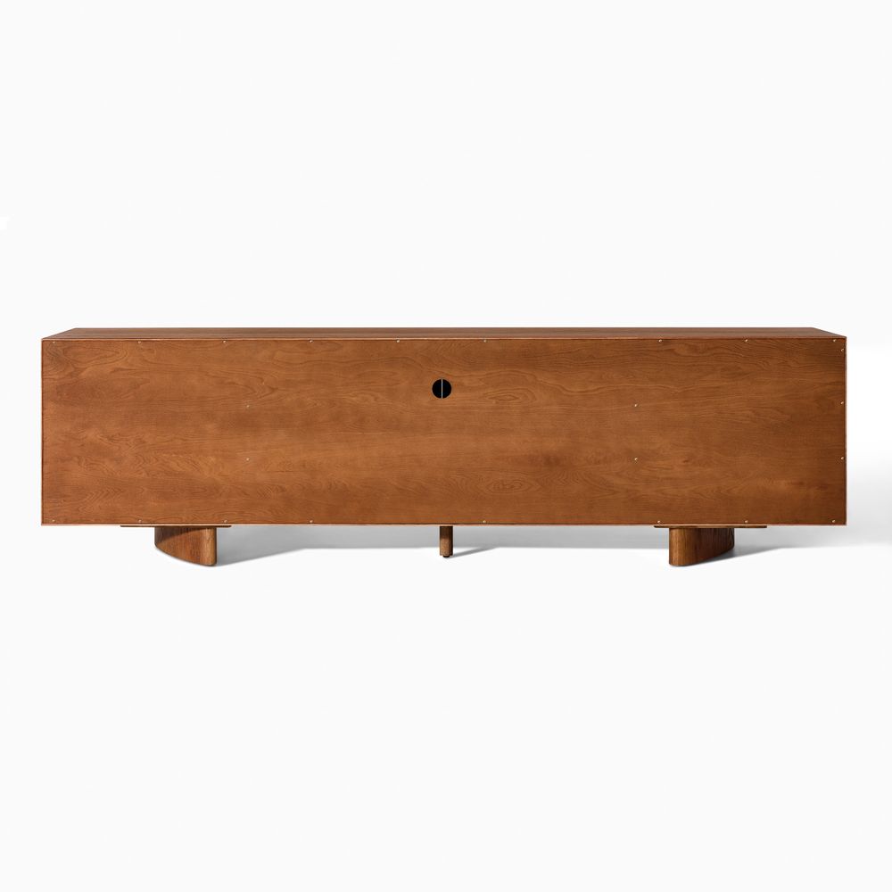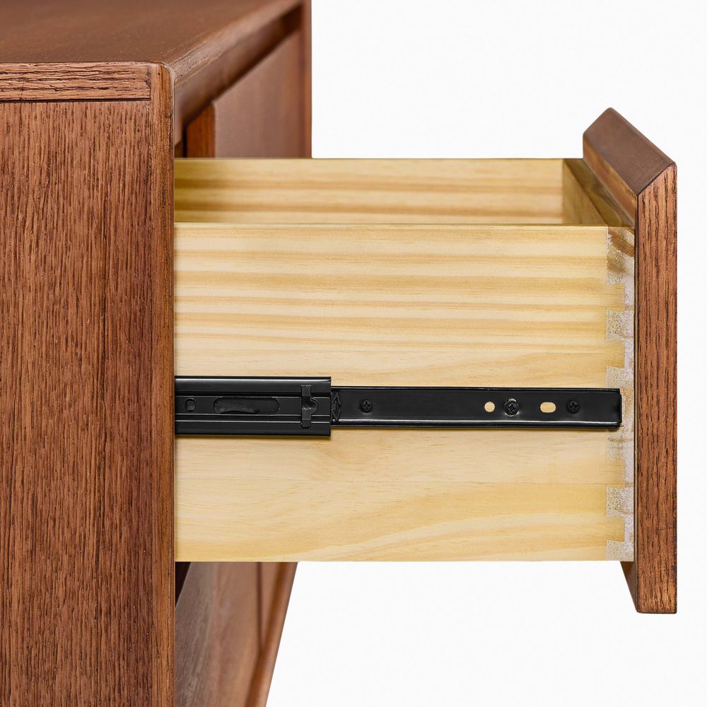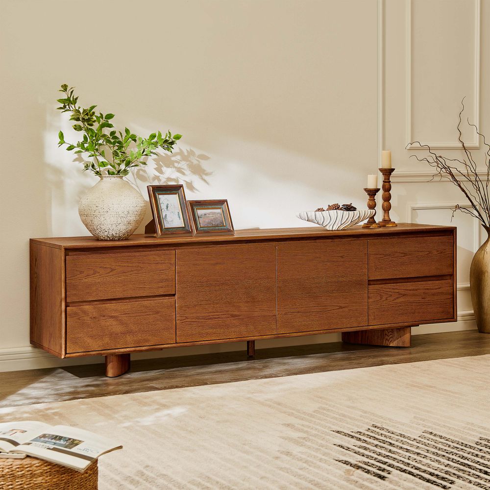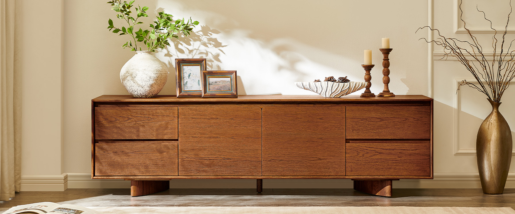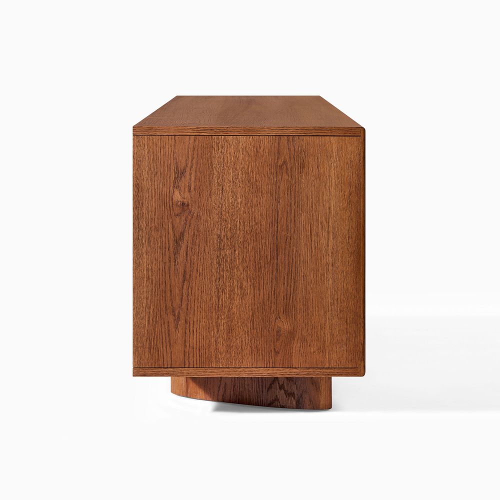 Crafted of American oak and engineered wood with oak veneers.All wood is kiln-dried for added durability.Finish is achieved through multistep process in which wood is wire brushed to highlight its rich grain.Drawers are crafted with precision dovetail joints for superior sturdiness and weight-bearing strength.Solid wood blocks are used at structural joints for reinforcement.Designed for TVs up to 85", 1 cord cutout in back panel for cable management.Color perception may vary due to wood characteristics, lighting, and devices. Wood grain variation is expected, as each is unique.