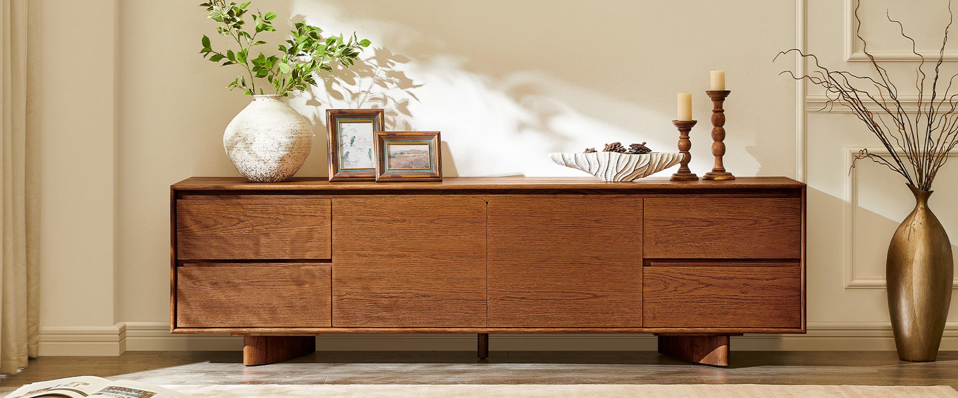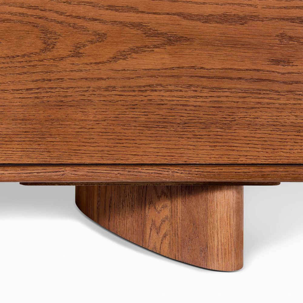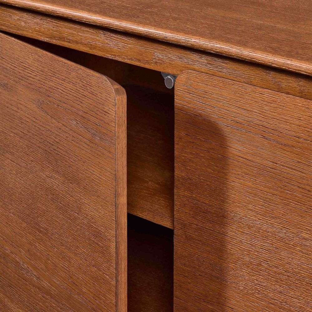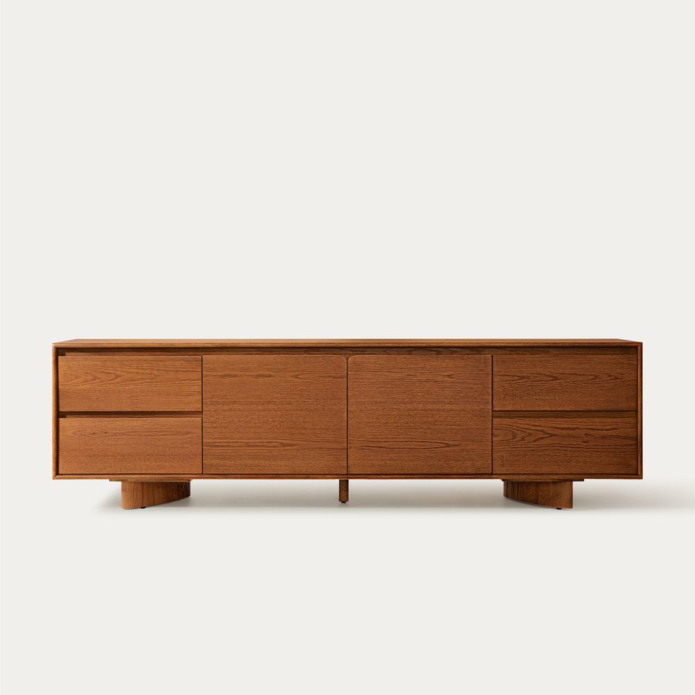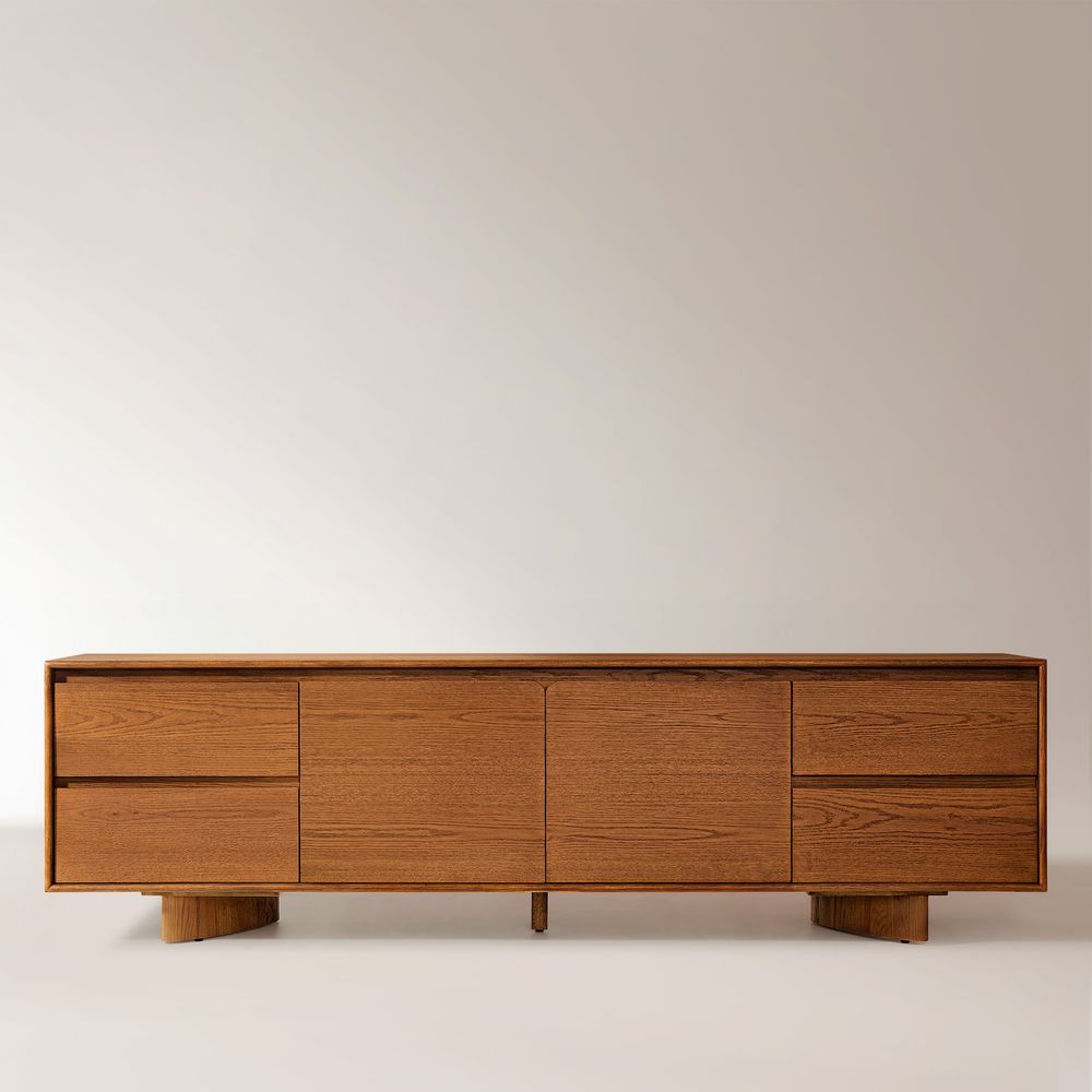 Anton media console features a distinctive splayed leg design, crafted with engineered wood over oak veneer. Its rich, warm finish highlights the natural grain, adding depth and sophistication. With ample storage provided by its sleek drawers and cabinets, it offers both functionality and style.