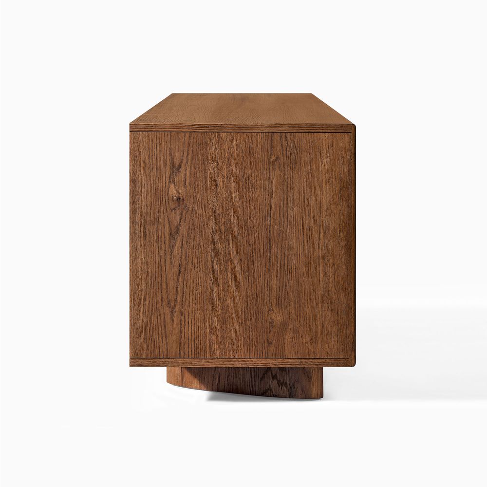 Crafted of American oak and engineered wood with oak veneers.All wood is kiln-dried for added durability.Finish is achieved through multistep process in which wood is wire brushed to highlight its rich grain.Drawers are crafted with precision dovetail joints for superior sturdiness and weight-bearing strength.Solid wood blocks are used at structural joints for reinforcement.Designed for TVs up to 85", 1 cord cutout in back panel for cable management.Color perception may vary due to wood characteristics, lighting, and devices. Wood grain variation is expected, as each is unique.