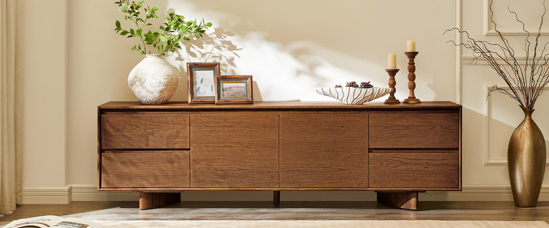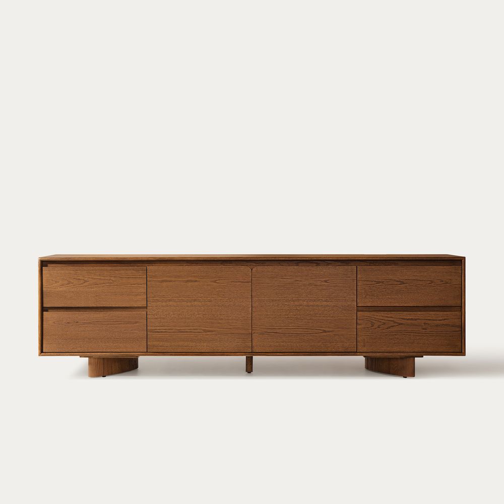 Anton media console features a distinctive splayed leg design, crafted with engineered wood over oak veneer. Its rich, warm finish highlights the natural grain, adding depth and sophistication. With ample storage provided by its sleek drawers and cabinets, it offers both functionality and style.